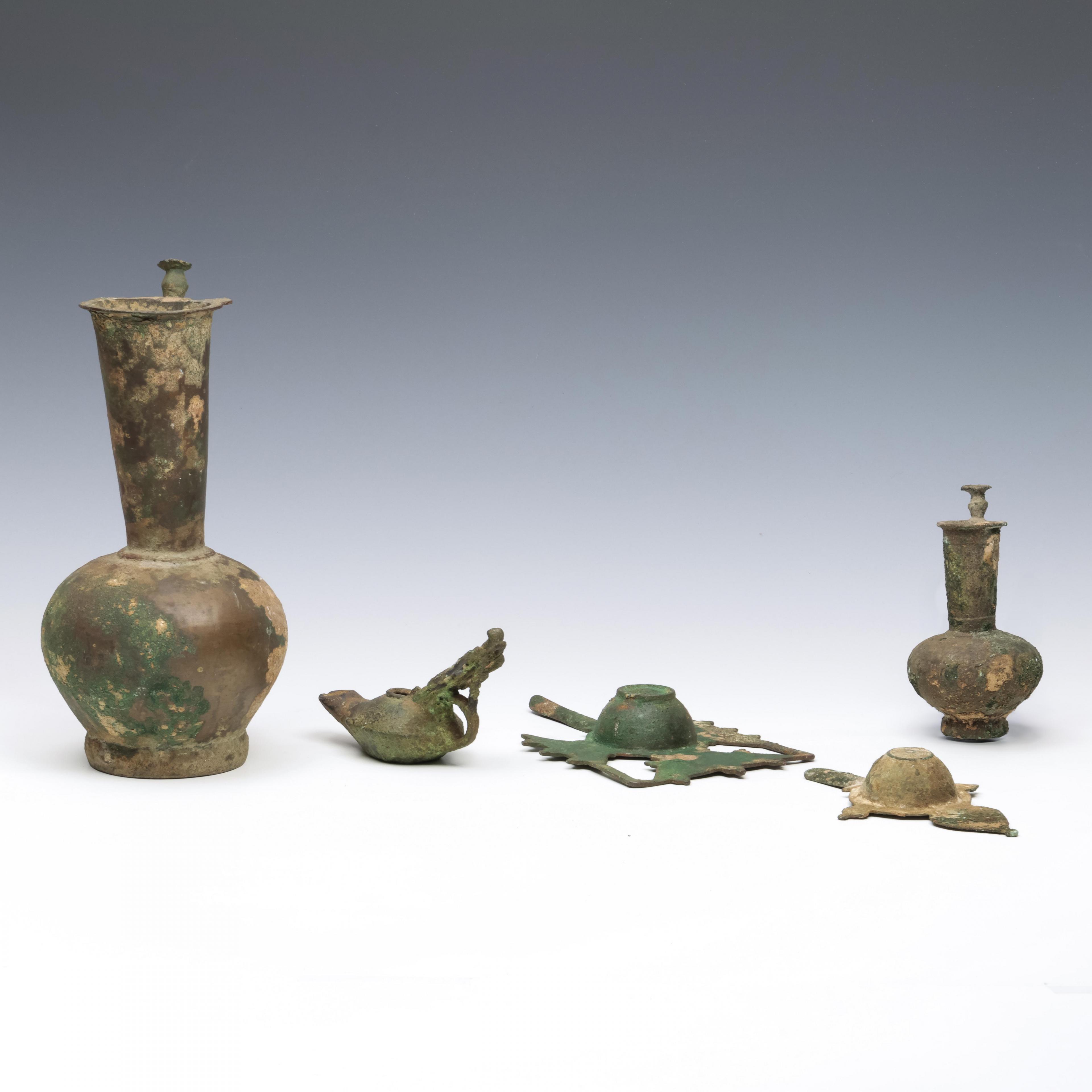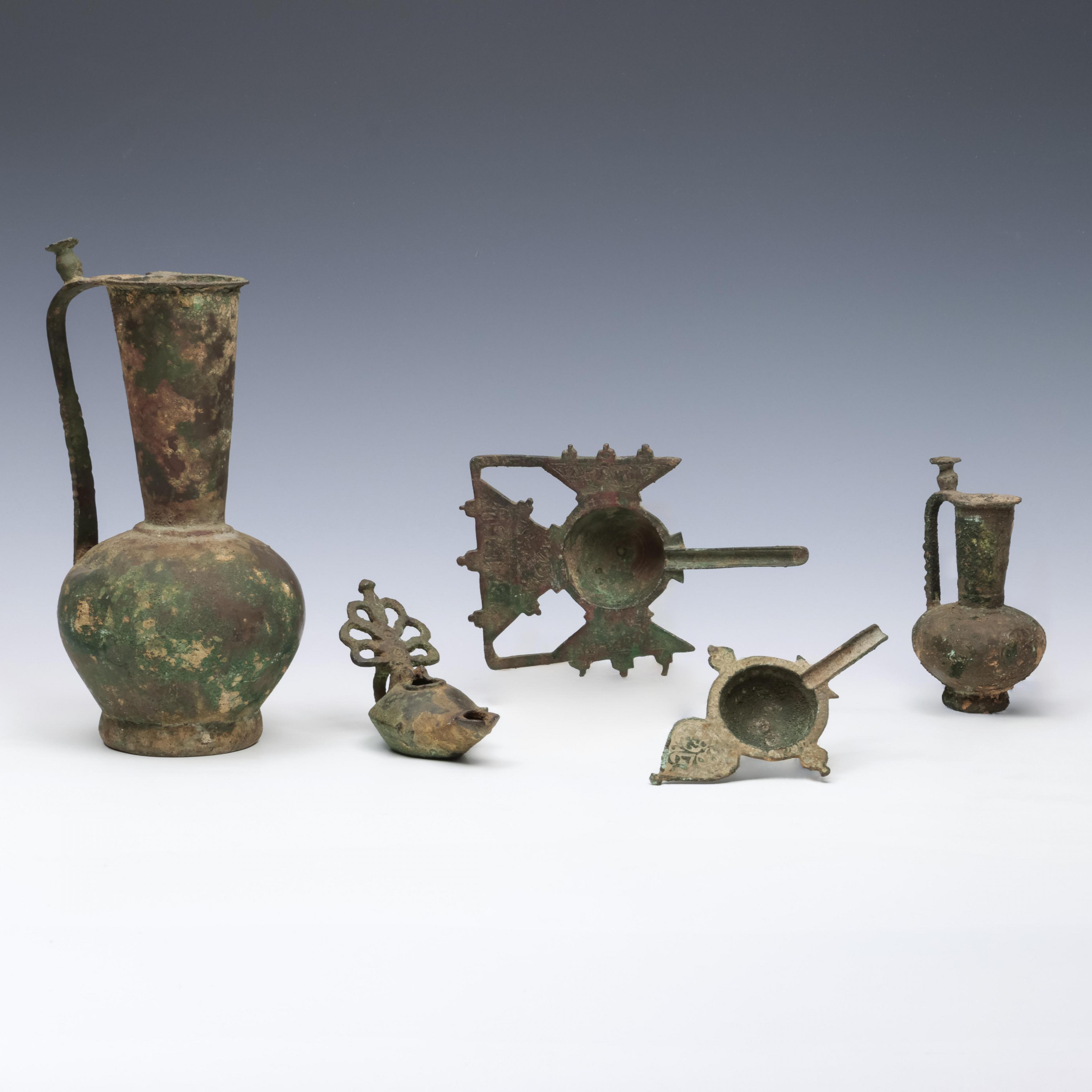A collection of three bronze antique oil lamps, Byzanthine, ca. 7th - 9th century CE and two bronze Persian flasks, ca. 10th - 12th century CE