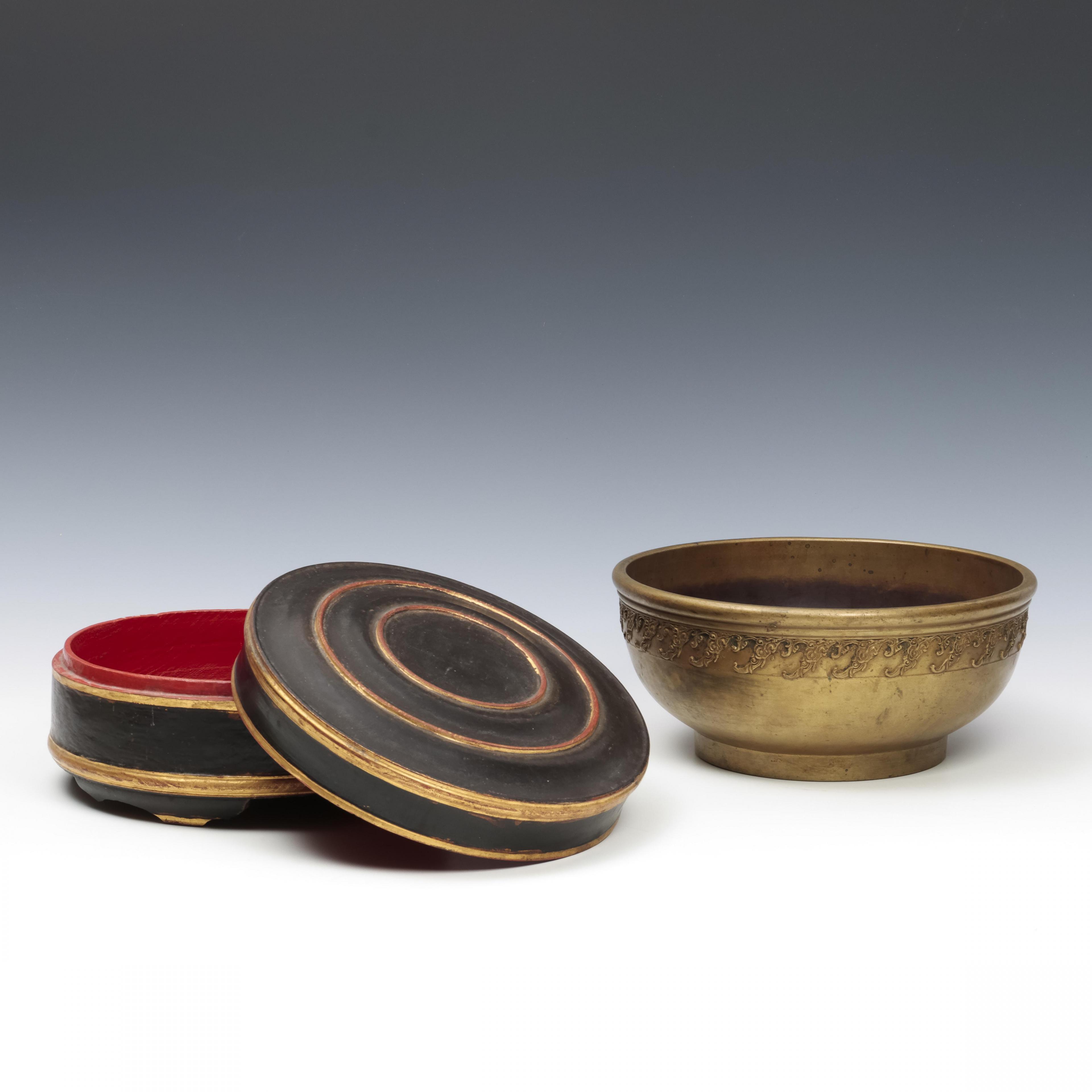 Birma, wooden lidded box and Sumatra, a copper alloy bowl.