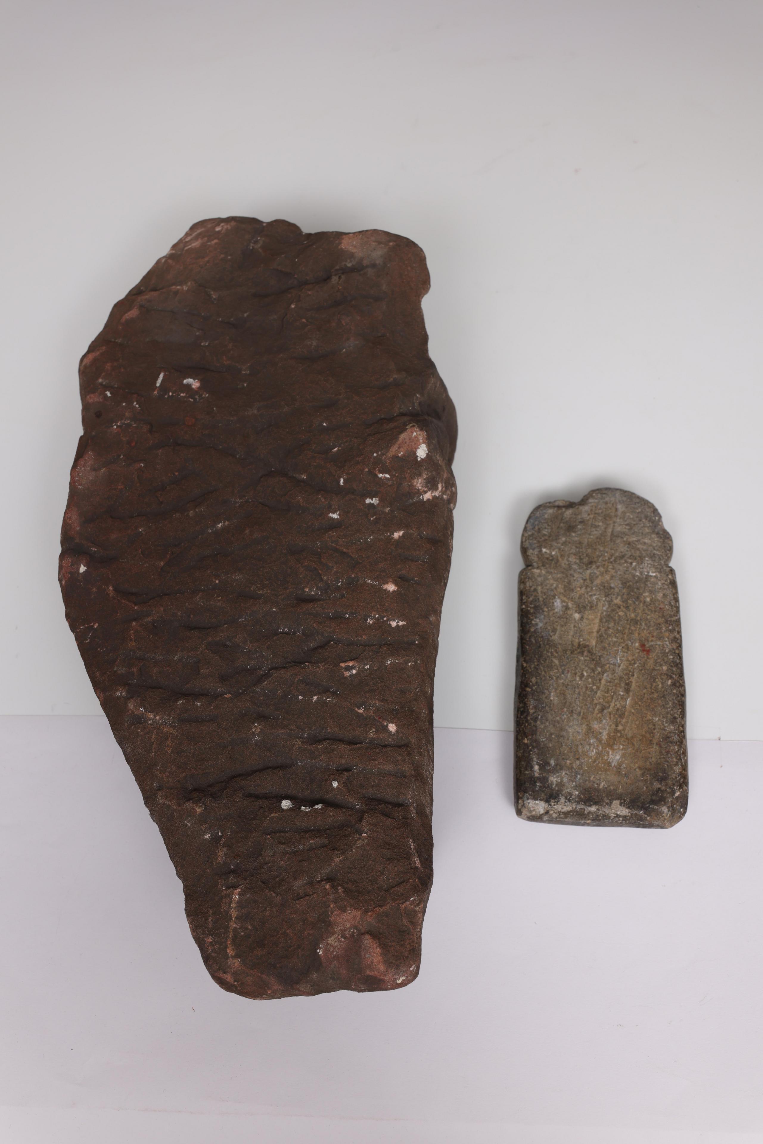India, a sand stone statue of a female diety and a soap stone small stele, 20th century;