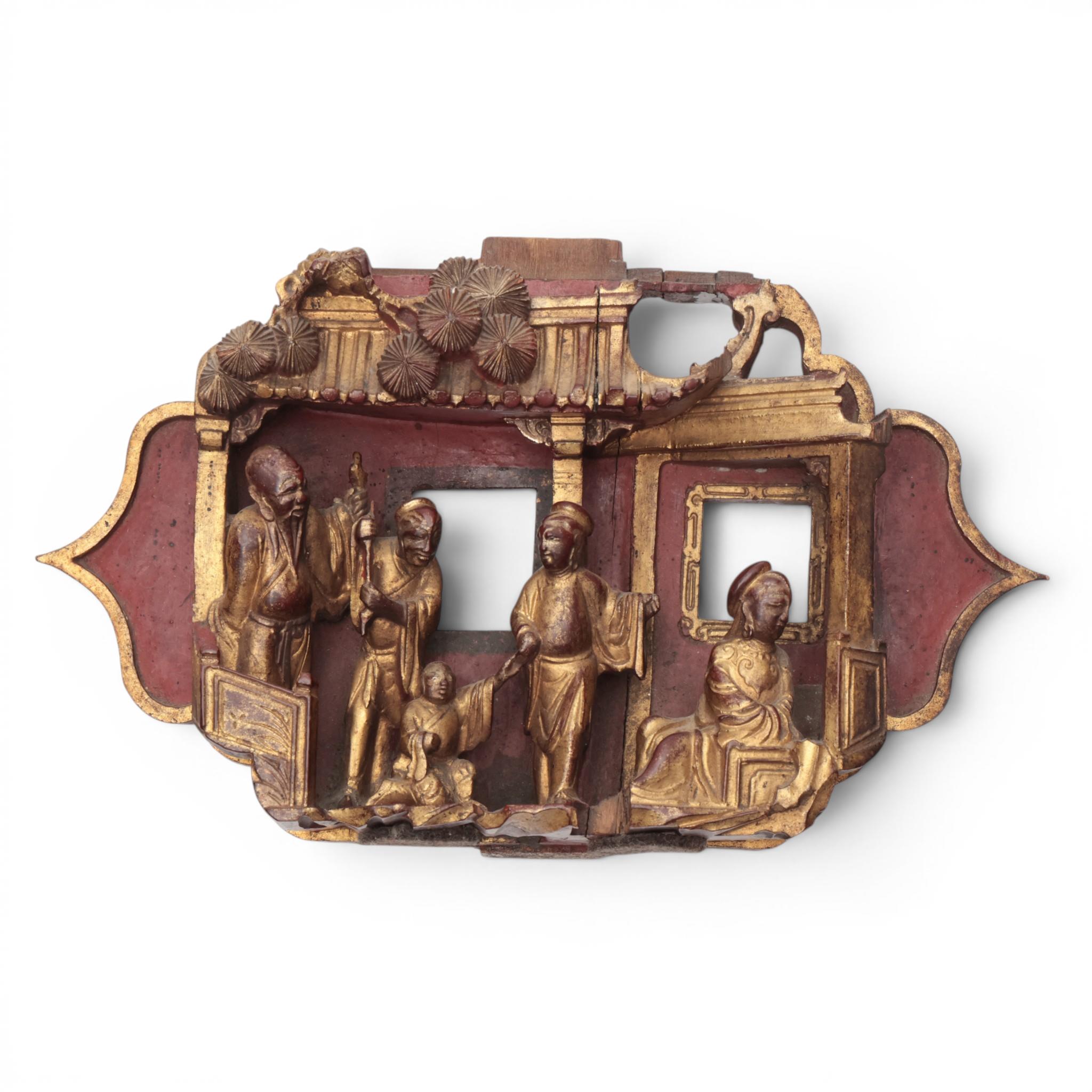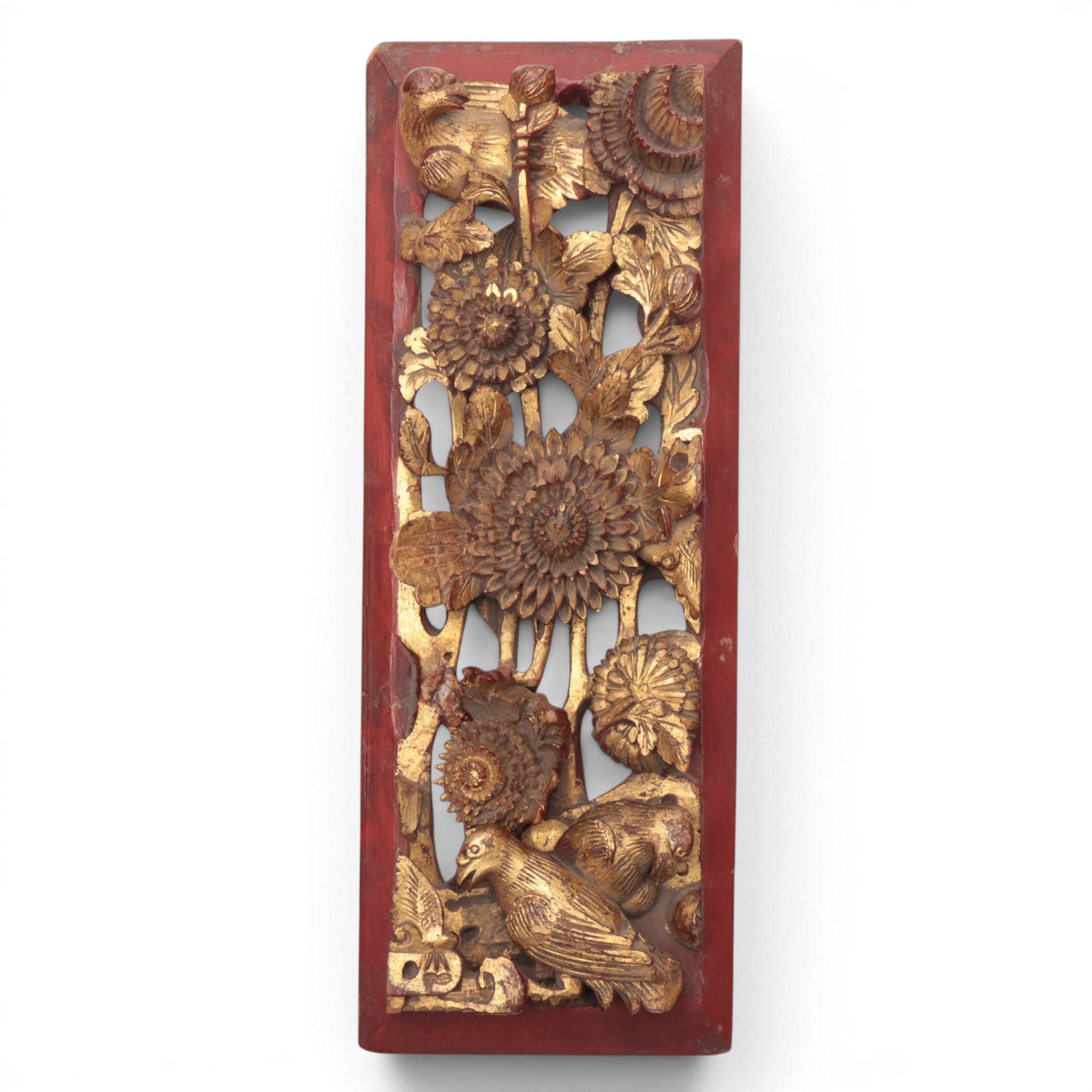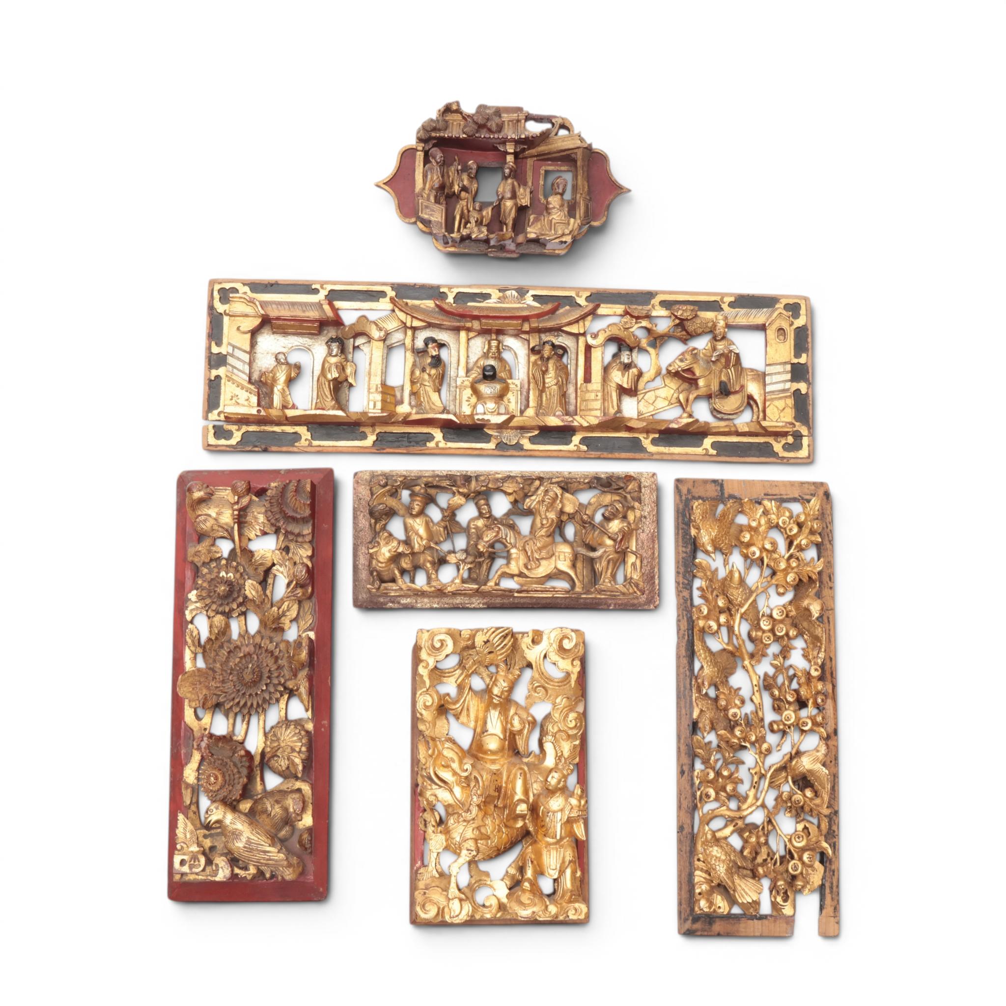 China, six red lacquer and gilt-wood carved ornaments, ca. 1900,