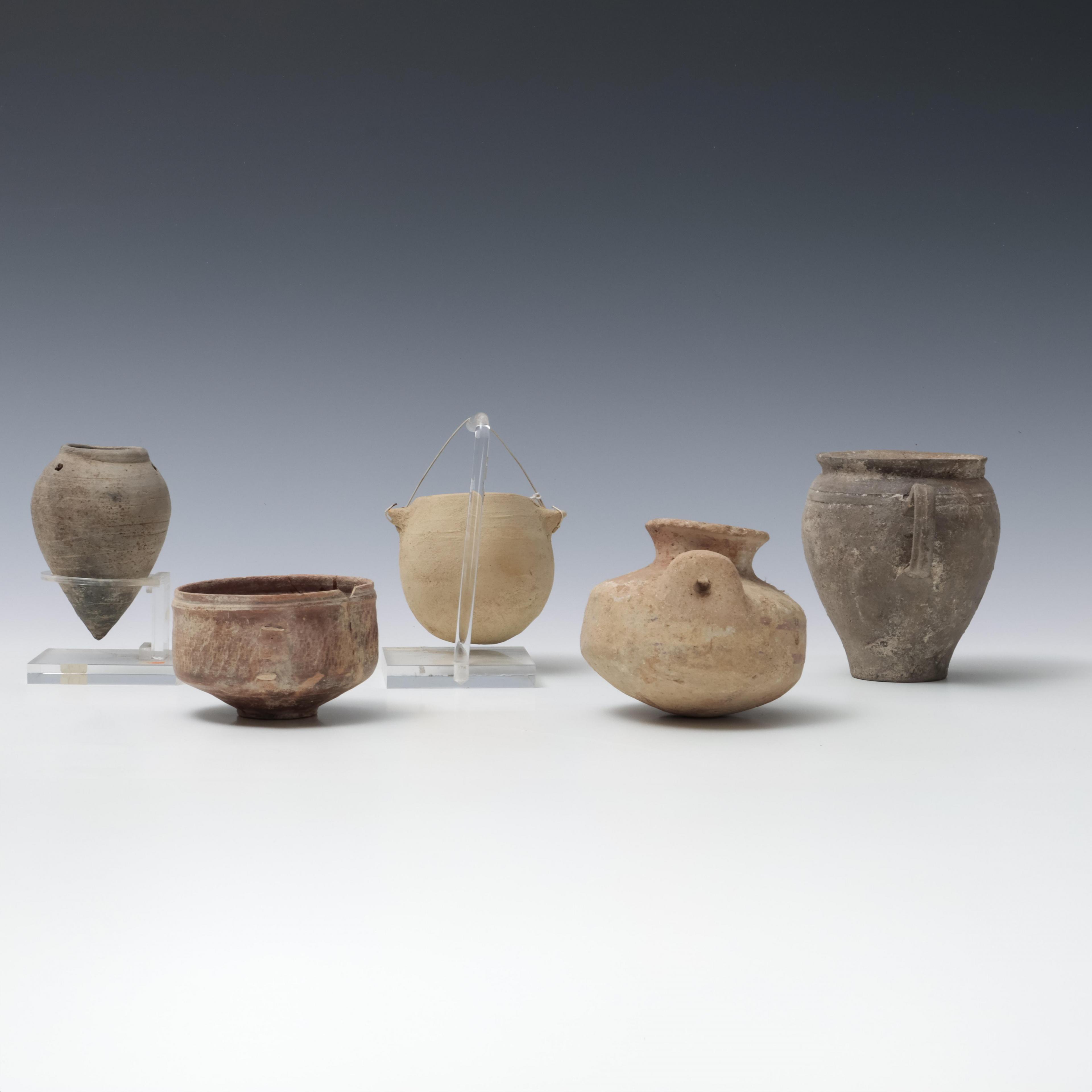 Tunisia, a conical Roman terracotta small amphora, a round pot with two ears, a jar with one ear, a beaker with one ear, ca. 1st - 4th century CE and a Mycena, terracotta jar with two ears, ca. 1100 BCE;