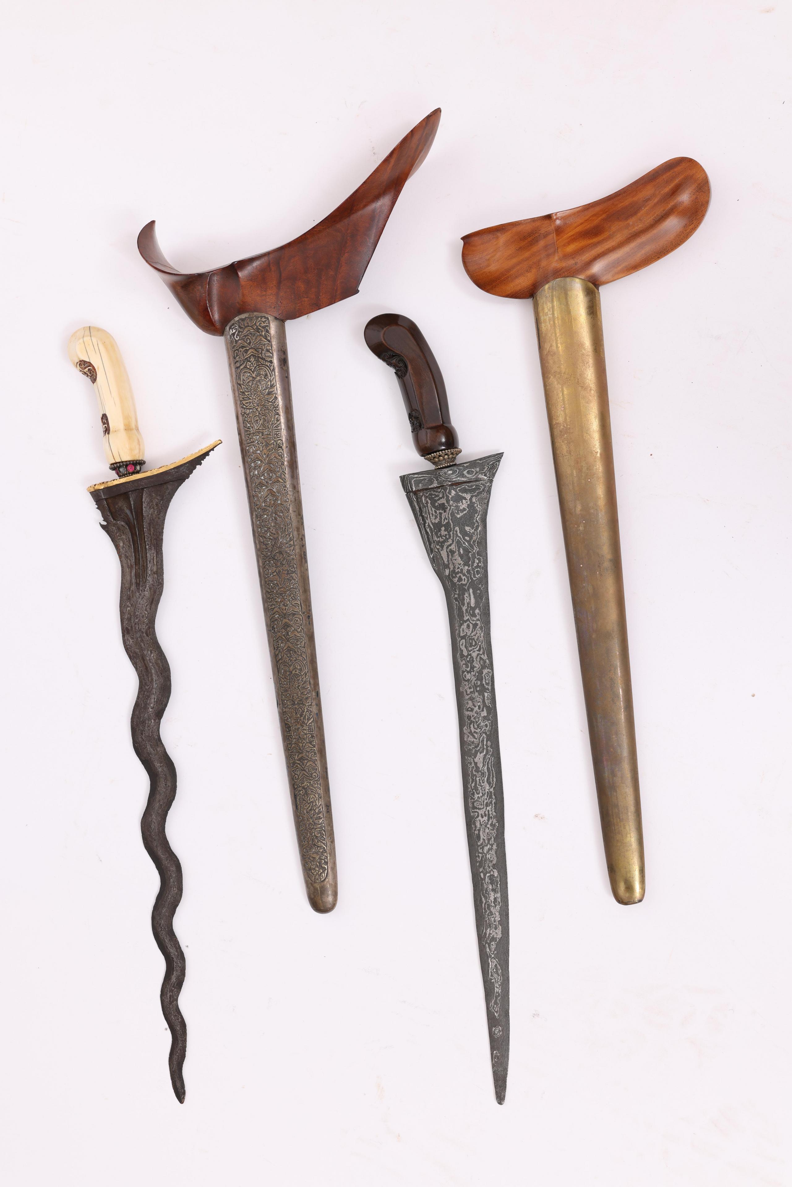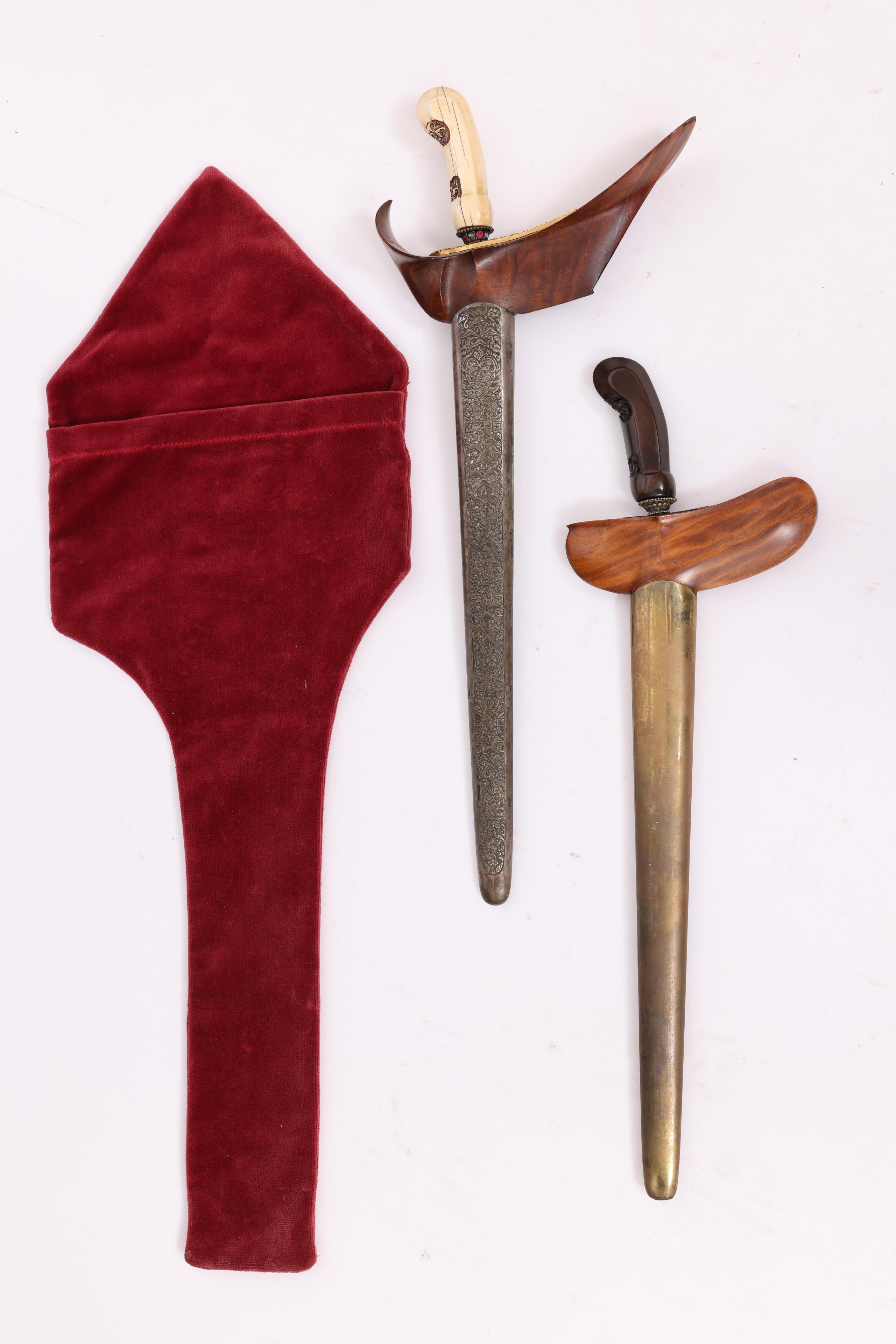 with marine ivory handle, a 11-luk pamor iron blade, the ganda shaped as an elephant trunk, the gandik covered with a gold floral patterned sleeve. Herewith another kris with straight pamor blade and wooden handle.