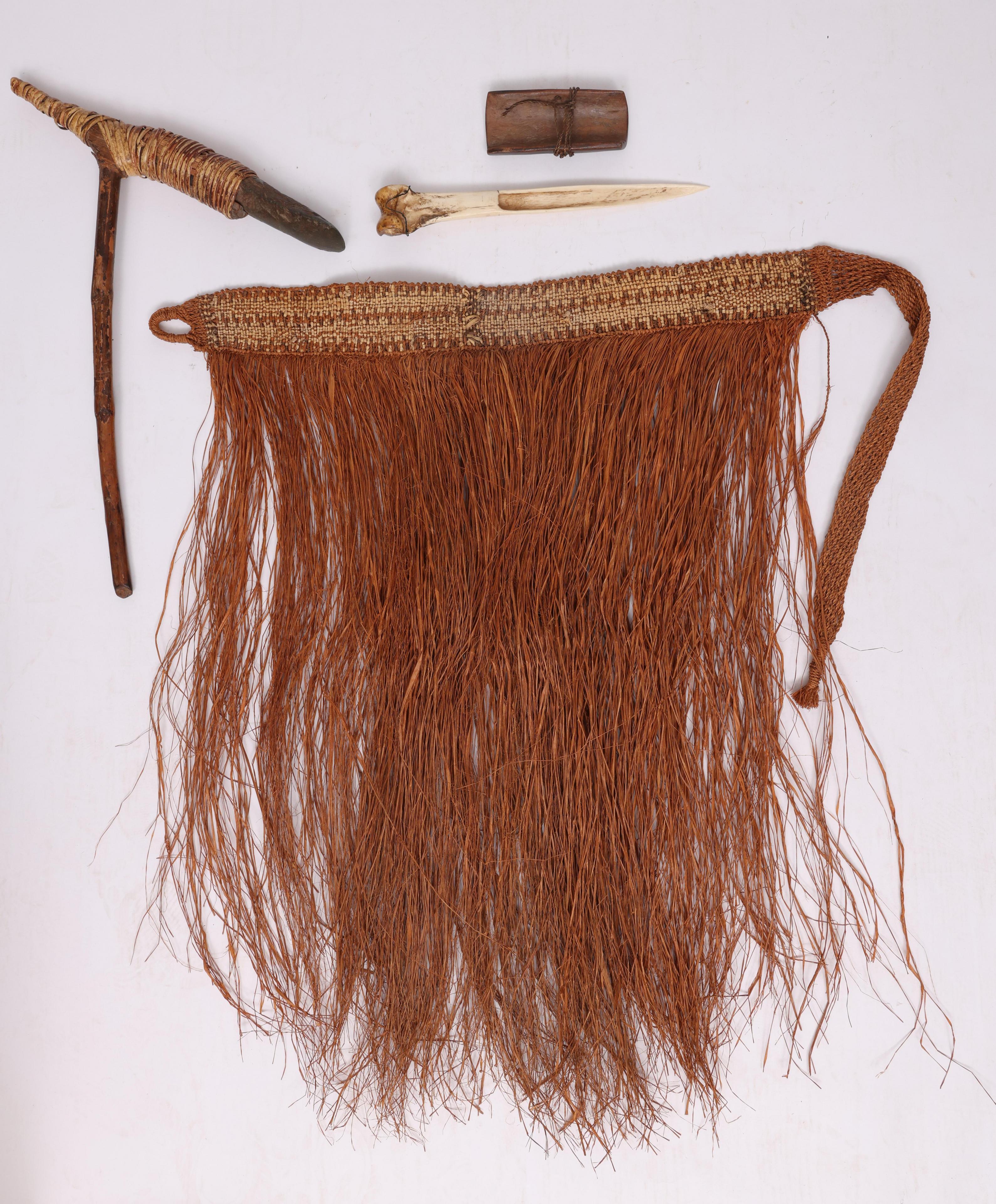 Ceremonial bone dagger, a wooden axe, a plant fiber skirt and a lot of arrows with a wooden bow.