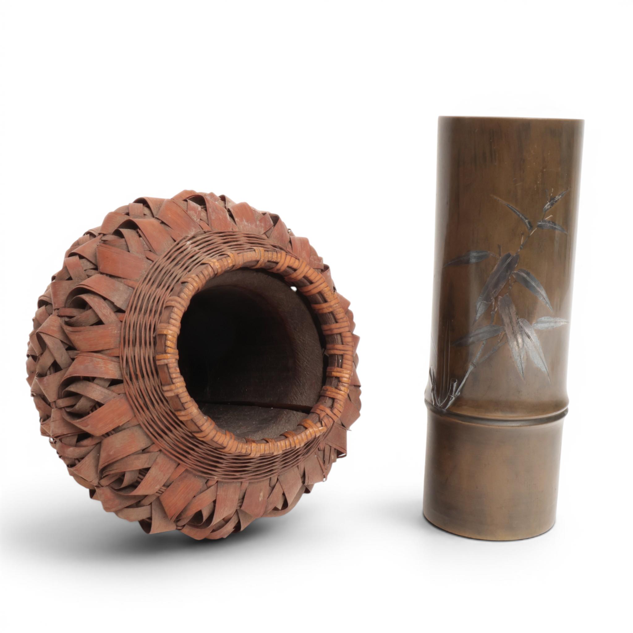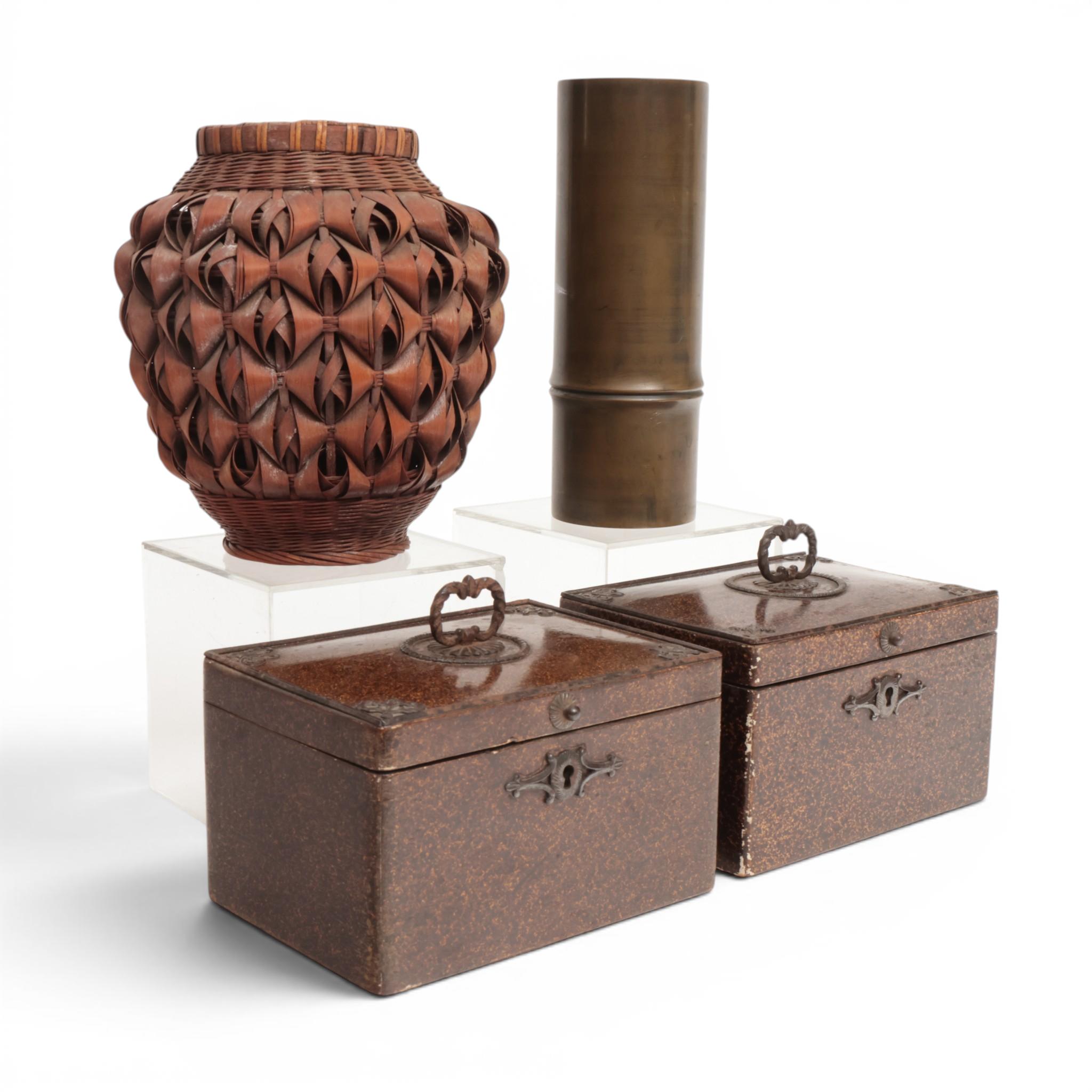 comprising a pair of lacquer boxes and covers covered with nashiji sprinkles, a woven ikebana basket and a bronze inlaid bamboo-shaped vase