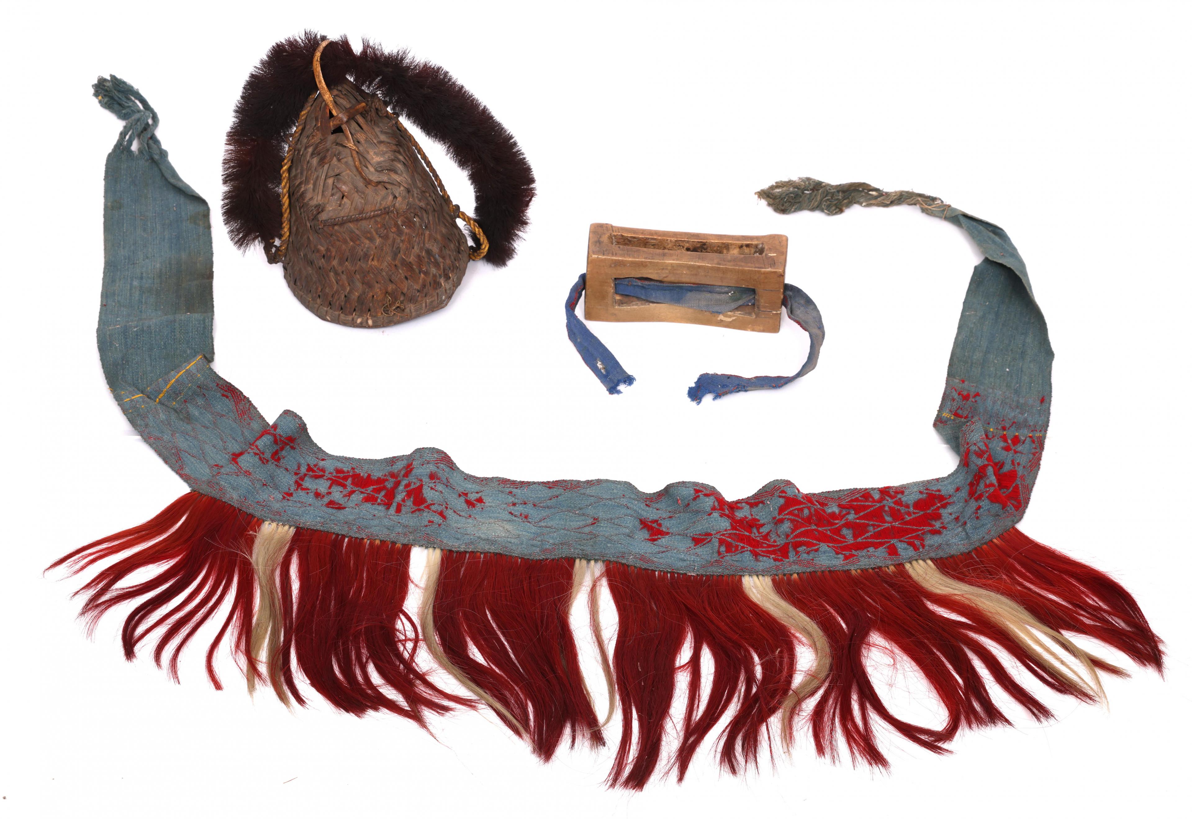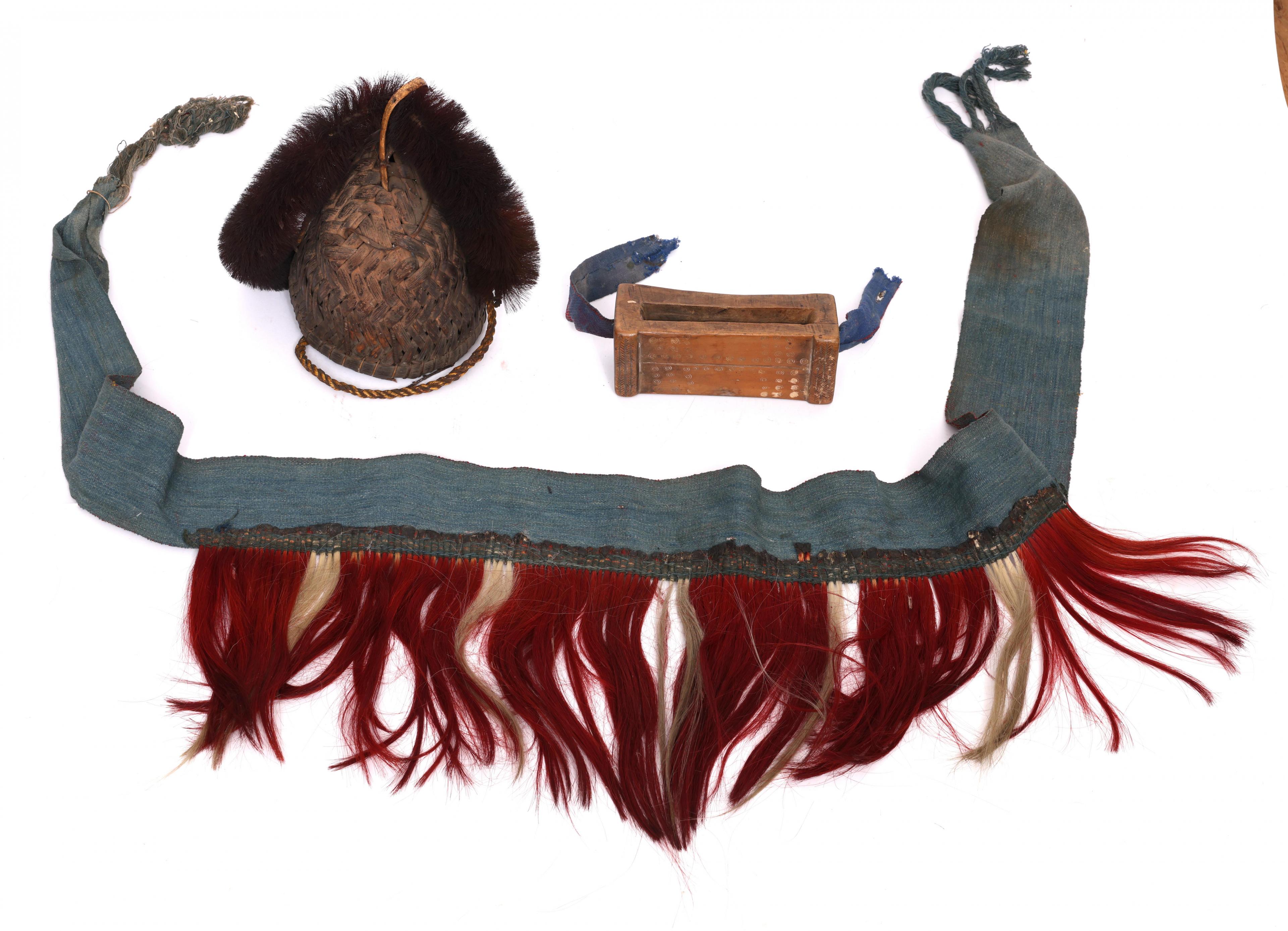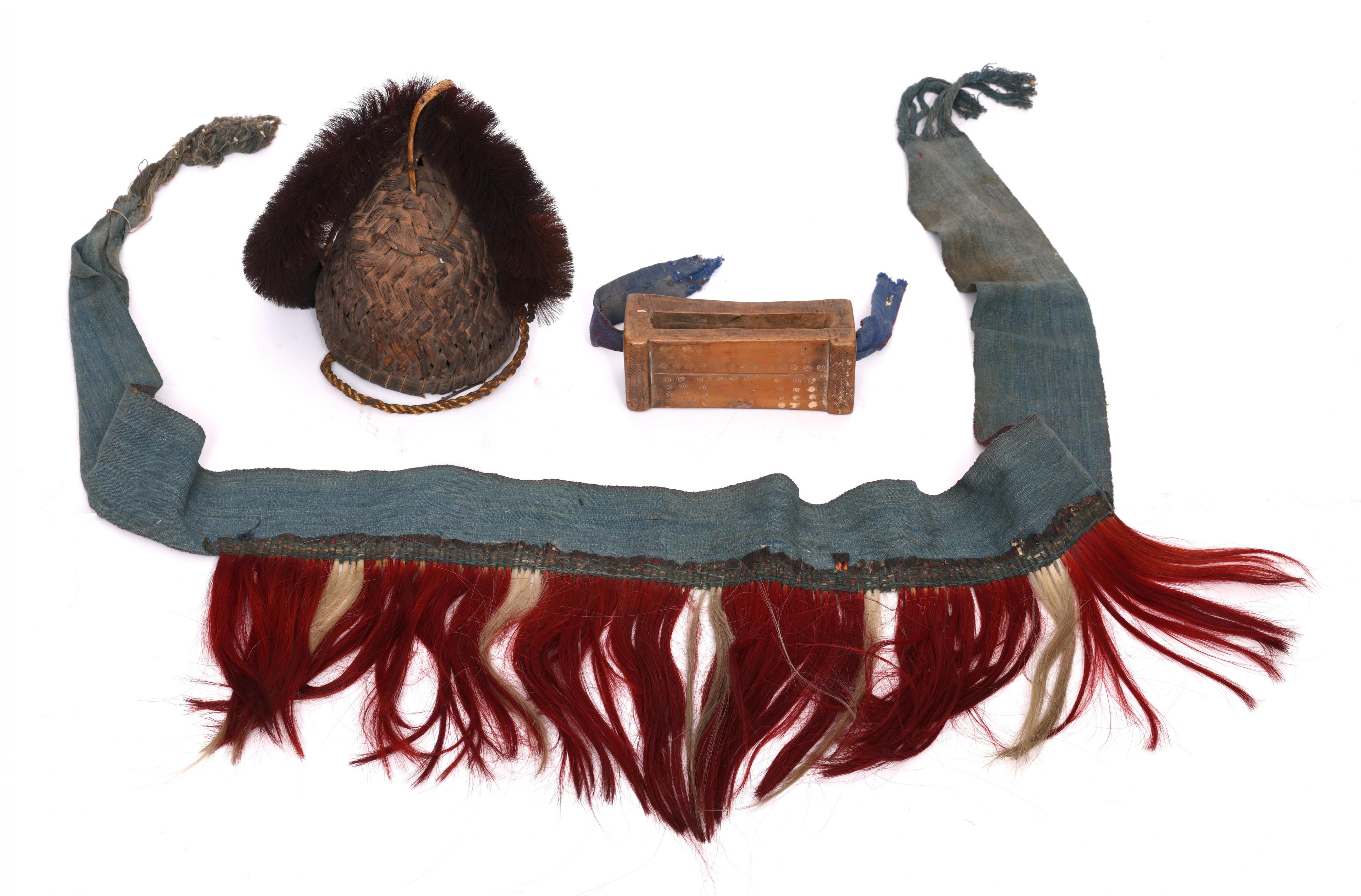 Naga, a plaited plant fiber headdress, a cotton belt and a wooden implement.