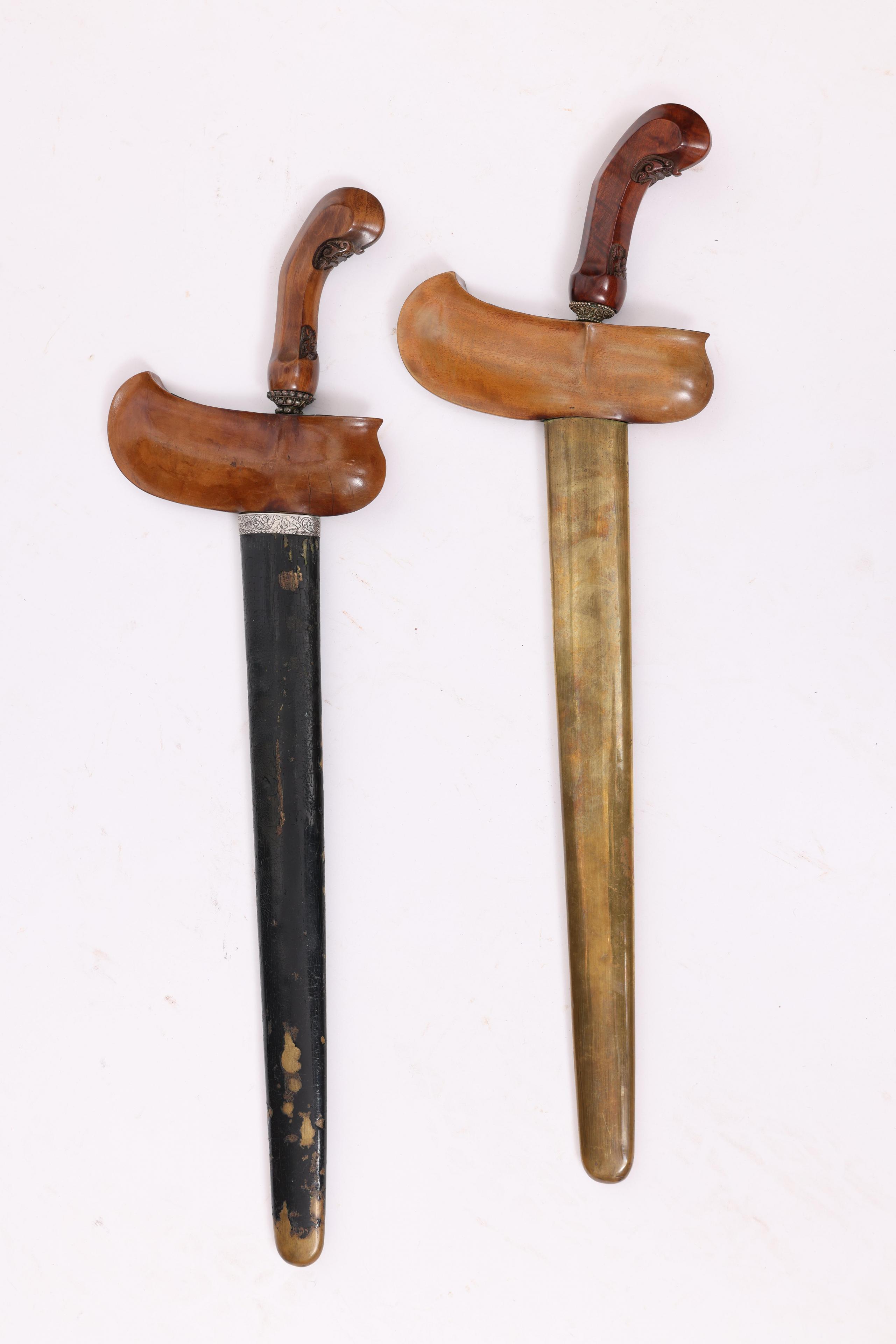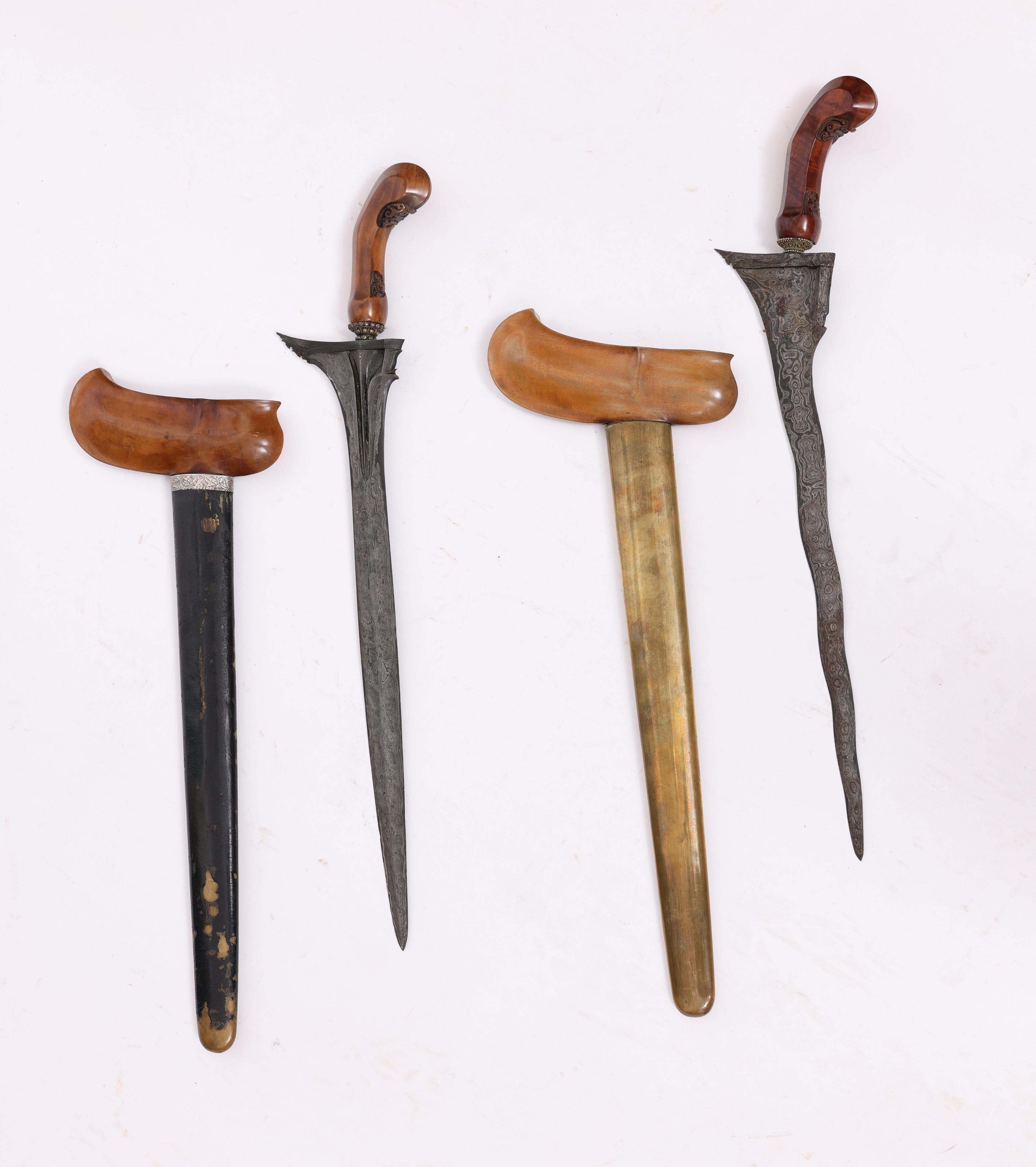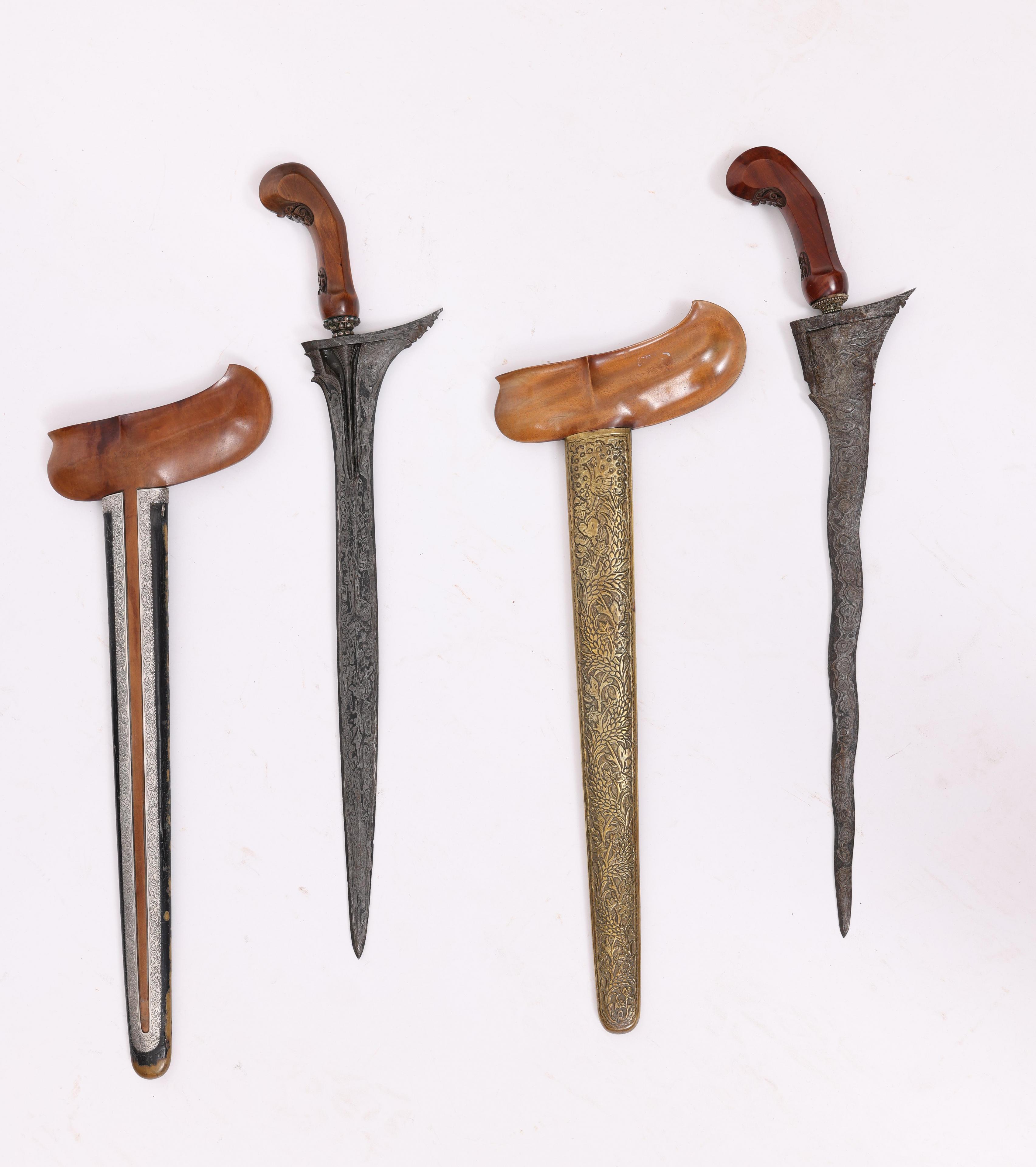 one with a straight pamor iron blade, and silver partly blackened siselised sleeve, selut set with inten. The other with a seven-luk pamor iron blade, filigree selut, hamered brass pendok, showing flowers and peacock.