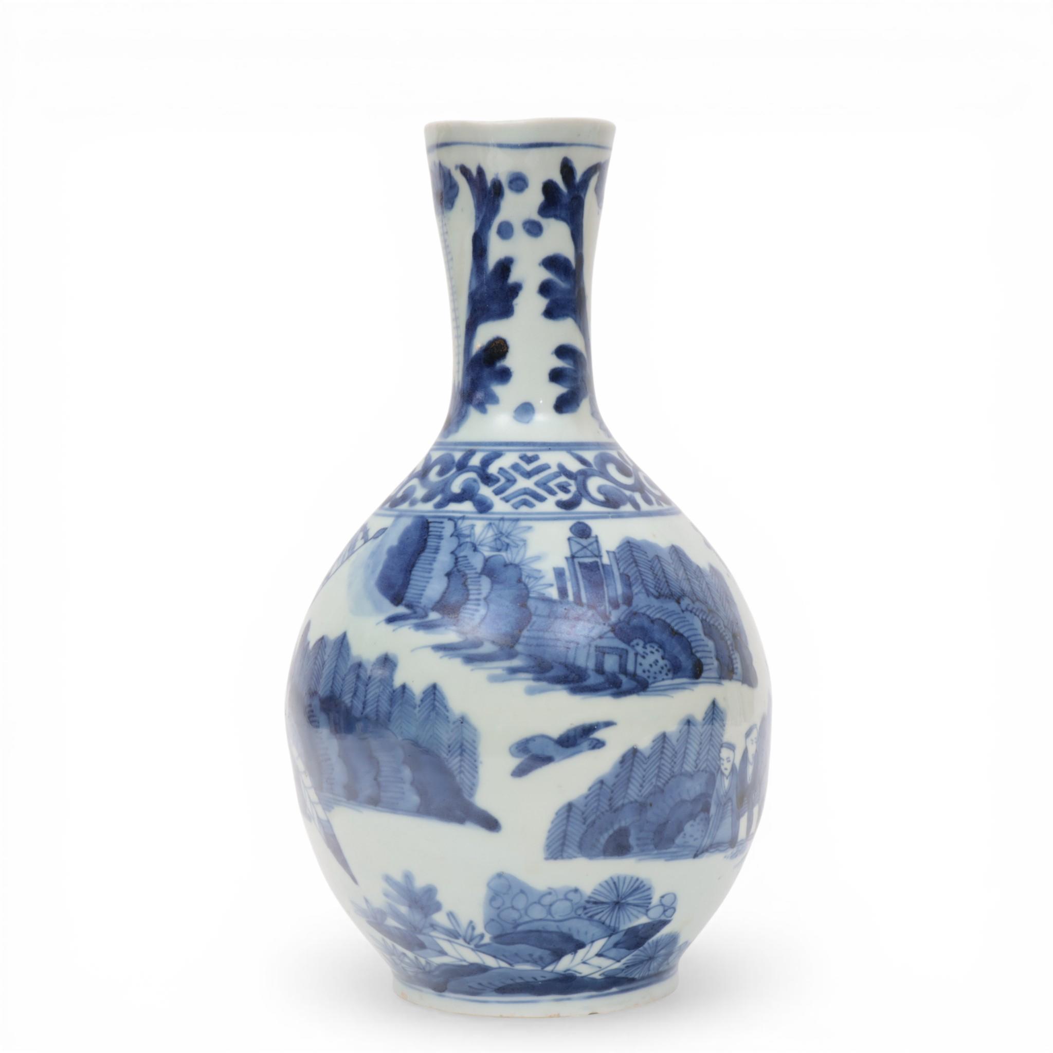 painted in the Chinese style with figures in a continuous landscape, the tall neck with upright flowers (restoration to neck)