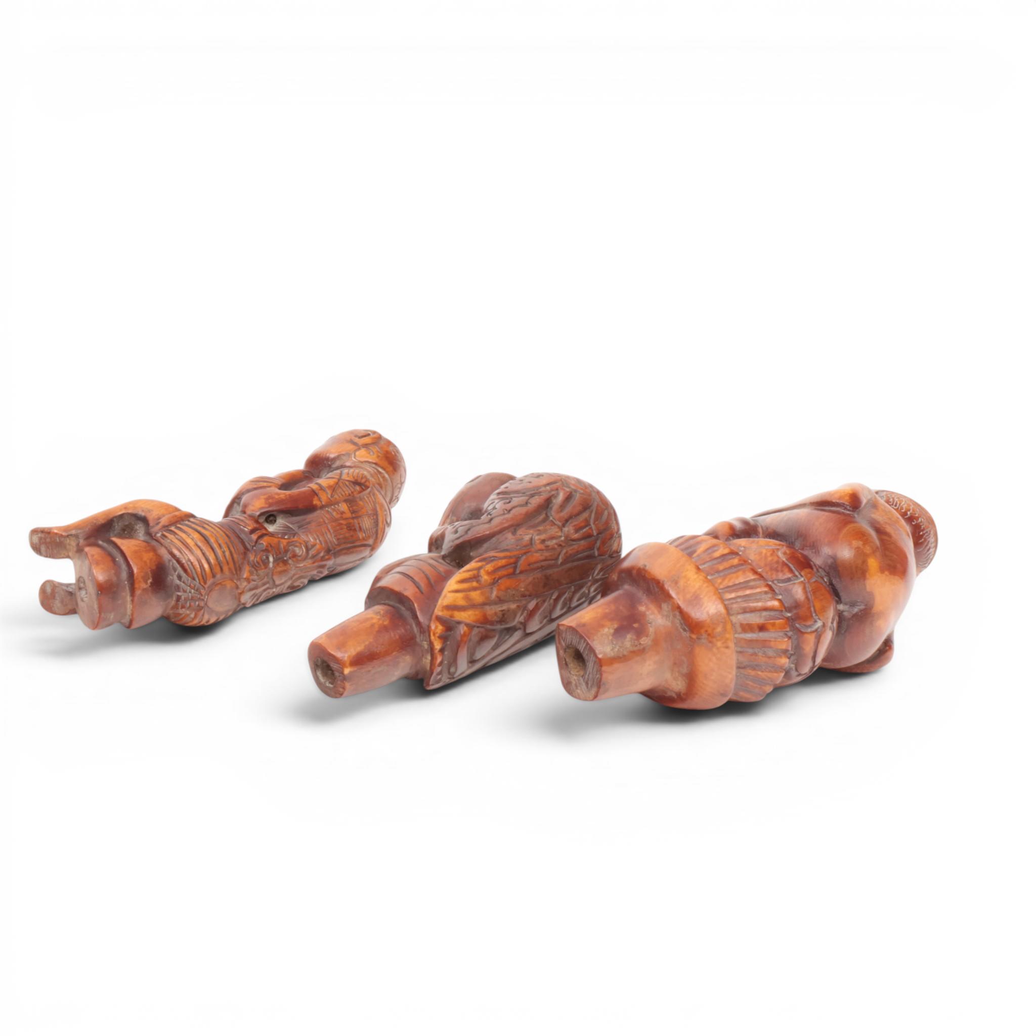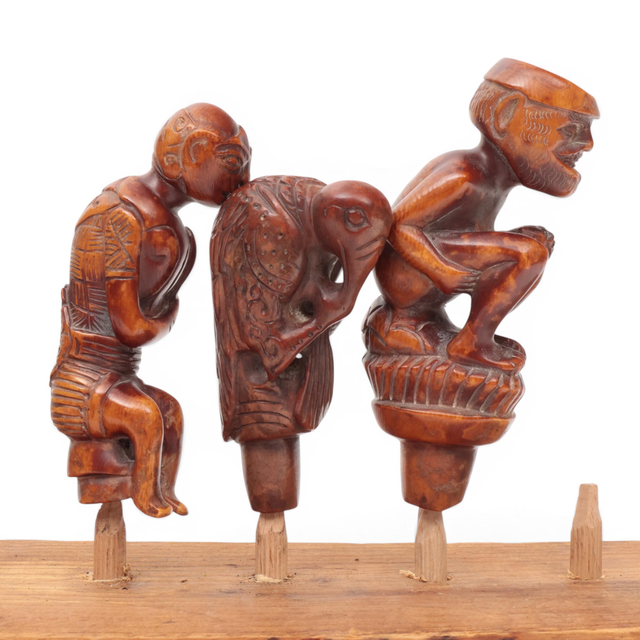 Lombok, three marine ivory hilts, two showing a seated anthropomorphic figure, the third carved as a bird.
