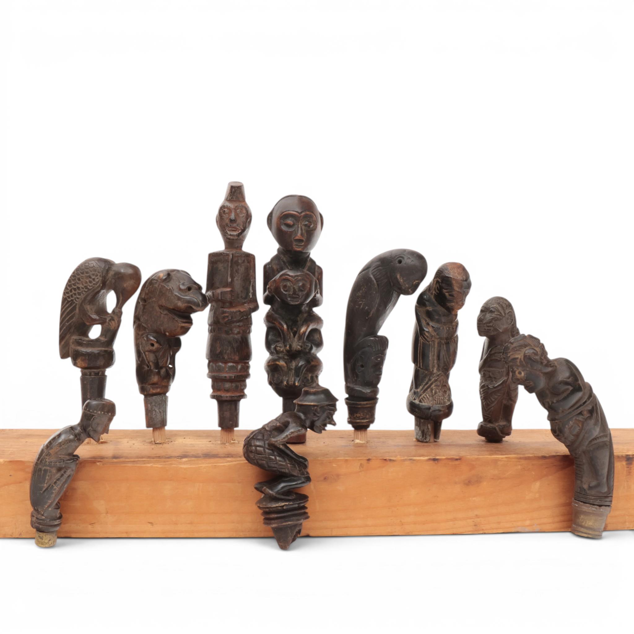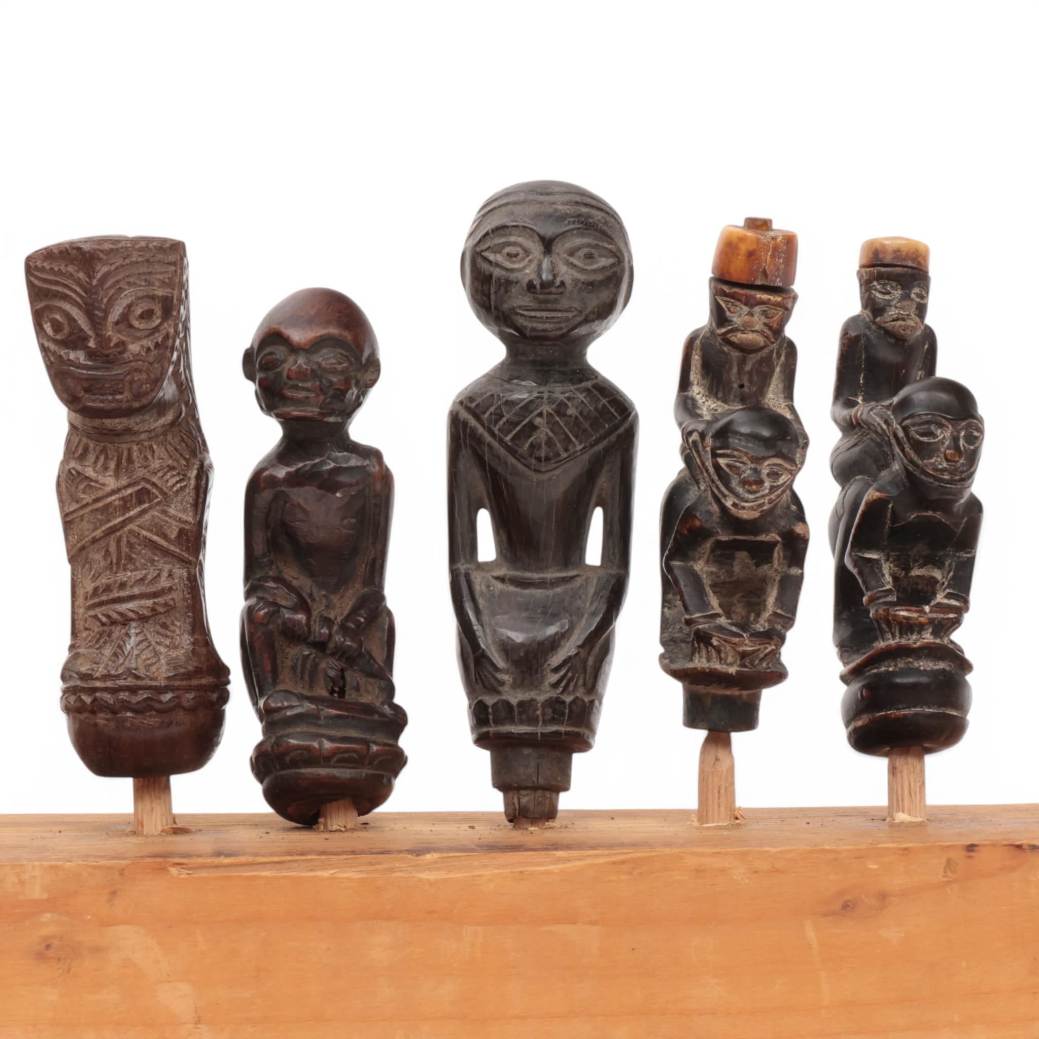 Lombok, five wooden and horn handles, depicting anthropomorphic figures, one in wayang-style.