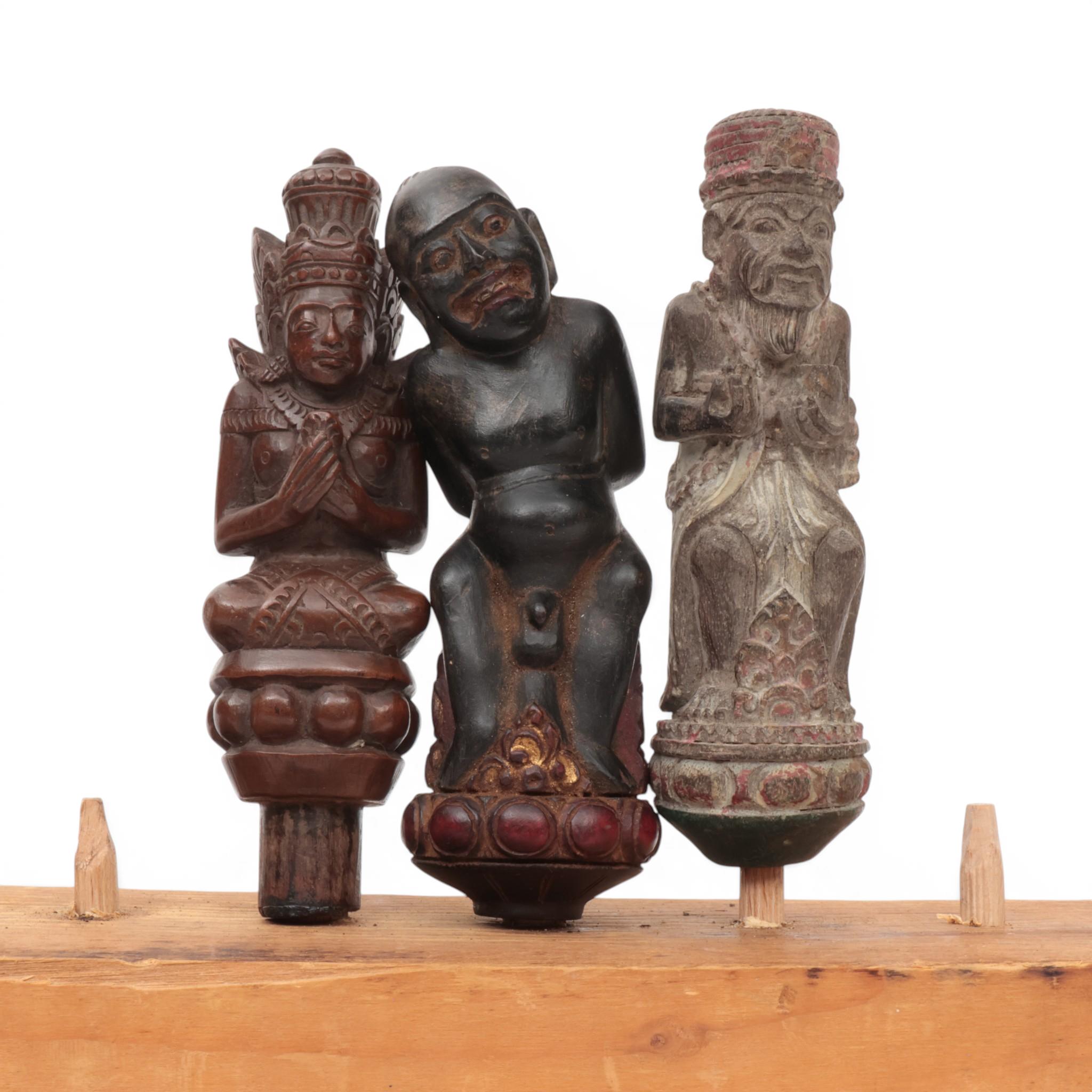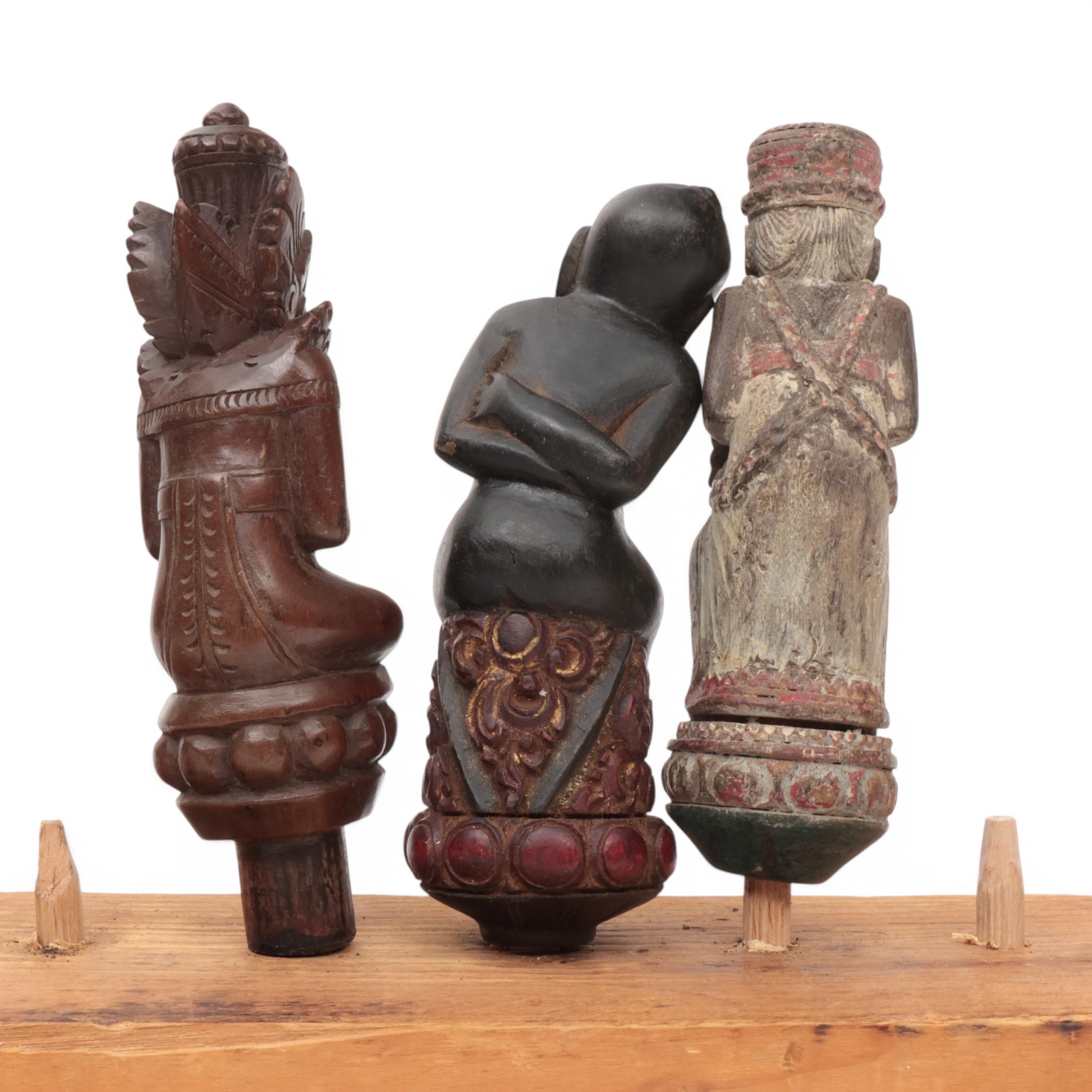 Bali, three wooden hilts, one showing Dewi Shri in wayang-style, one depicting a priest and the last item depicting a naked demon, polychromy.