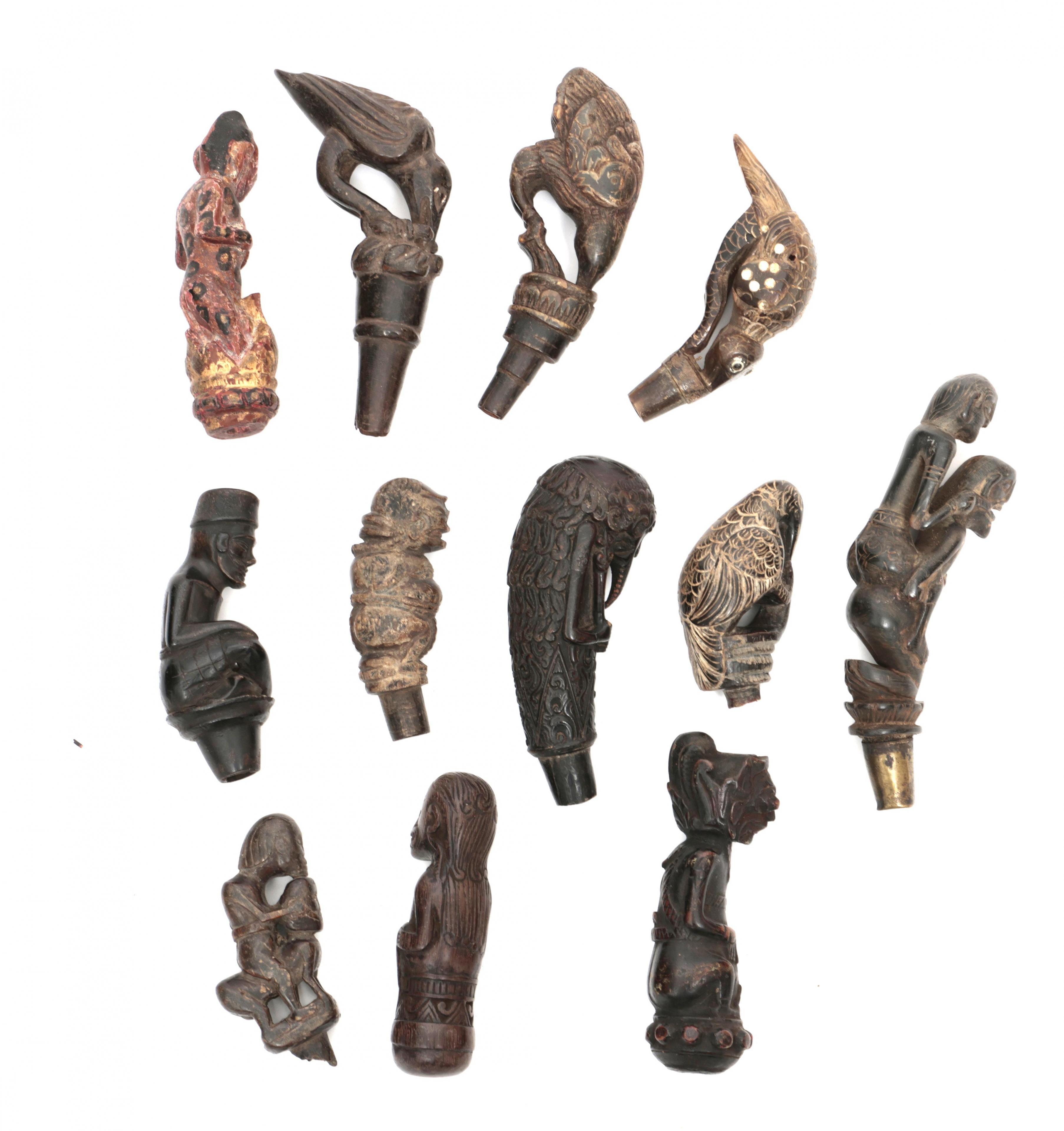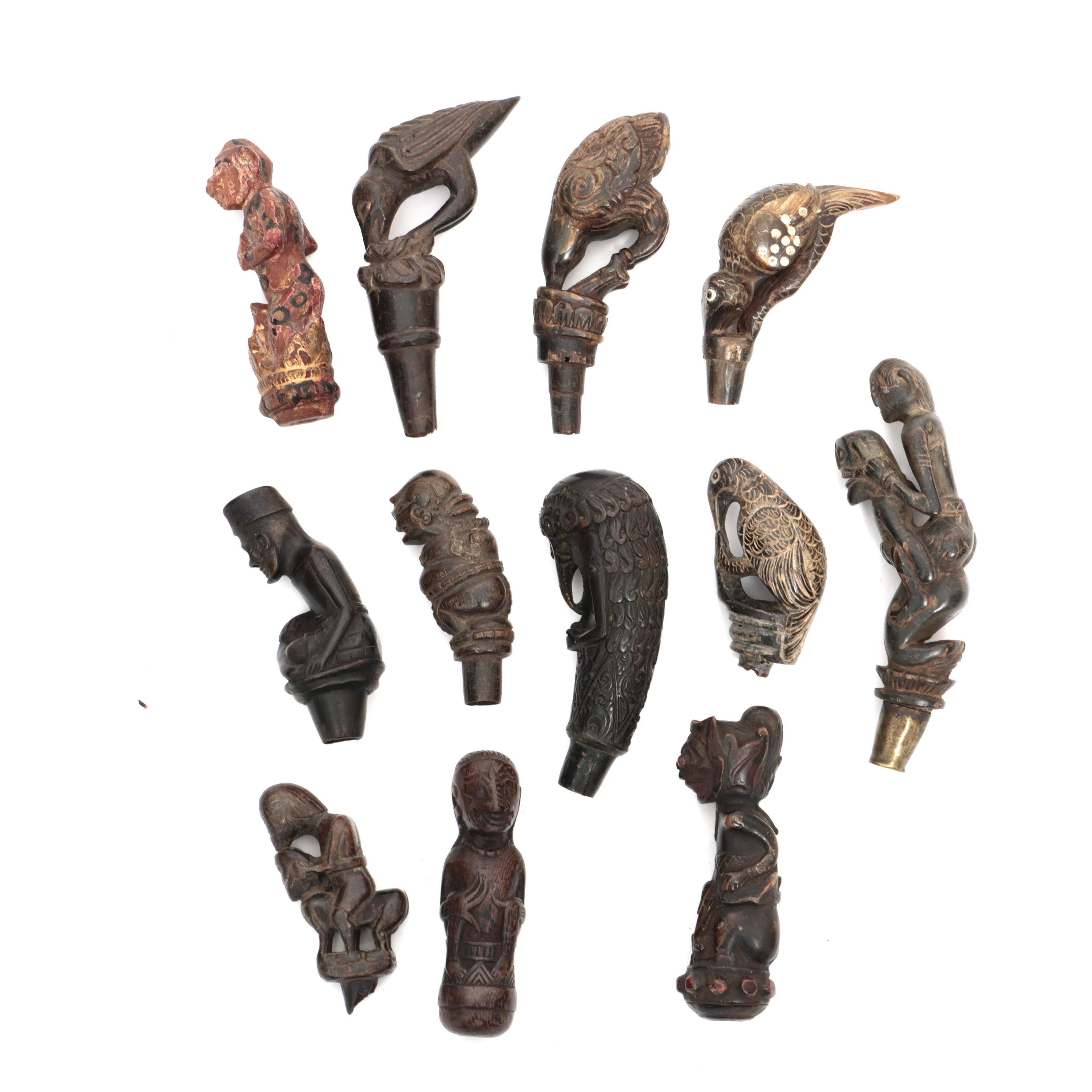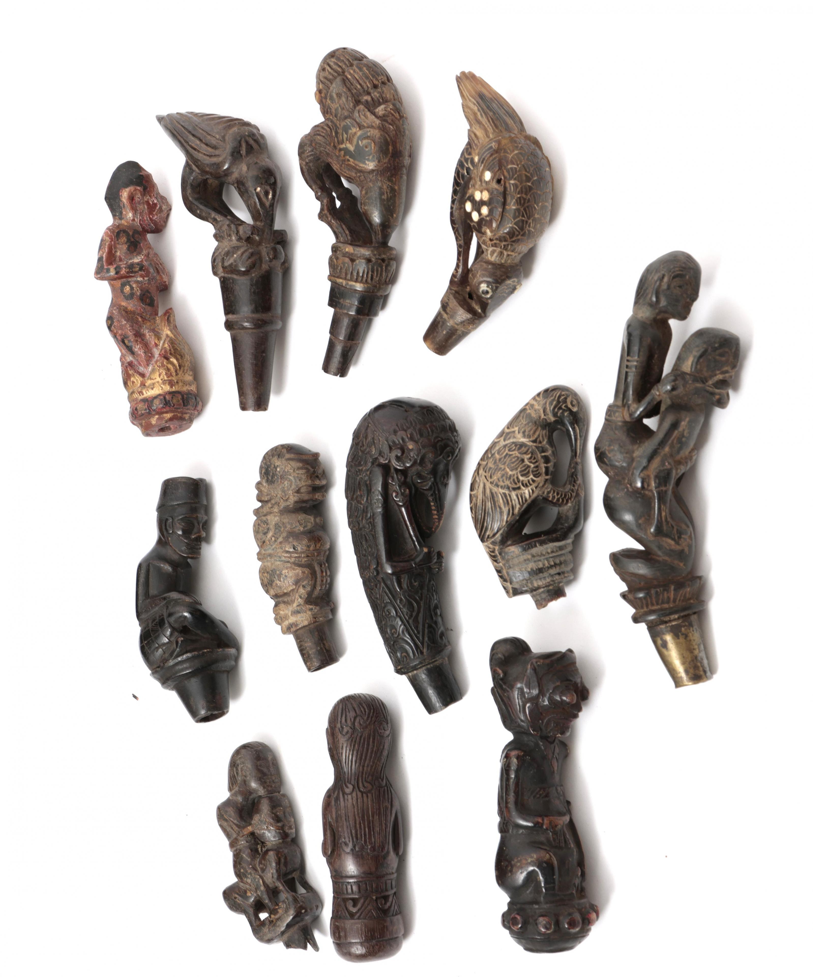 Lombok-Bali, nine horn hilts, depicting superimposed figures and birds; herewith three wooden kris hilts.