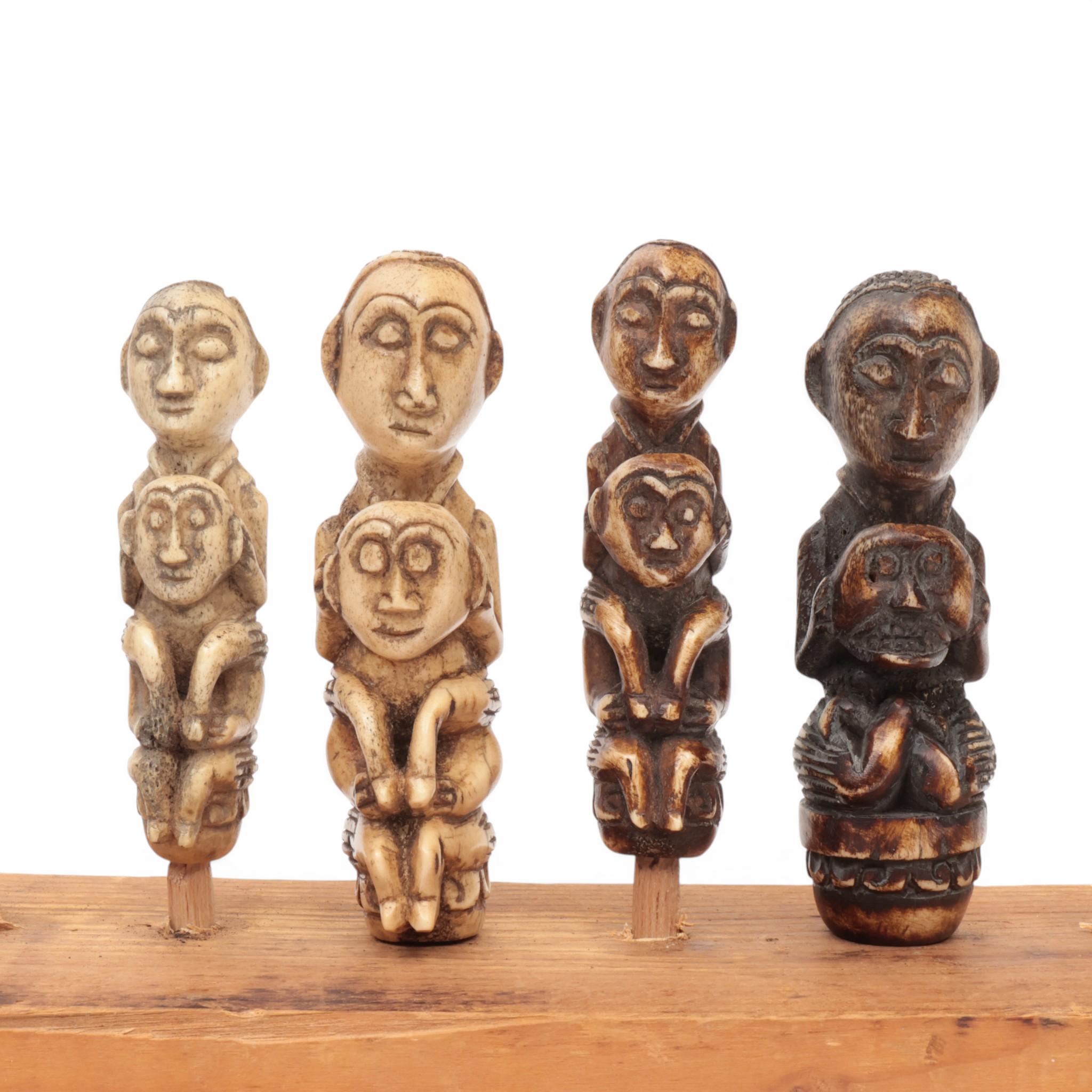 Bali-Lombok, four bone handles, three carved as two superimposed human figures and one showing a seated figure with head between his hands.