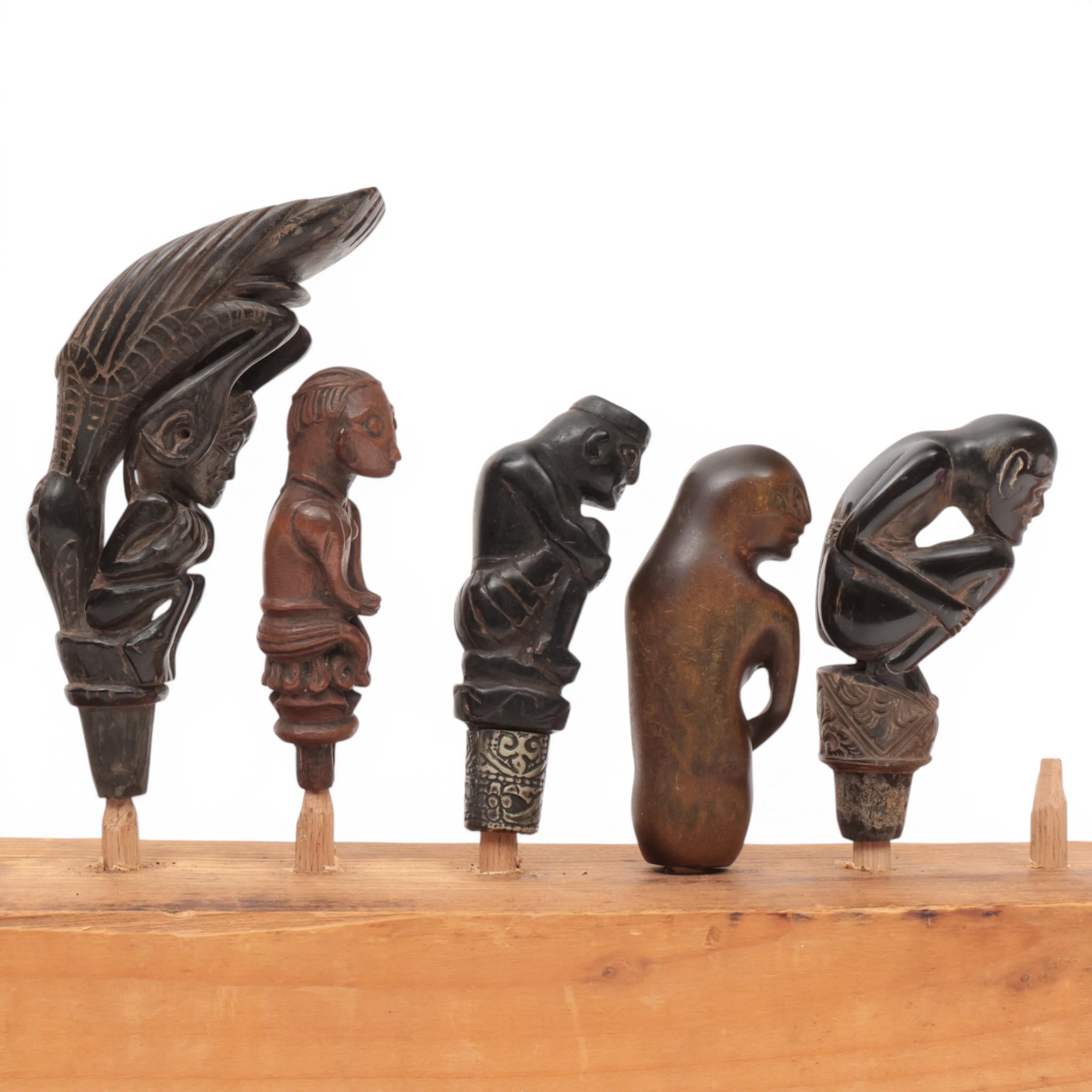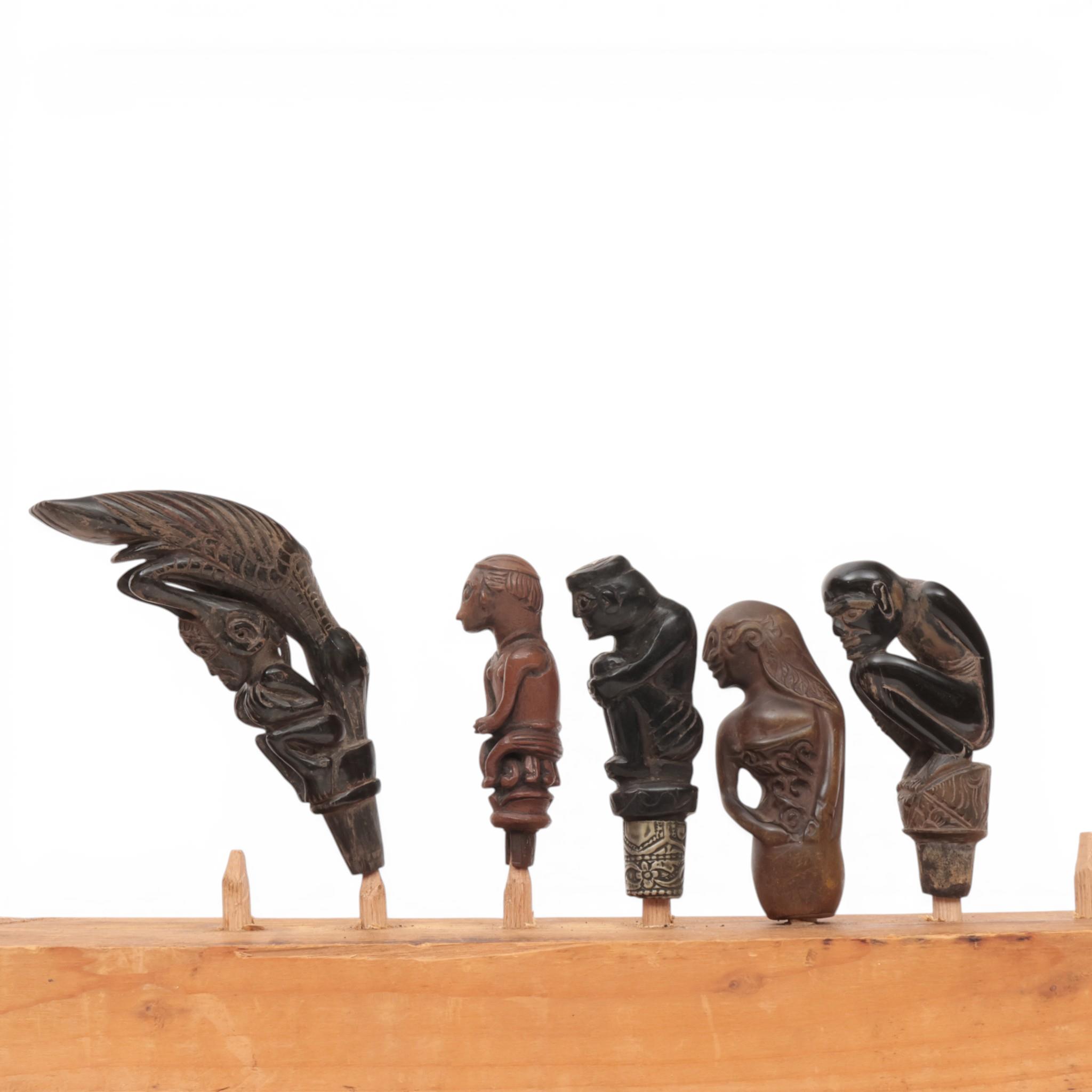 Bali-Lombok, two wooden hilts, depicting a female half-figure and a seated male figure; herewith three horn handles, one showing a bird on top of a squatting human and two hunched anthropomorphs.