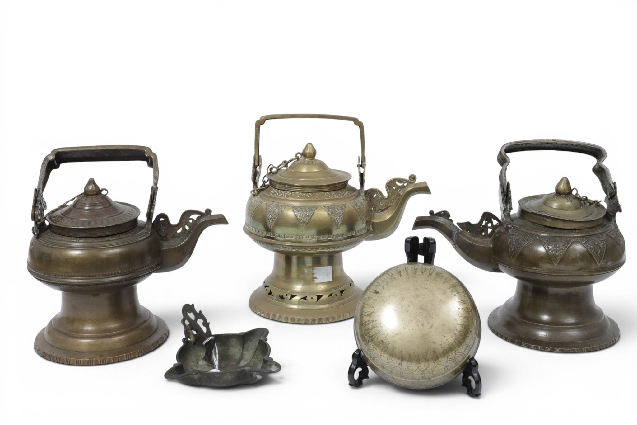 Three Javanese copper allow water kettles, ca. 1900, India, a 16th century copper ceremonial bowl and a 16th century Javanese bronze oillamp;