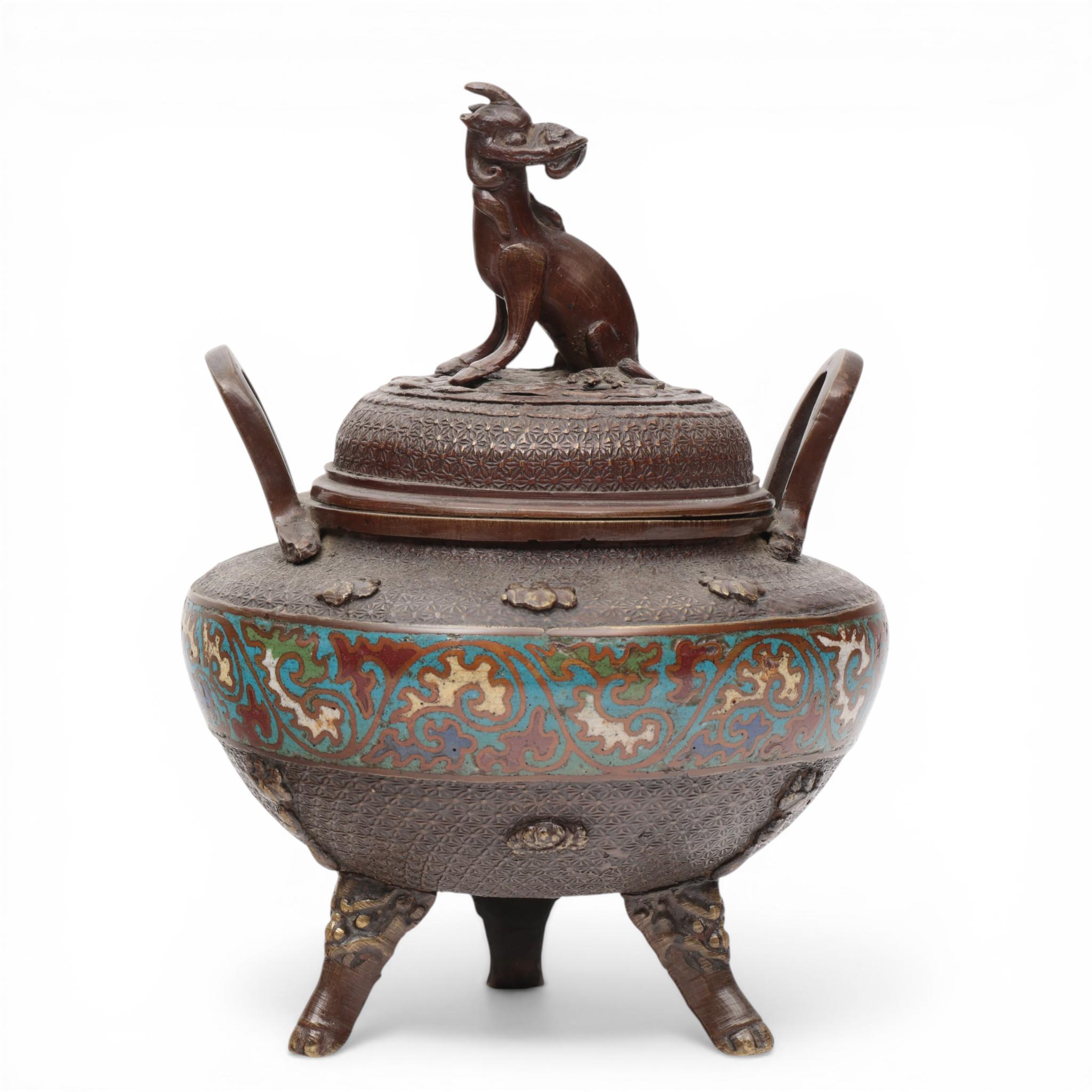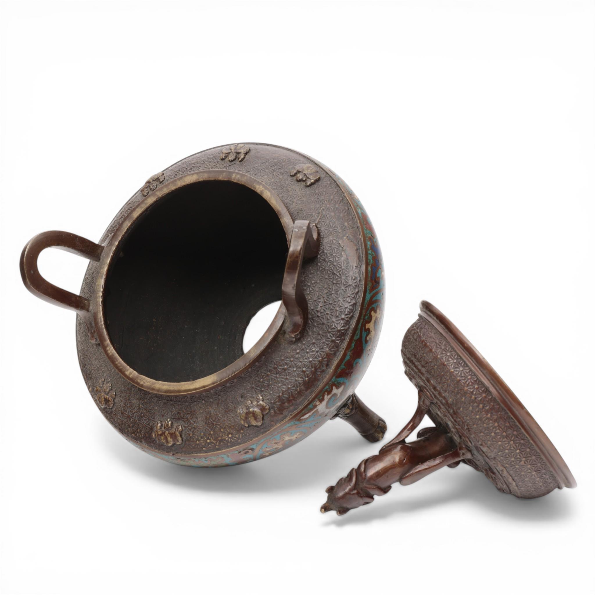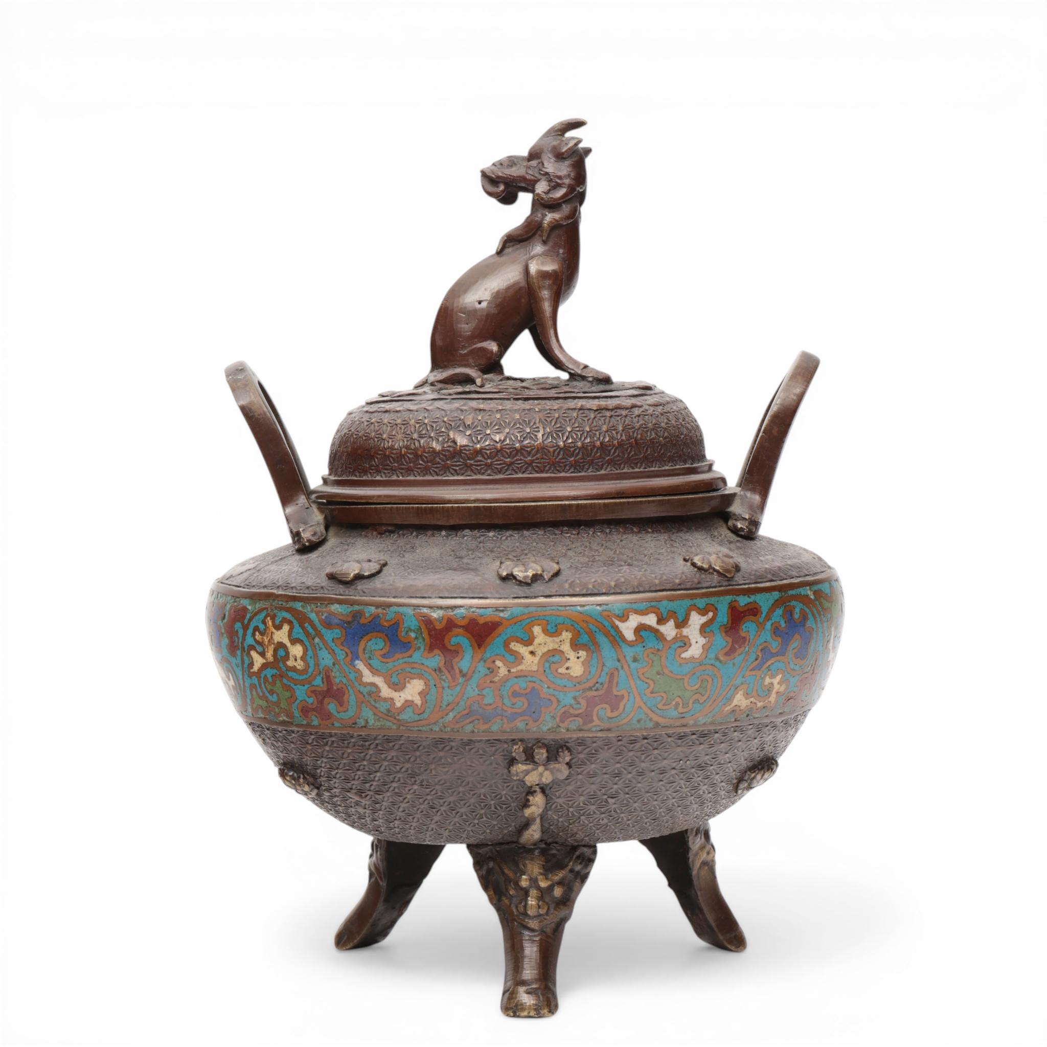 on tripod feet, the bombé body inlaid with cloisonné scrollwork, the pierced cover with animal finial (base missing)
