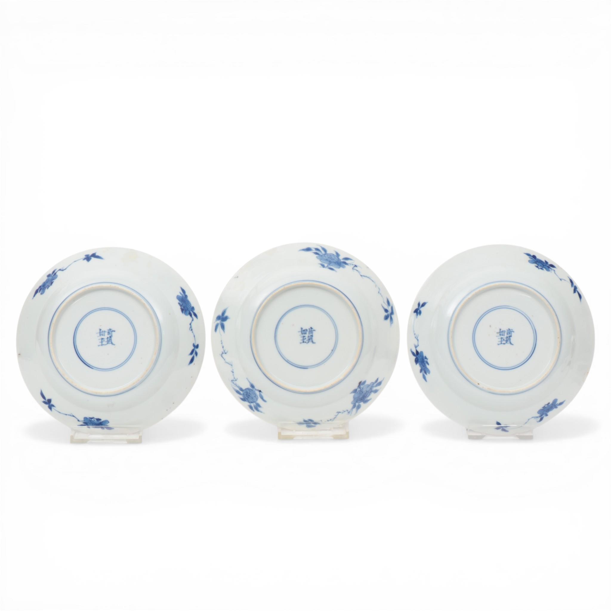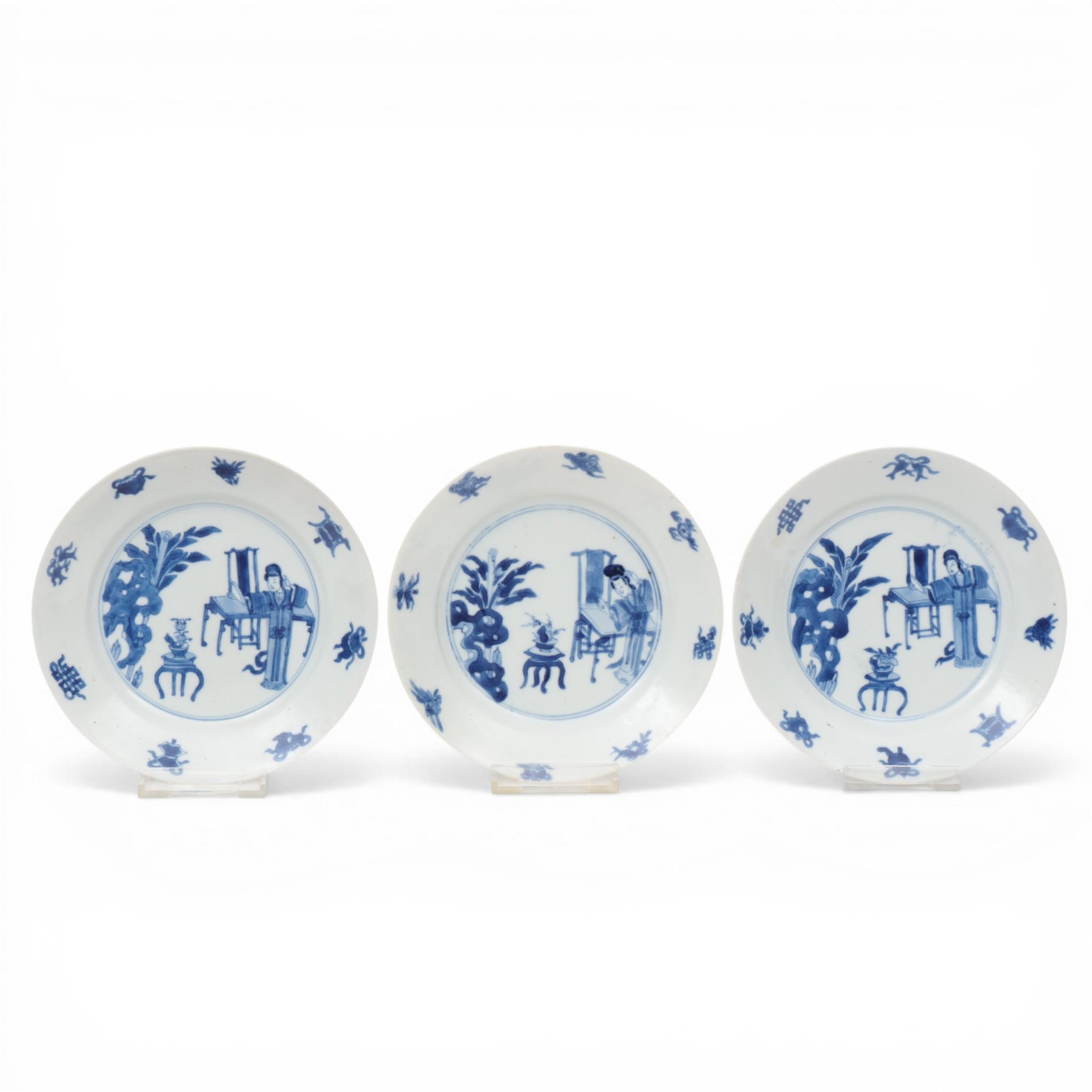 each painted with a lady adjusting her hair in an interior, the rim with the eight buddhist symbols, the bases with four-character marks