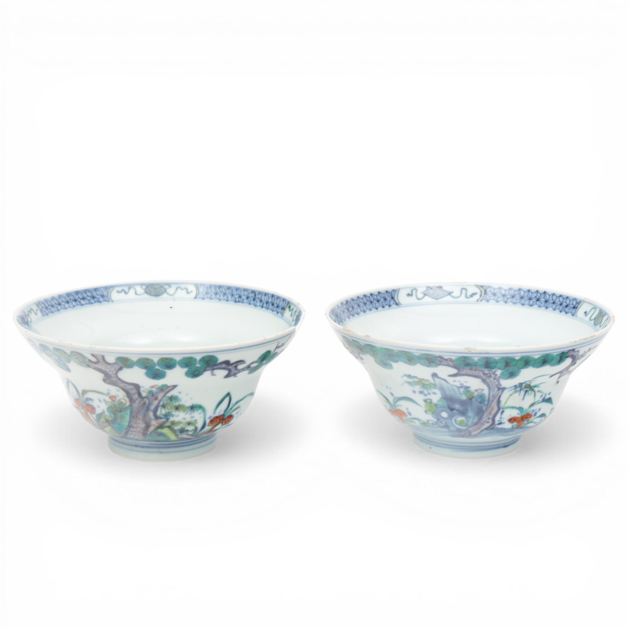 painted with lingzhi fungus below pine trees (one chipped, rim frits)