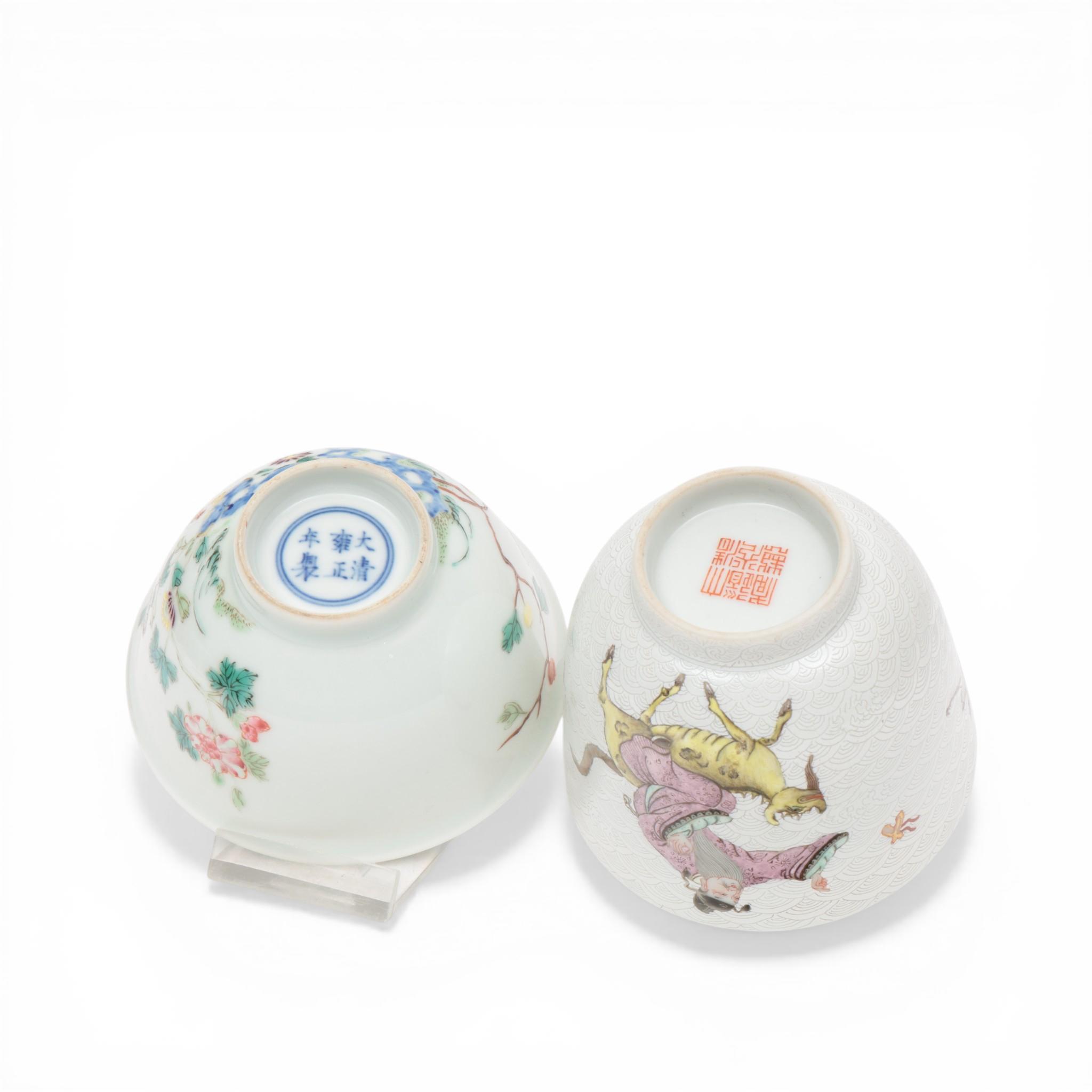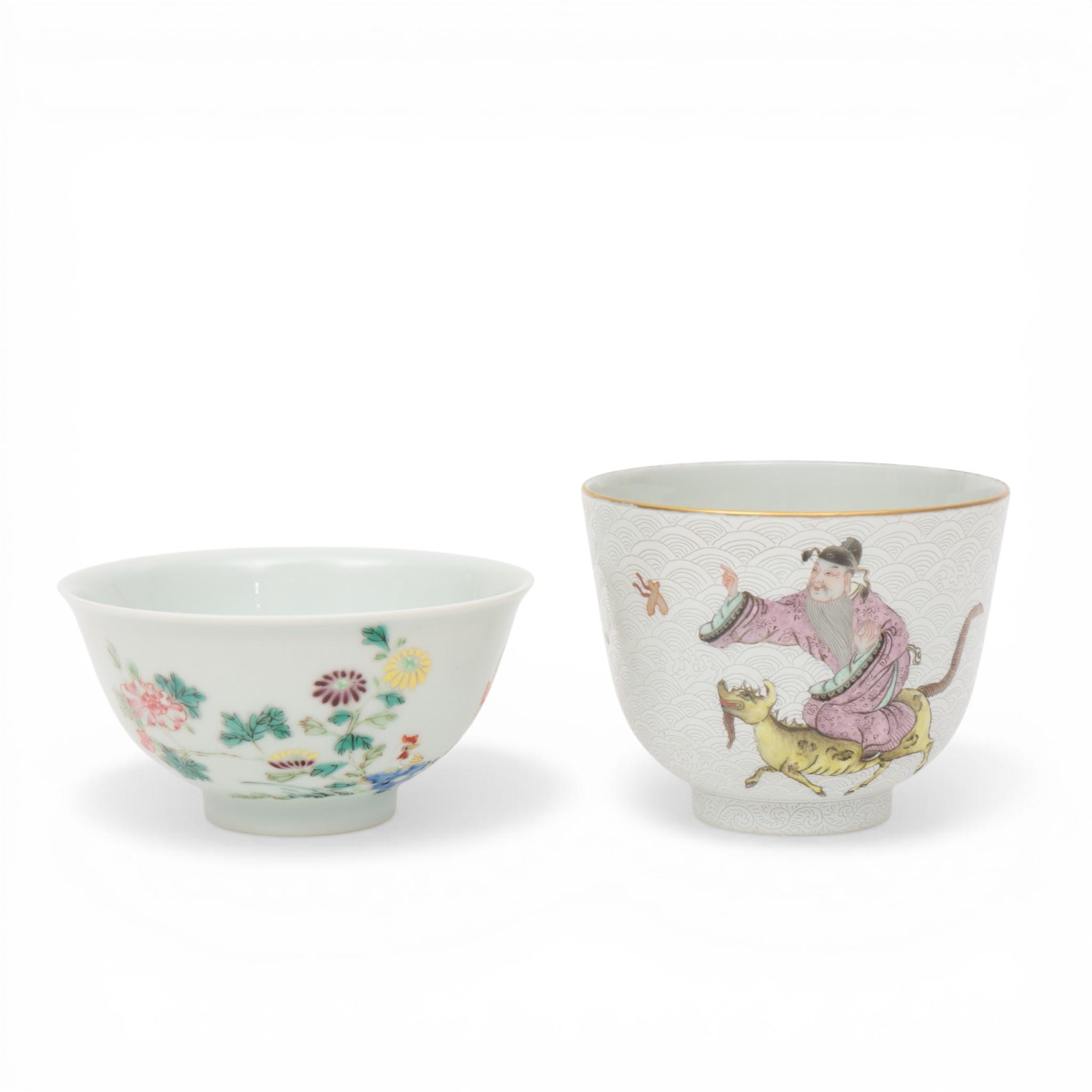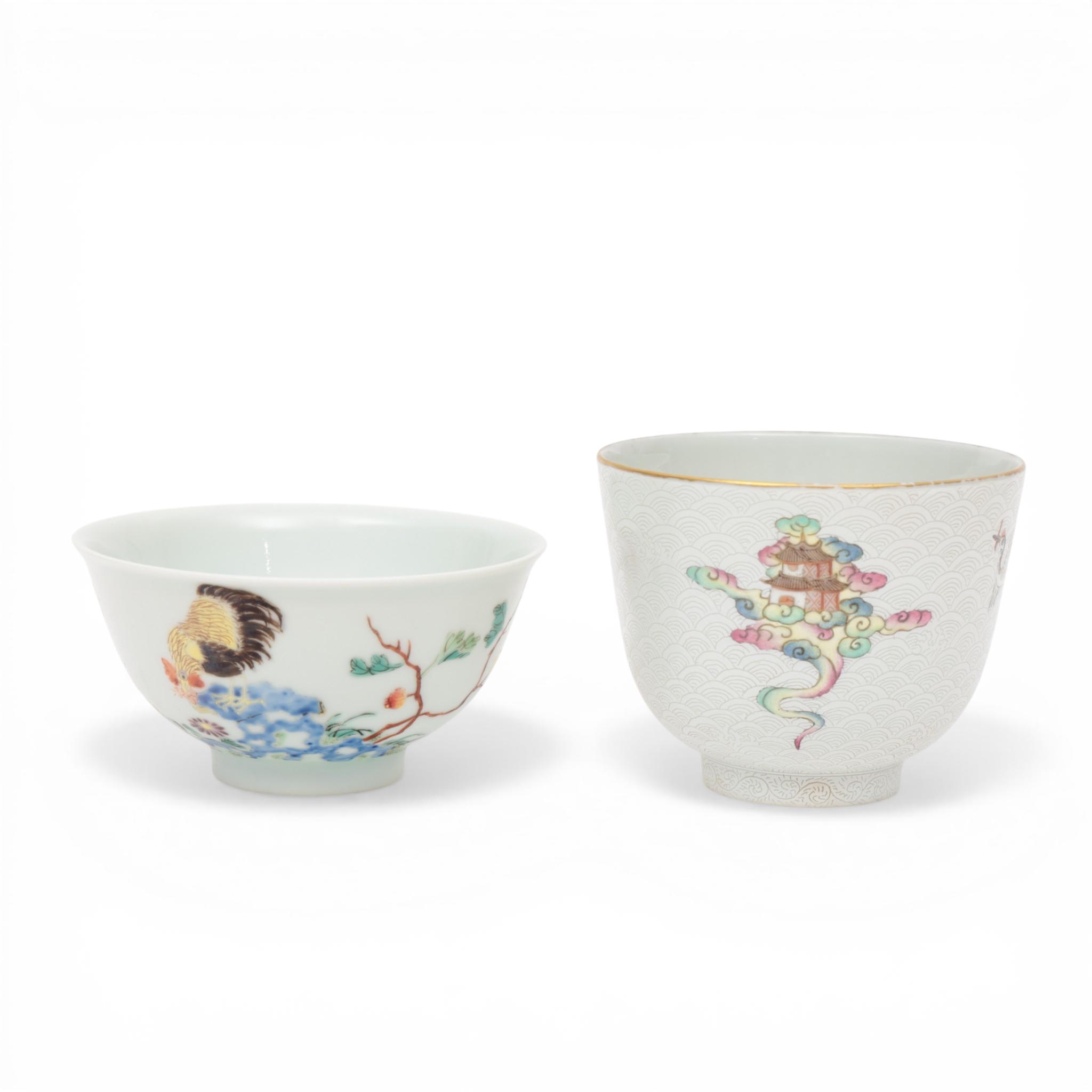one painted with an Immortal seated on a mythological animal, with apocryphal Daoguang mark, and the other with a cockerel in a rockwork garden, with apocryphal Yongzheng mark