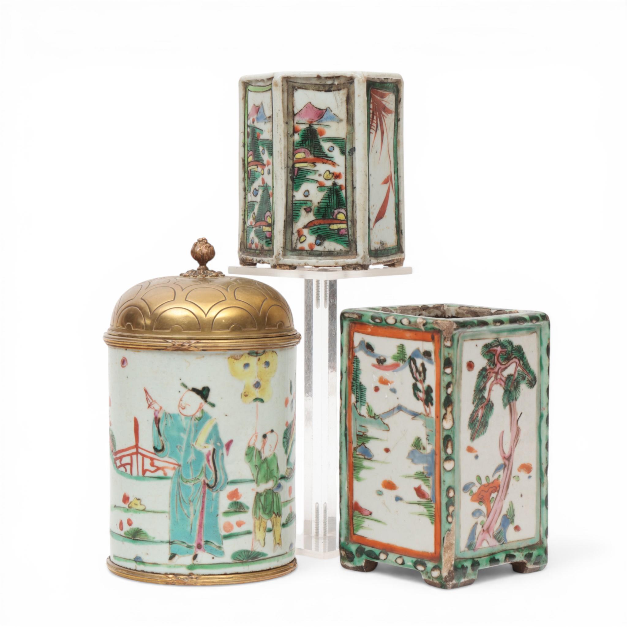 one cylindrical and mounted with brass cover, one square-sectioned and one of hexagonal shape (various hairlines, chips and small damages)