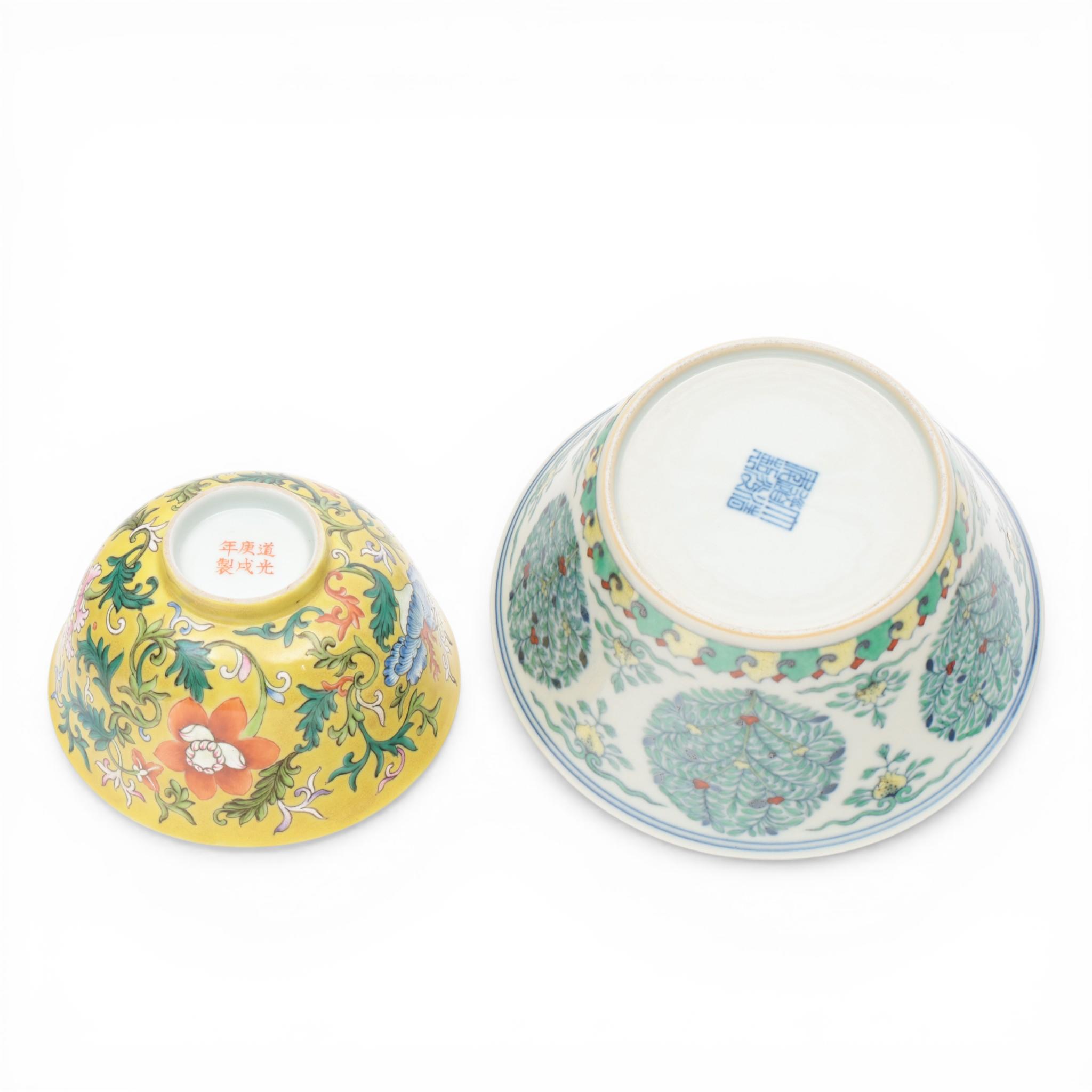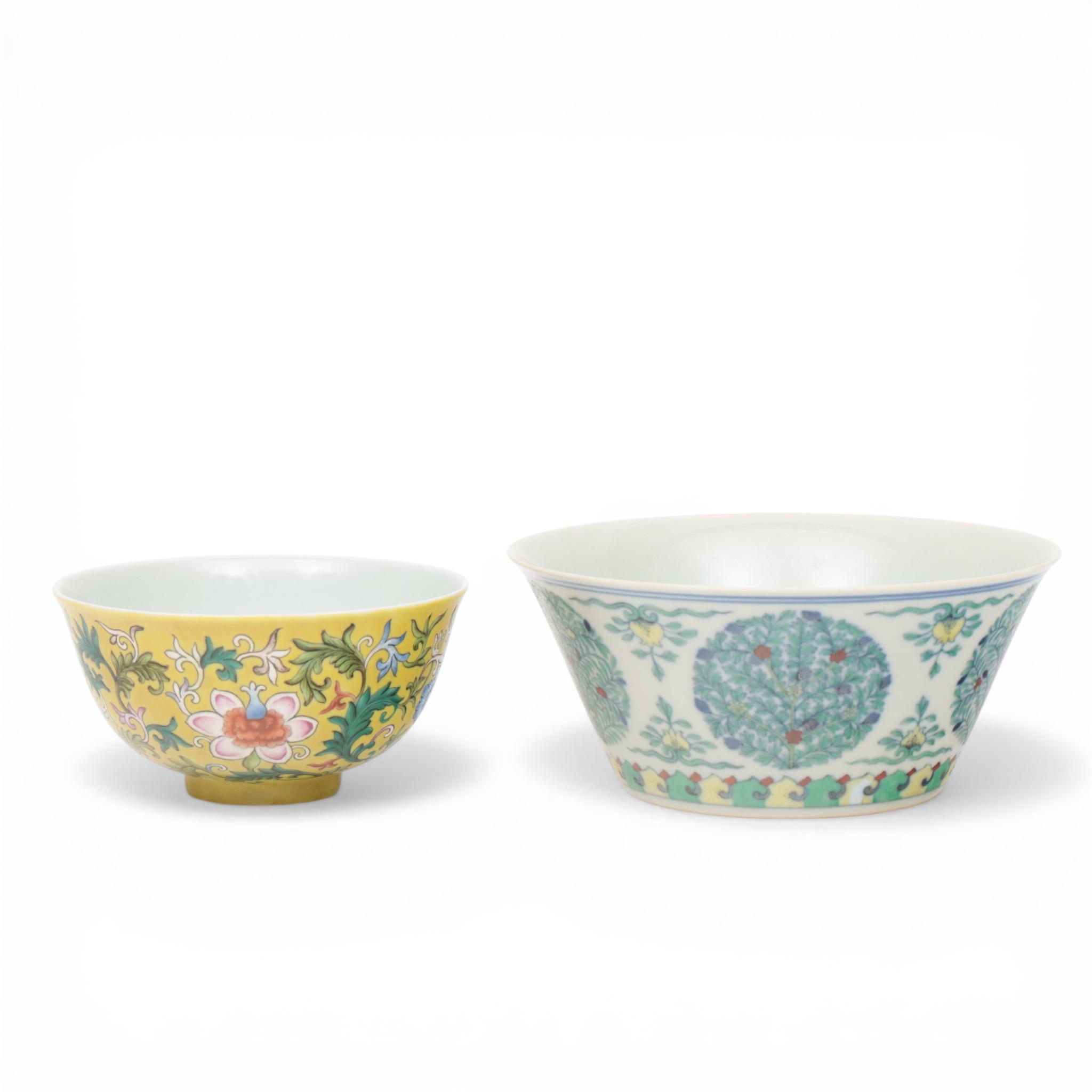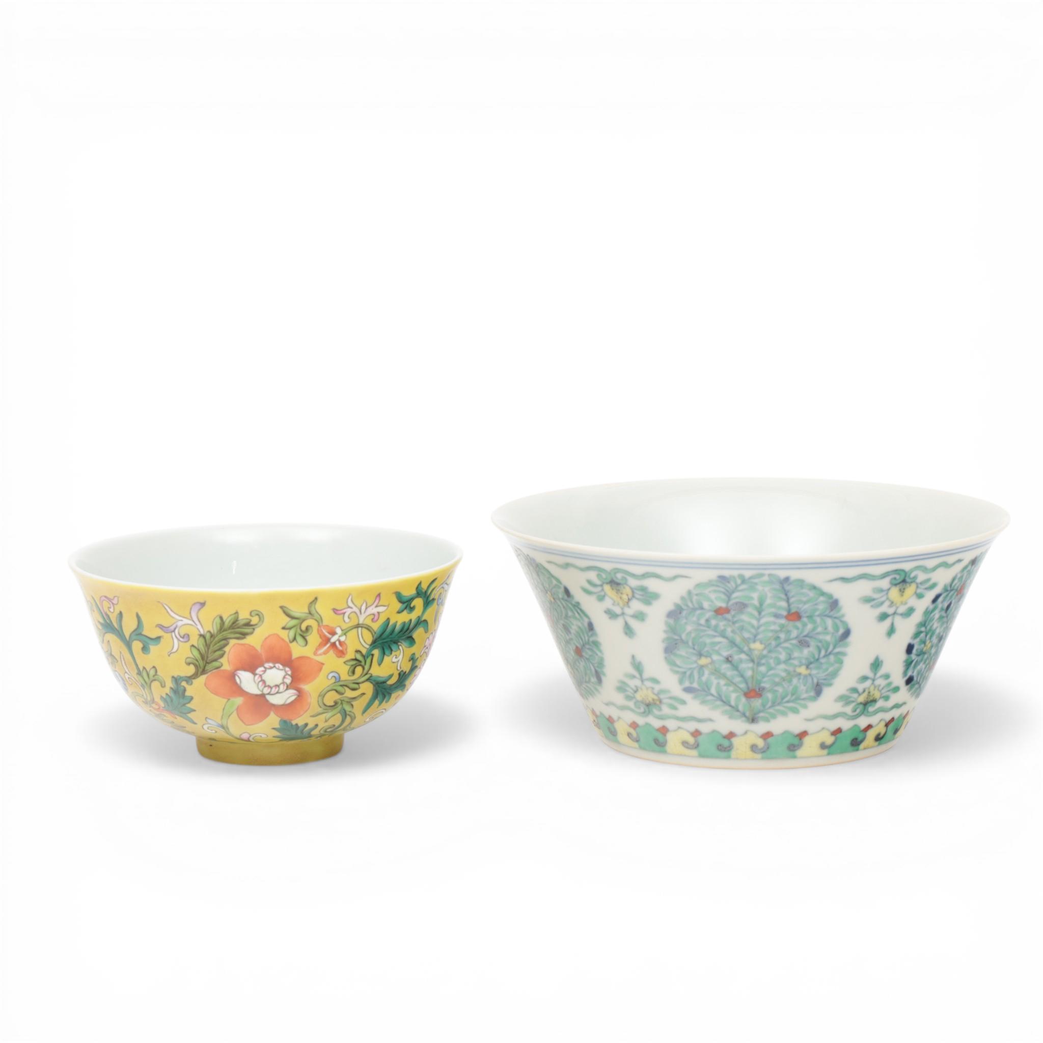 one yellow-ground and painted with flowers, and a wucai bowl with floral roundels, both with apocryphal marks