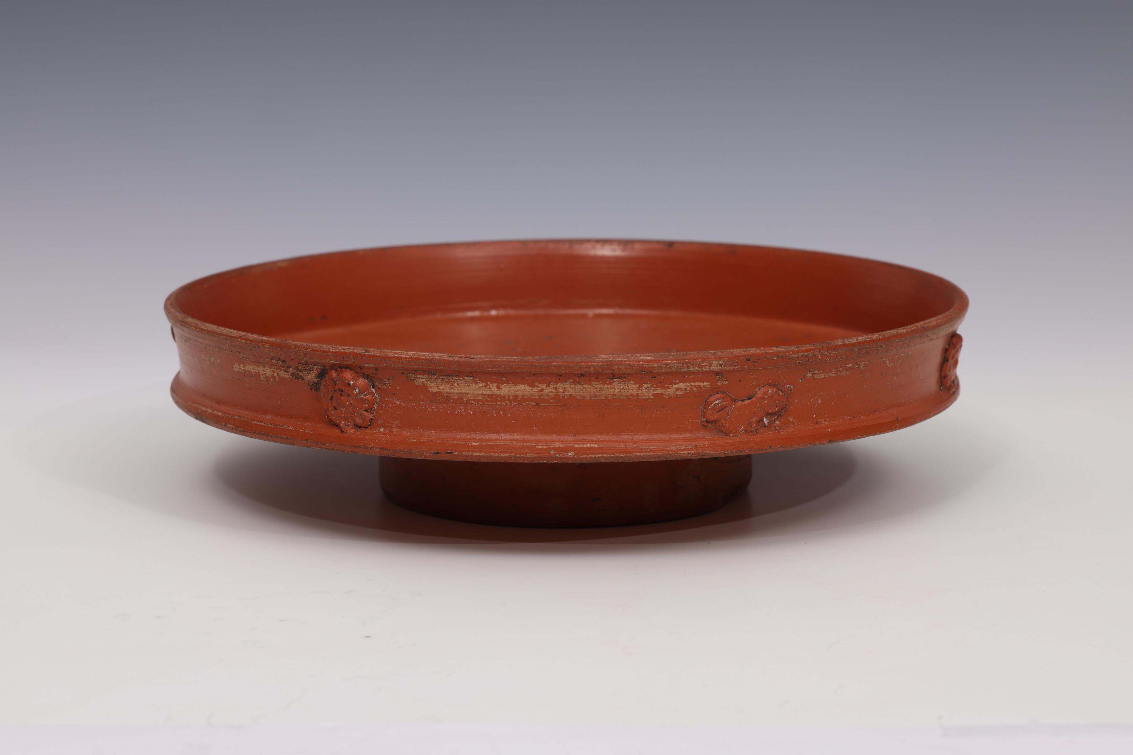 the raised rim decorated with flower and animal motifs in high relief, in the centre concentric engraved circles and oblique lines. Stamped in the centre: SEXMFE. With a fine patina, some wear and one motif partly missing. On a circulair base.