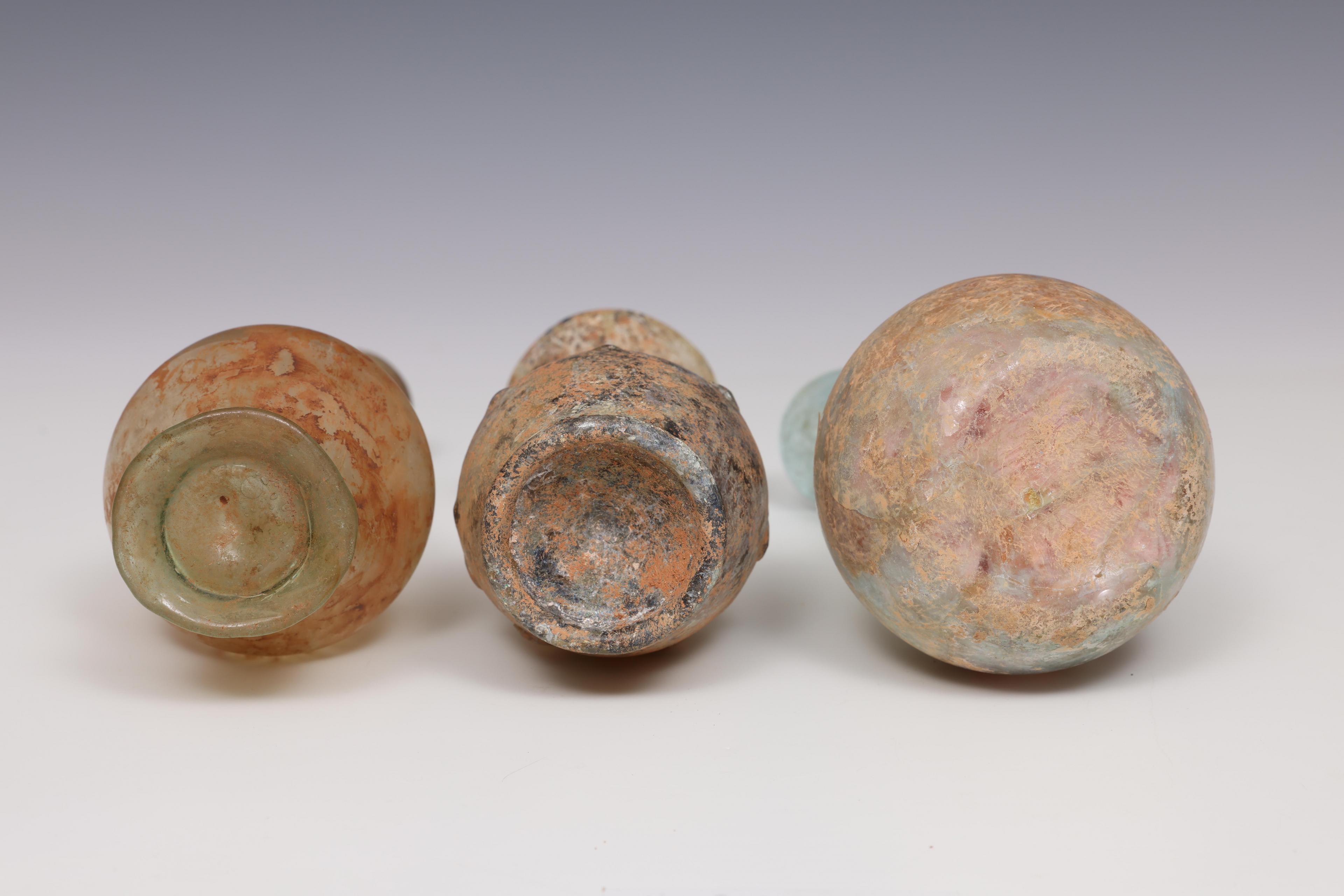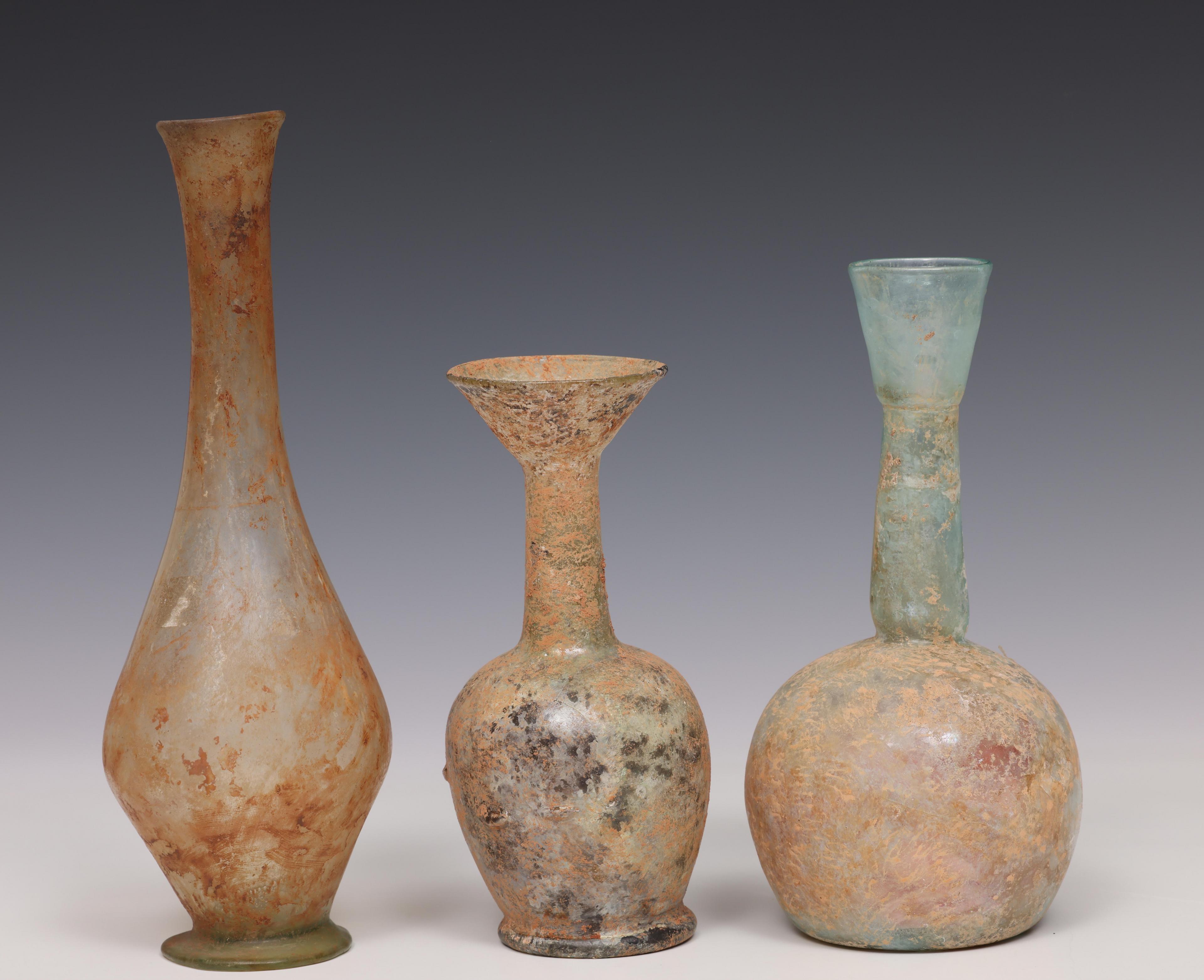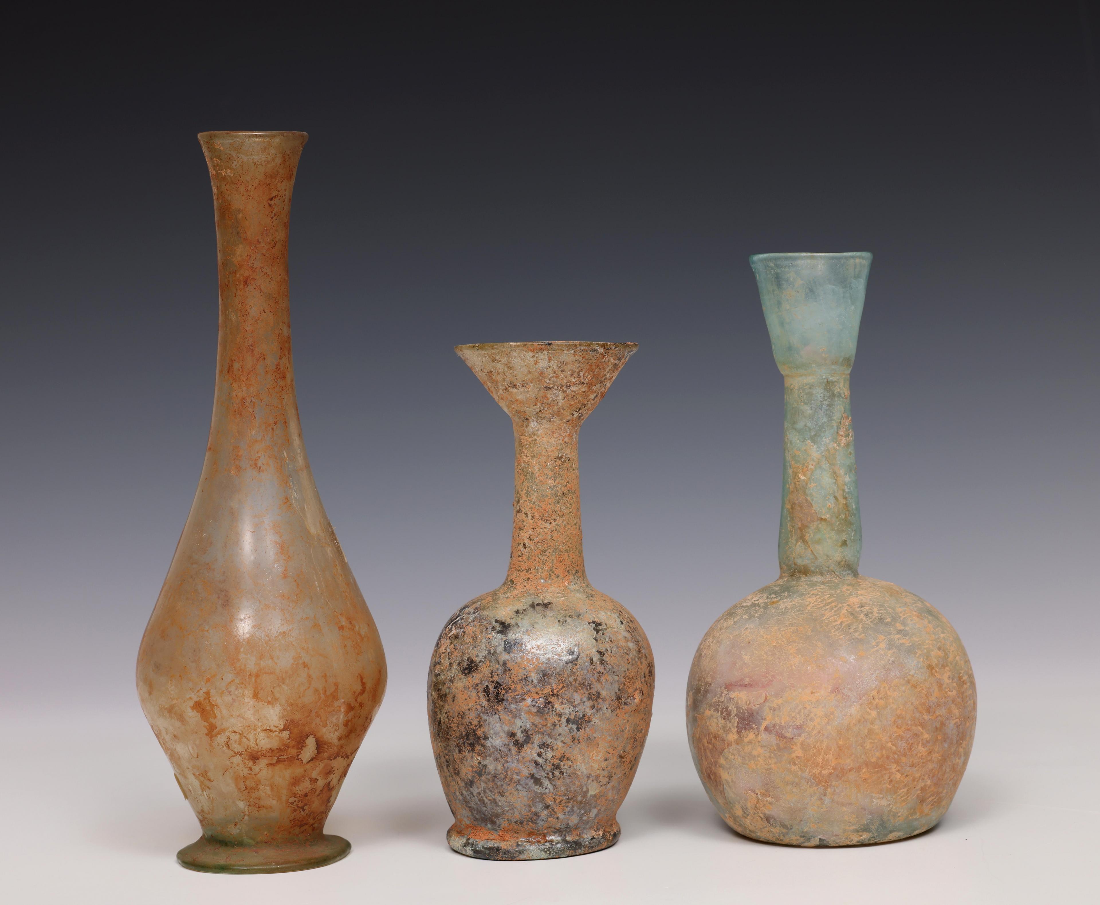 Roman glass vase with small relief knobs and two Roman glass vases, ca. 1st - 4th century CE.