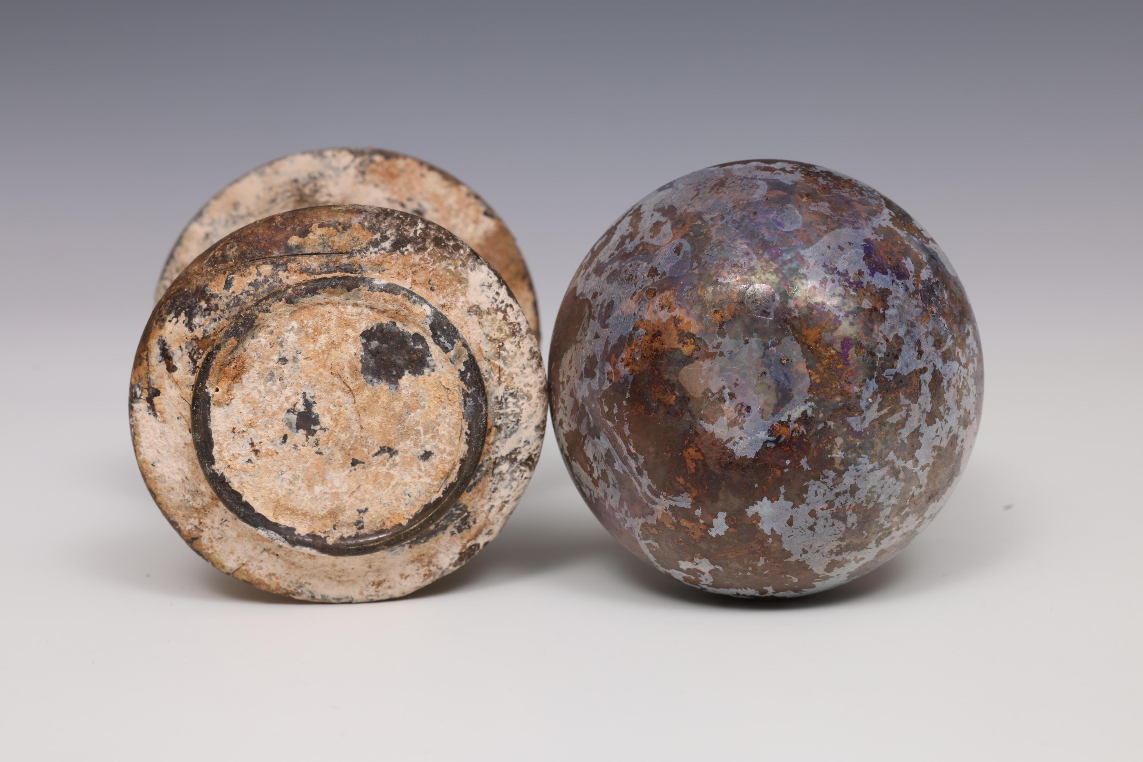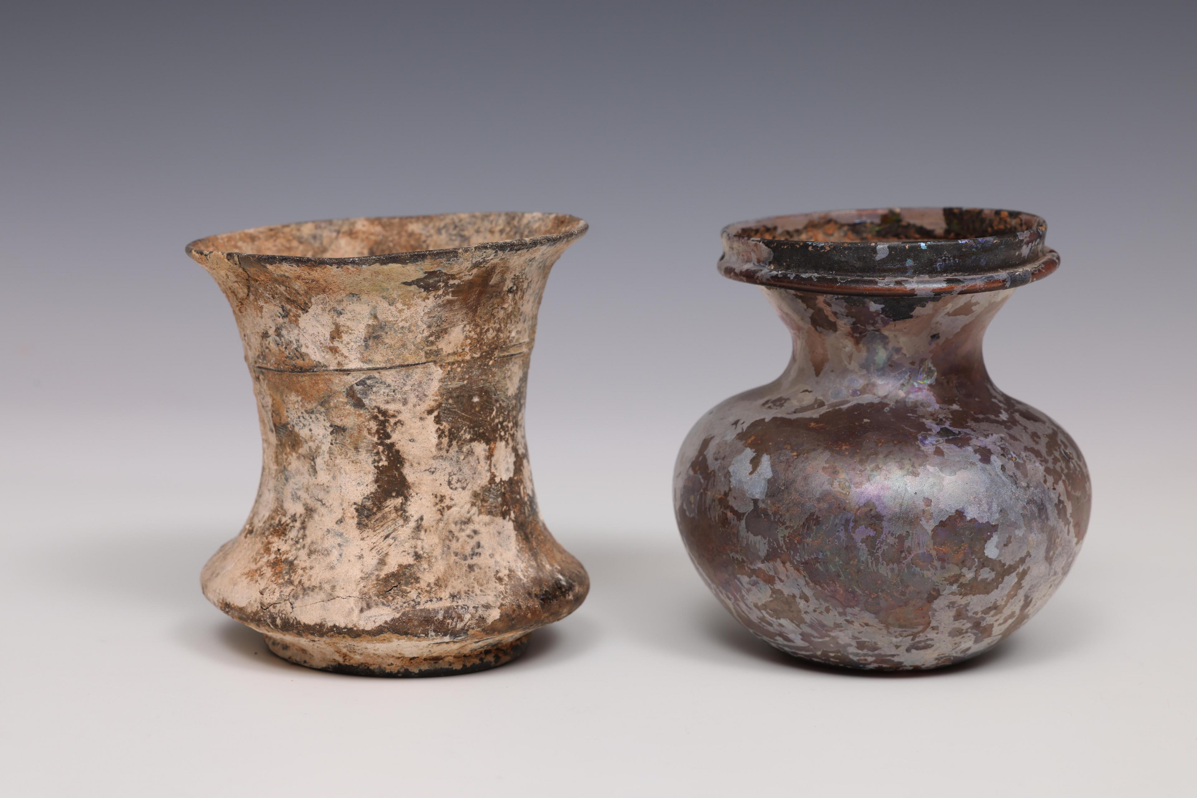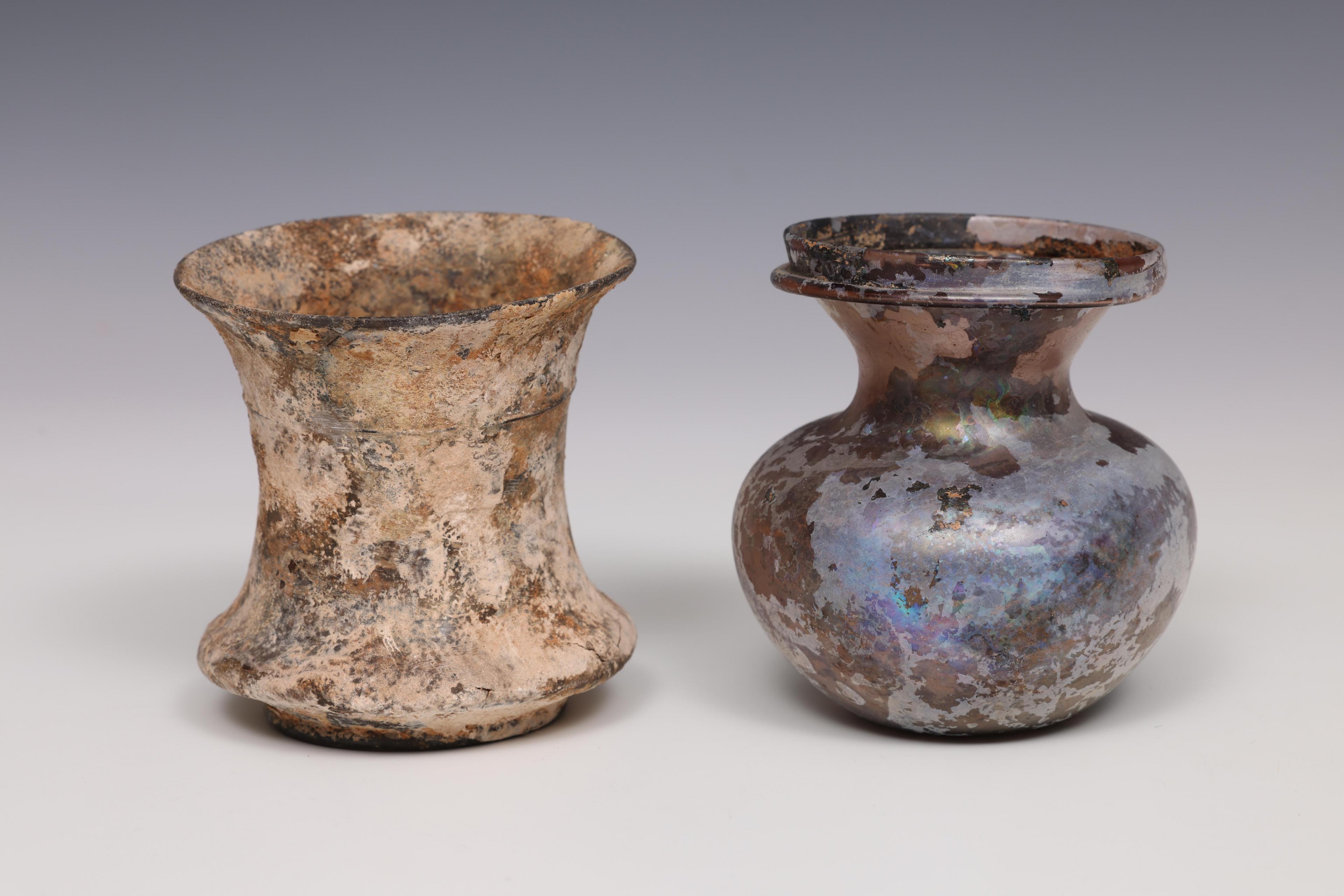 A Roman aubergine collored glass bulbous bottle and a glass beaker, 1st - 4th century CE;
