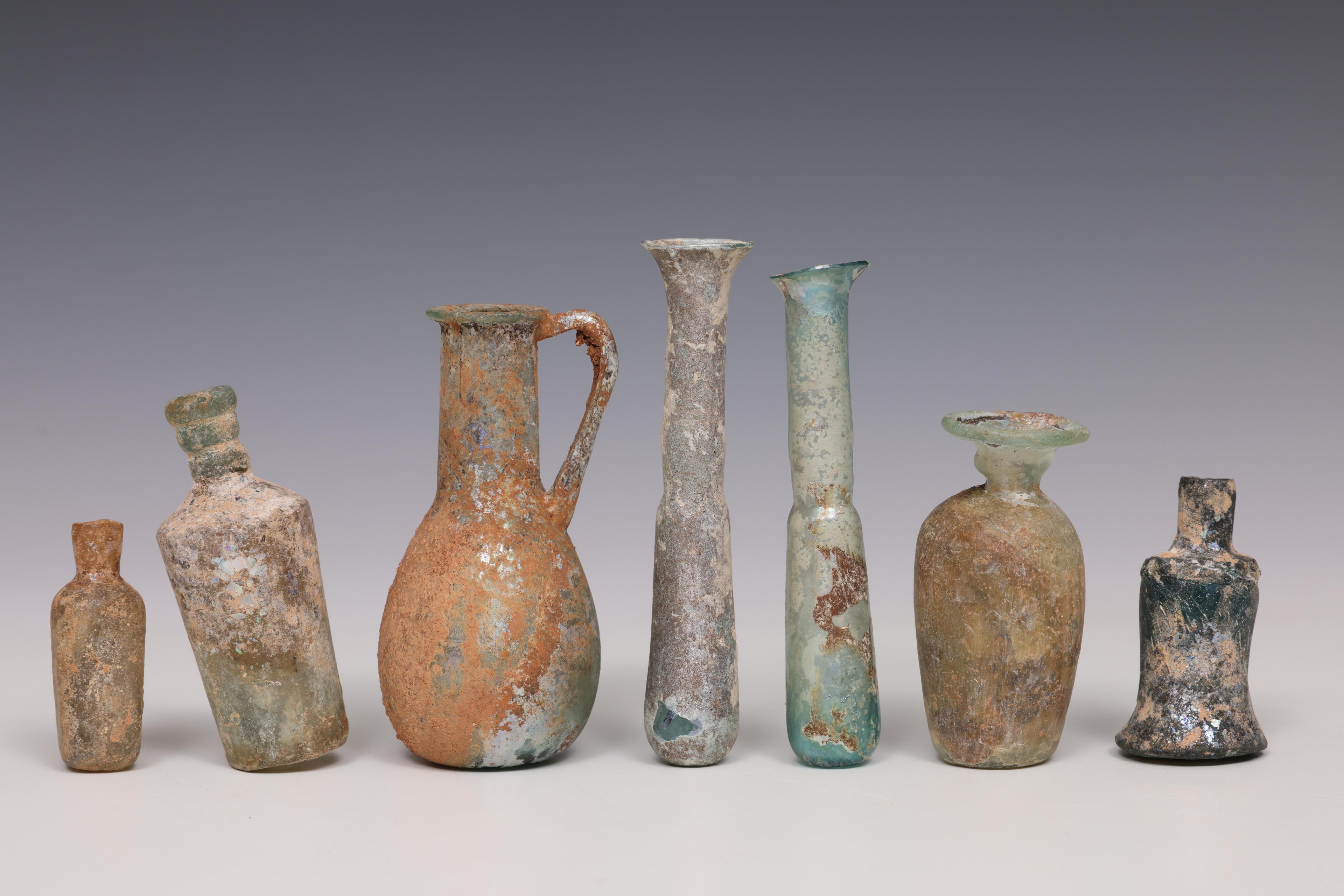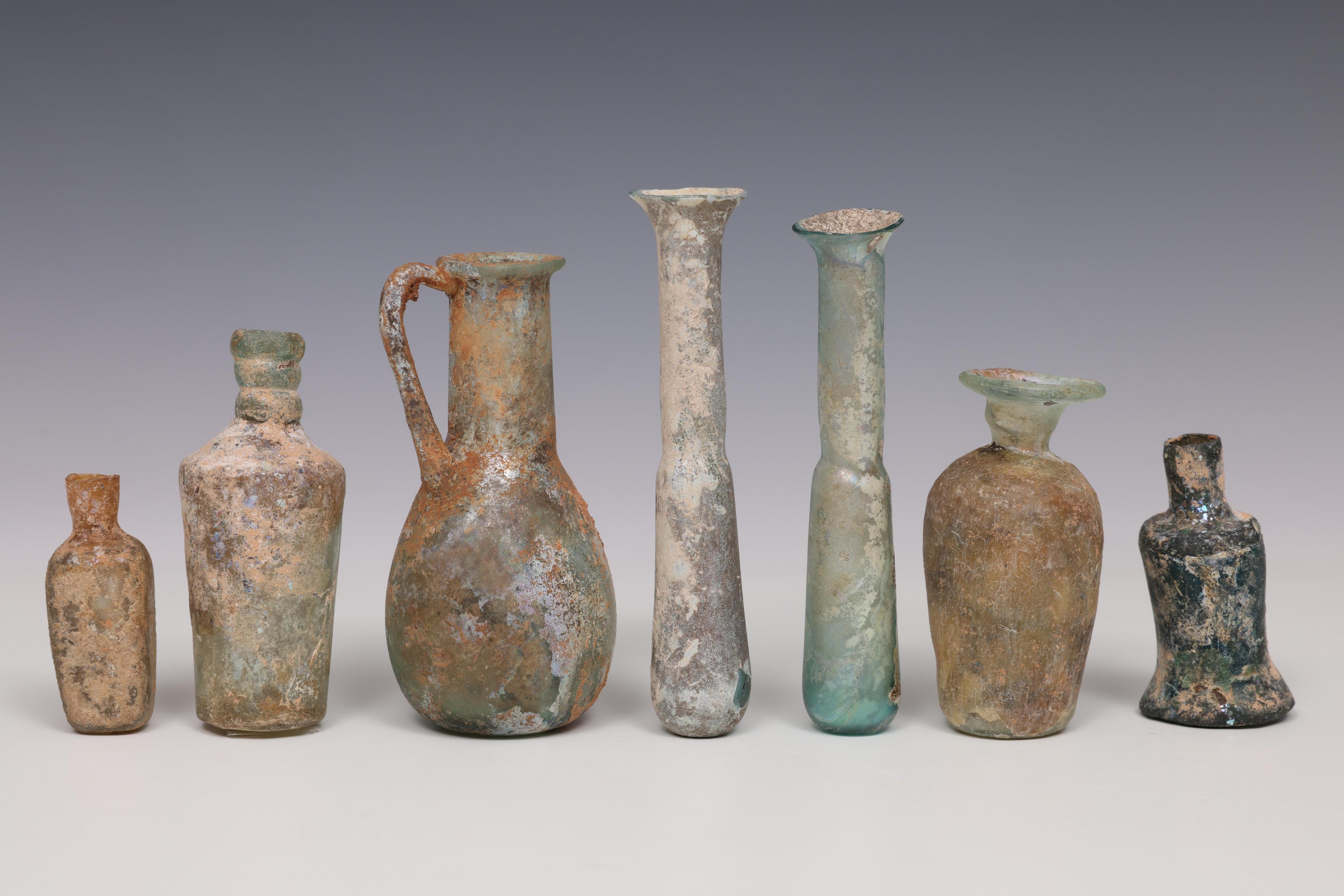 A collection of seven Roman glass flasks and small vessles, 1st - 4th century CE;