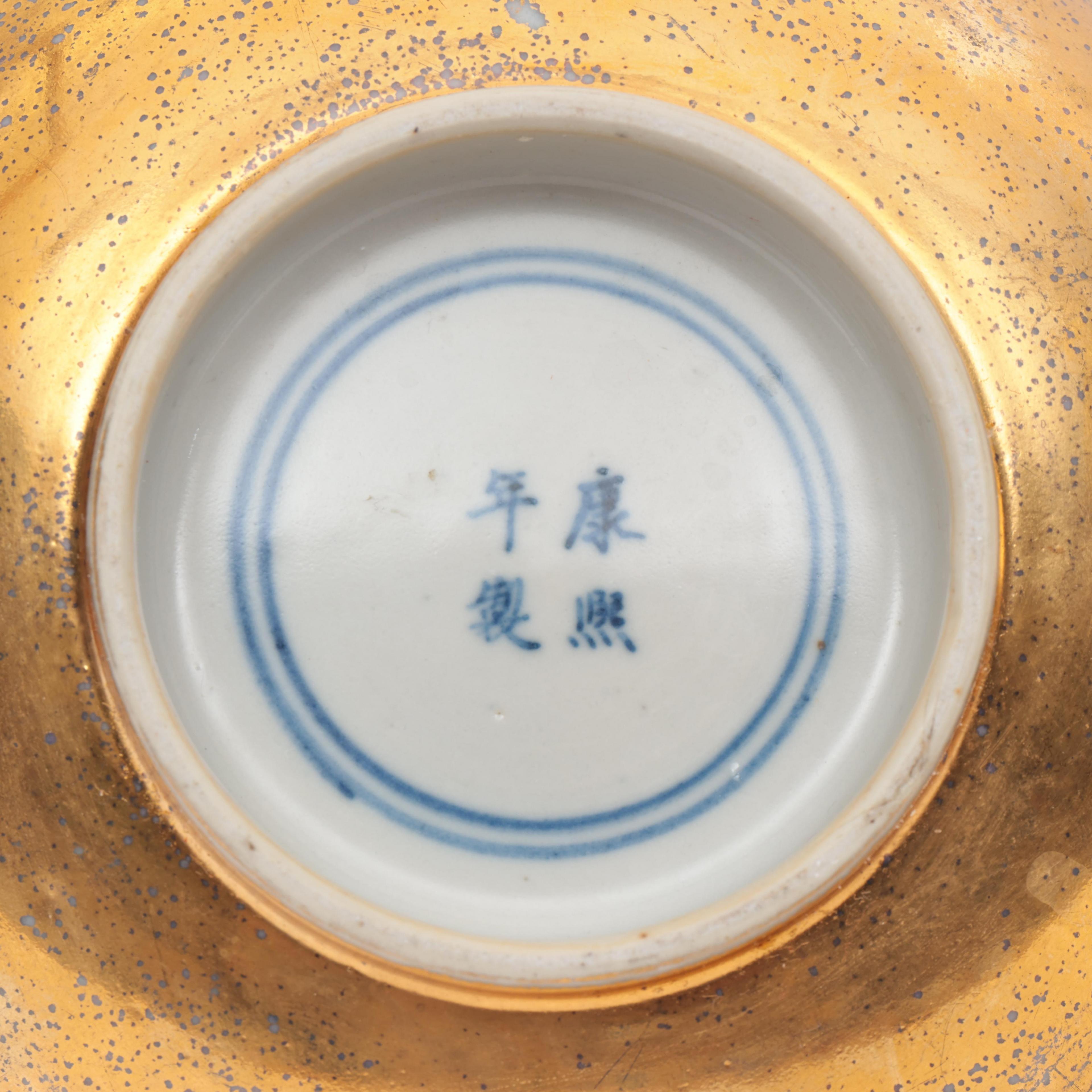 each overdecorated to the exterior with gilt, the bases with apocryphal Kangxi marks (hairlines and rim chips)