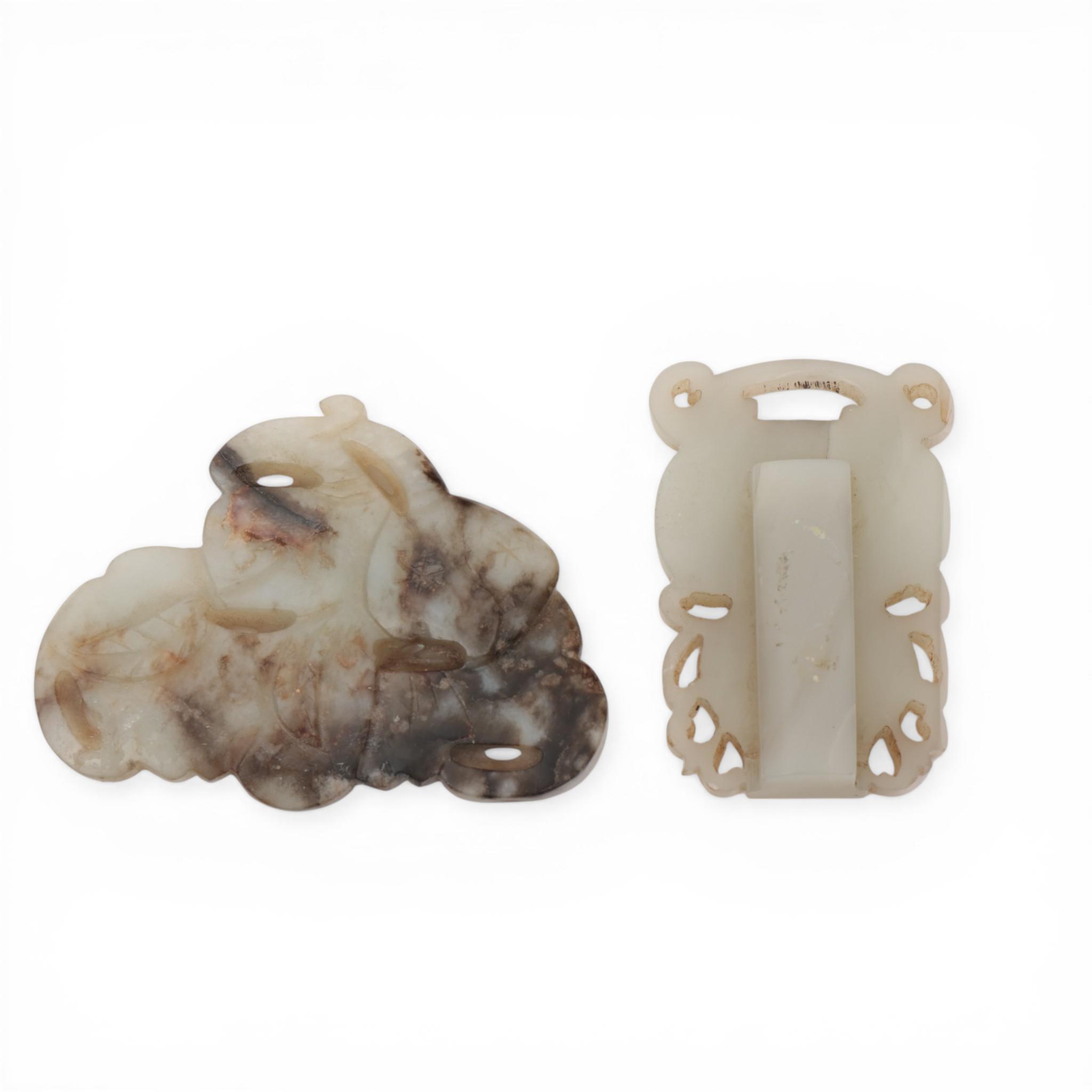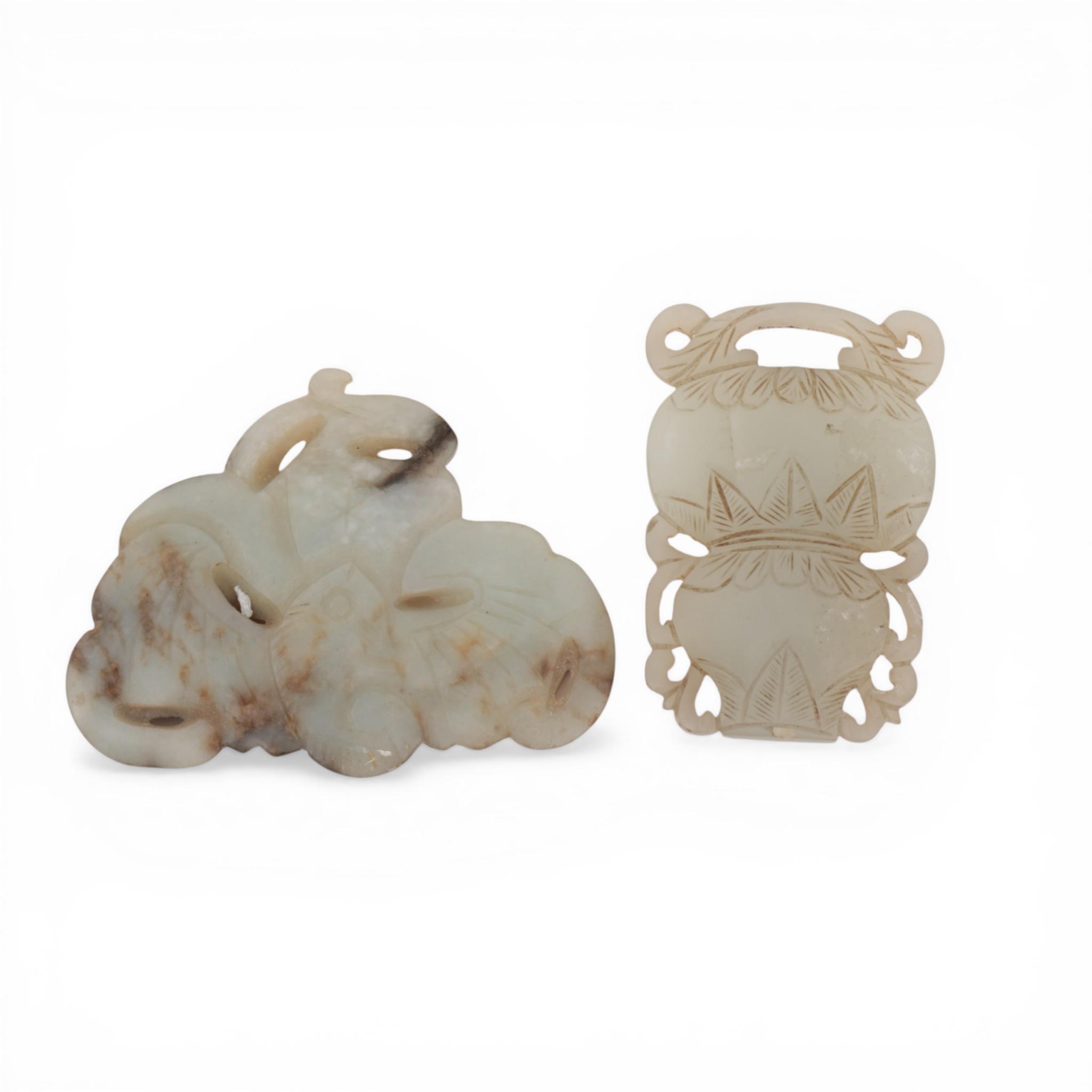 one a clasp carved as a double gourd, the other carved as a bat on fruit (some wear)