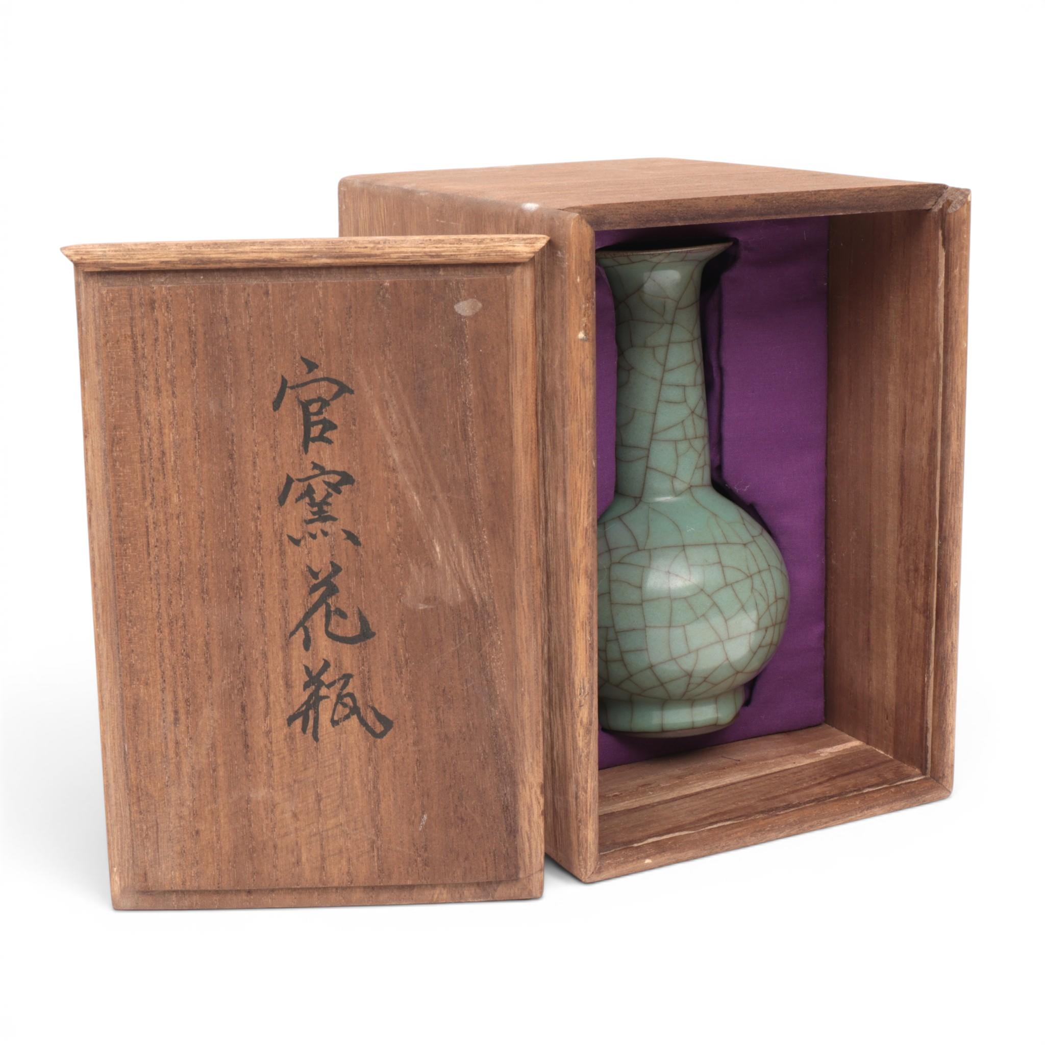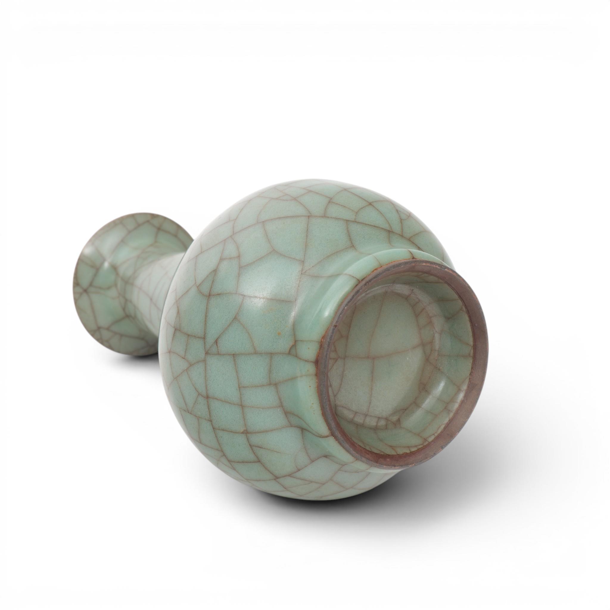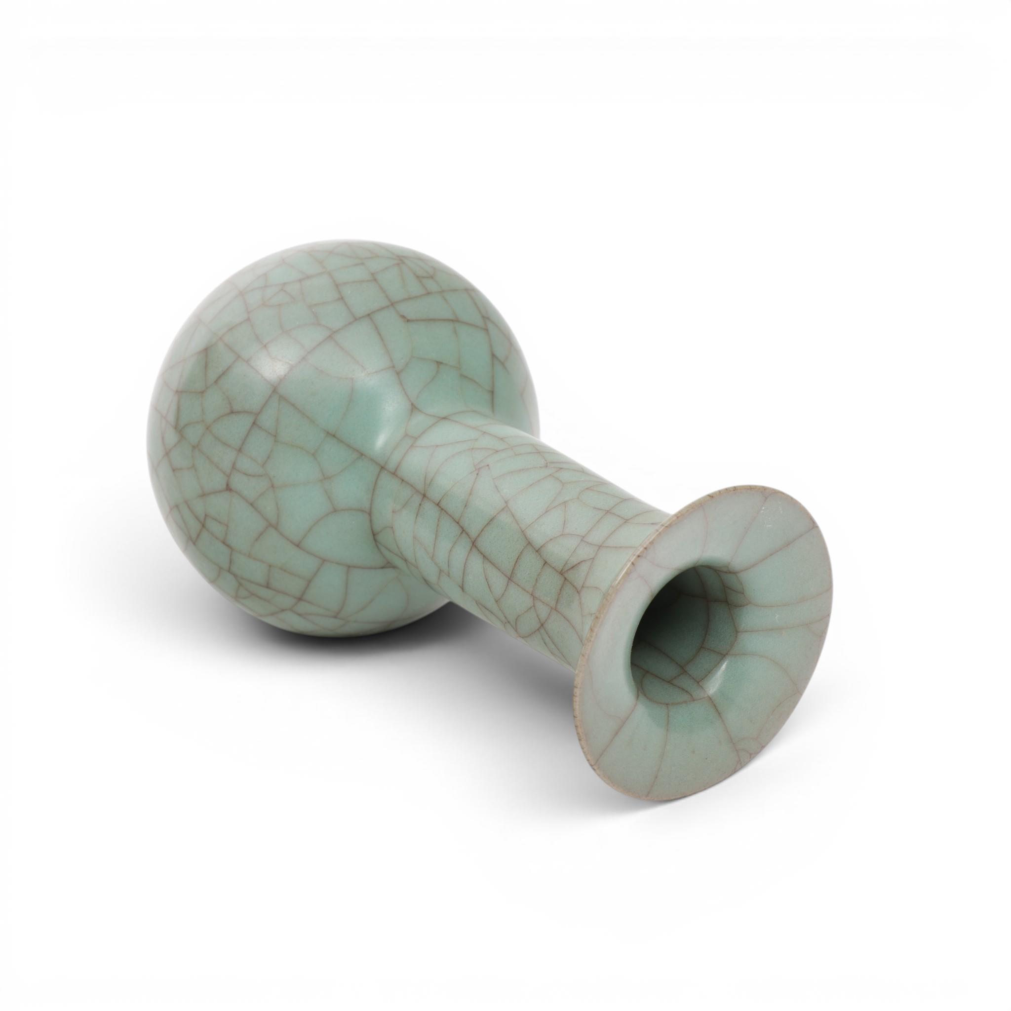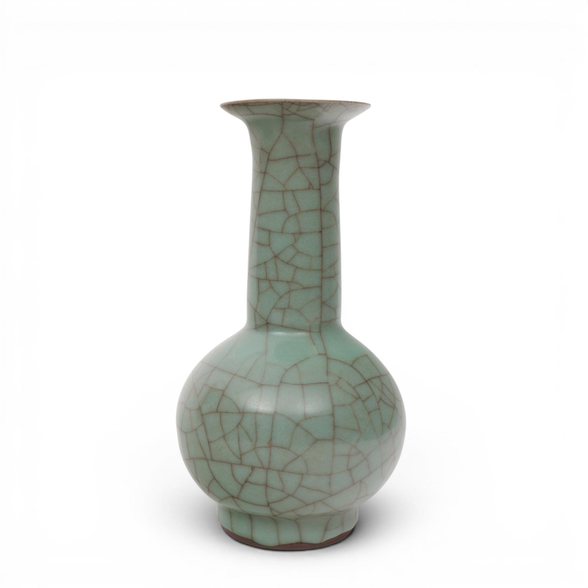 of bottle-shape with flat rim, covered with a soft sea-green glaze suffused with a network of gray crackles