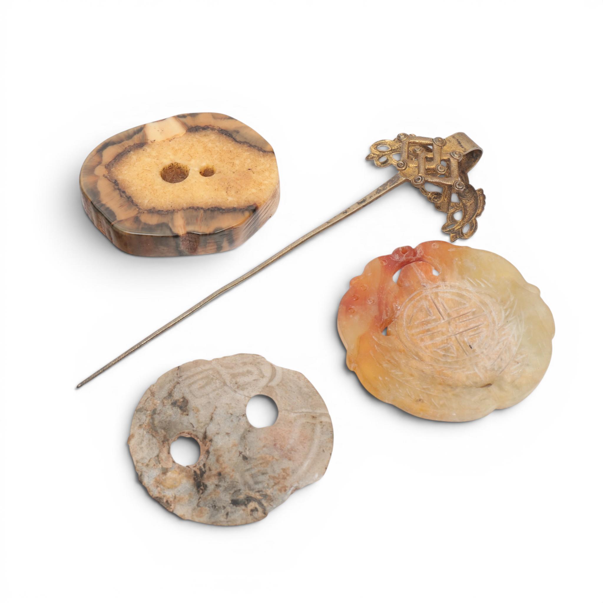 China and Japan, three stone carvings and a gilt-metal hairpin, 19th-20th century,