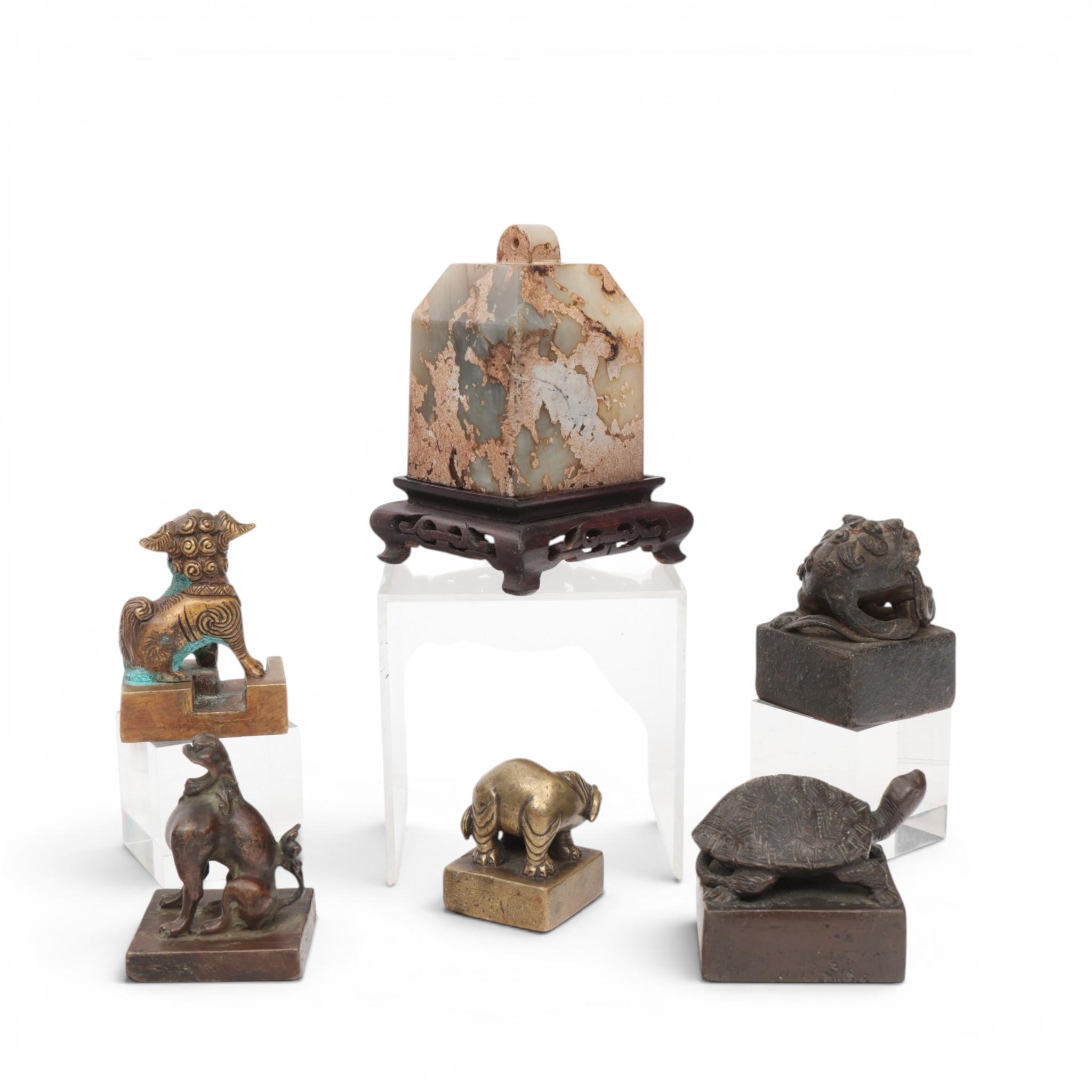 the jade seal with even canted sides, the metal seals mounted with animal finials