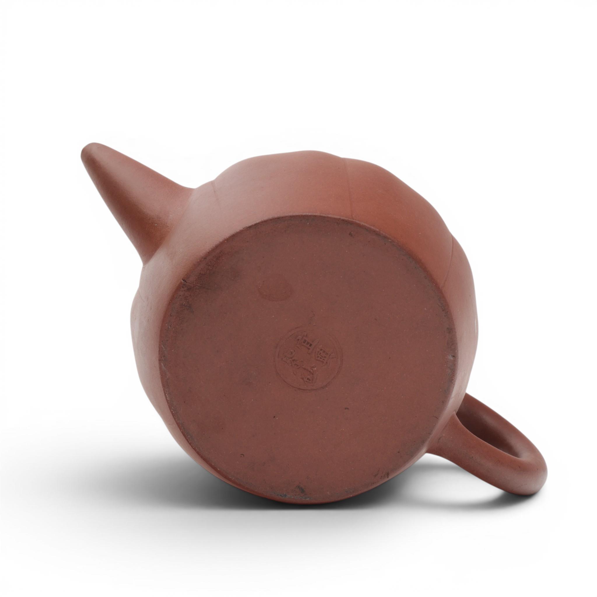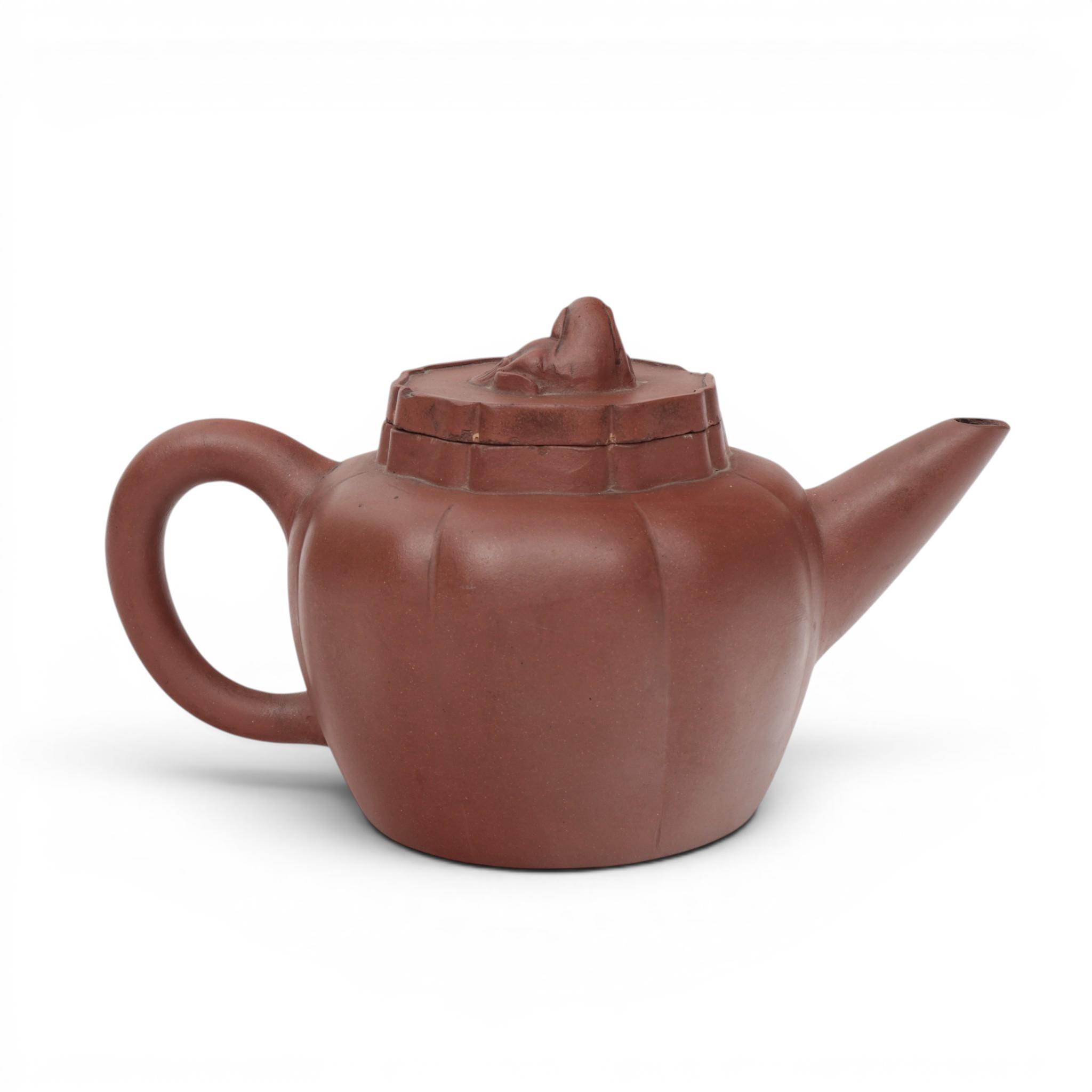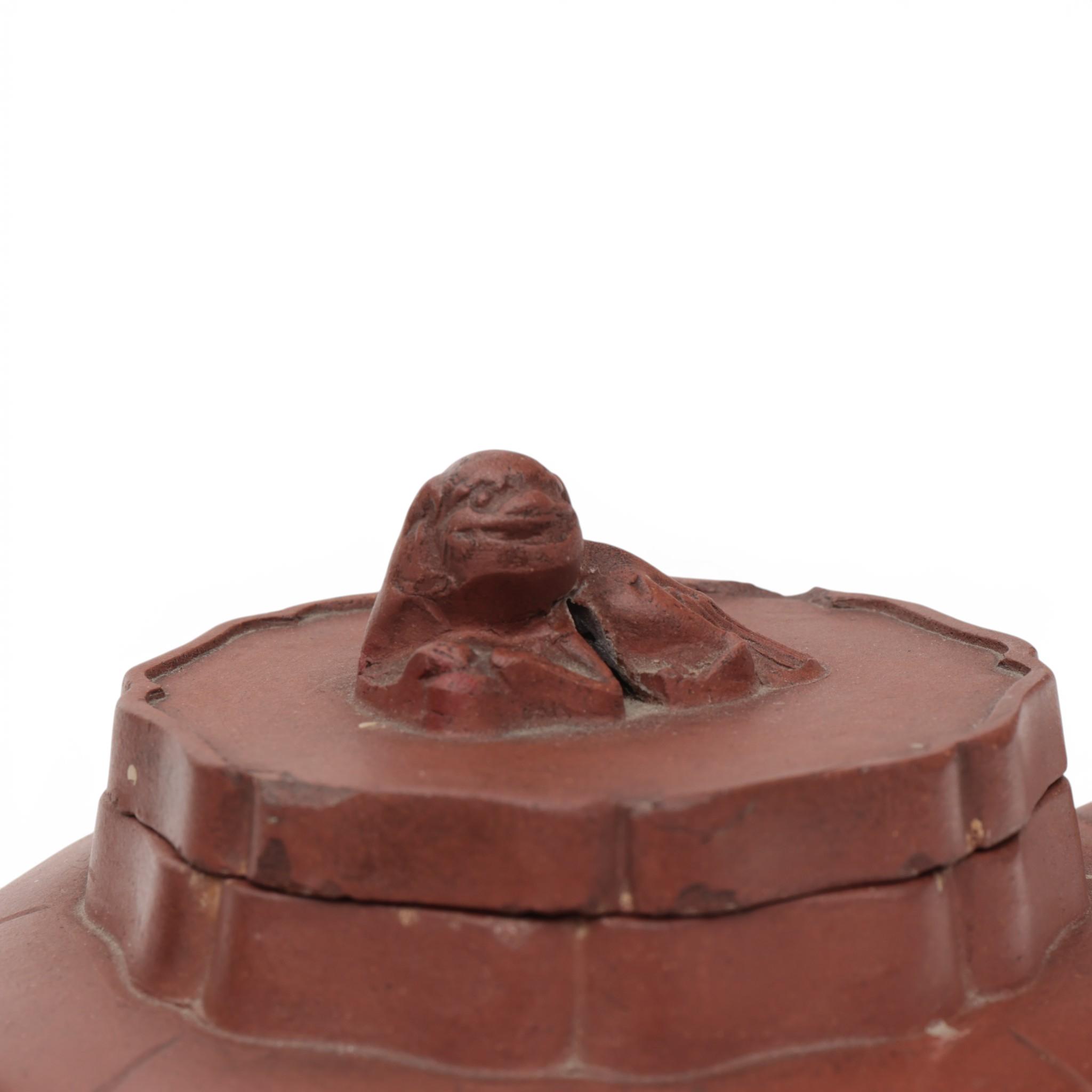 of melon shape with lobed sides, the cover with lion finial, signed (tip of spout fritted)