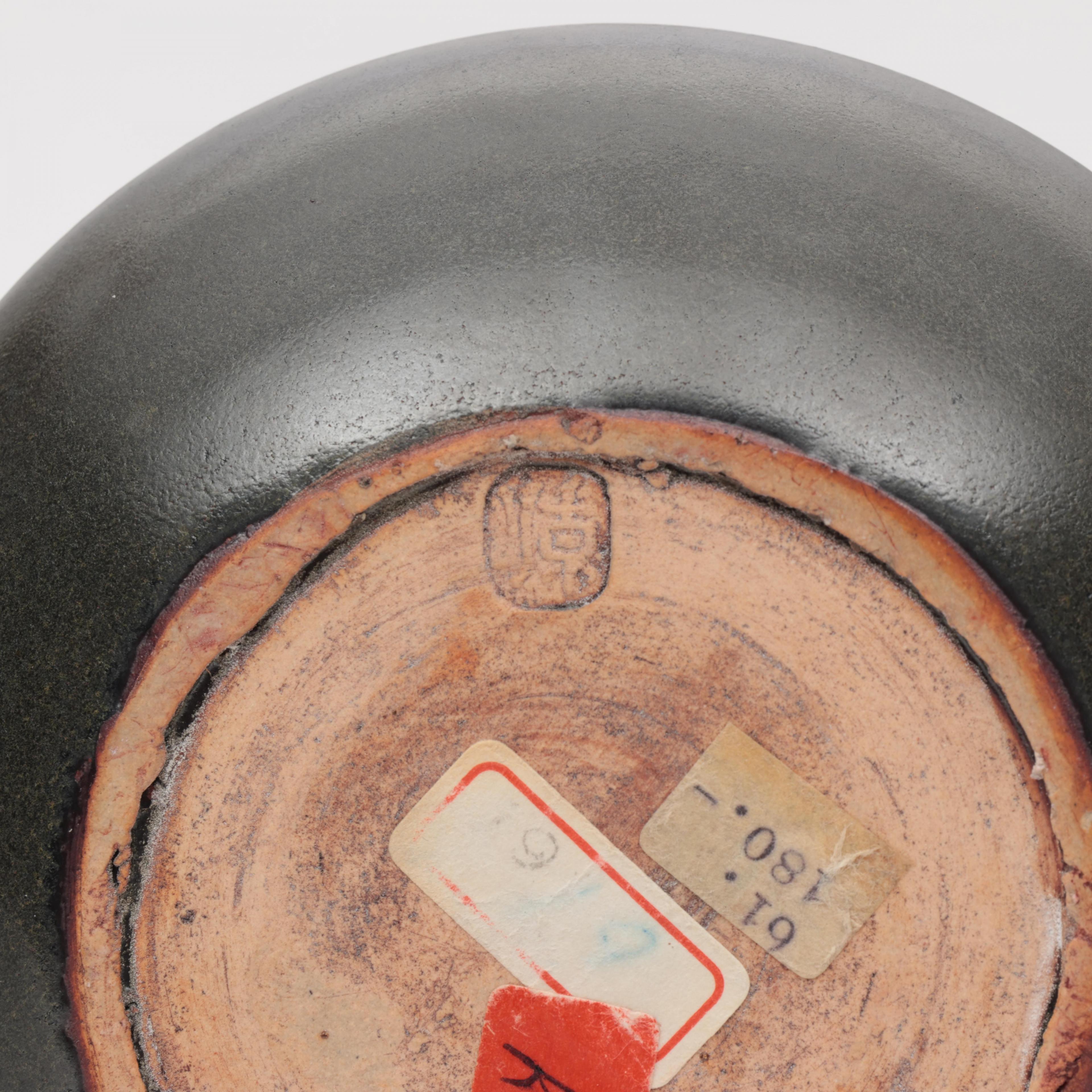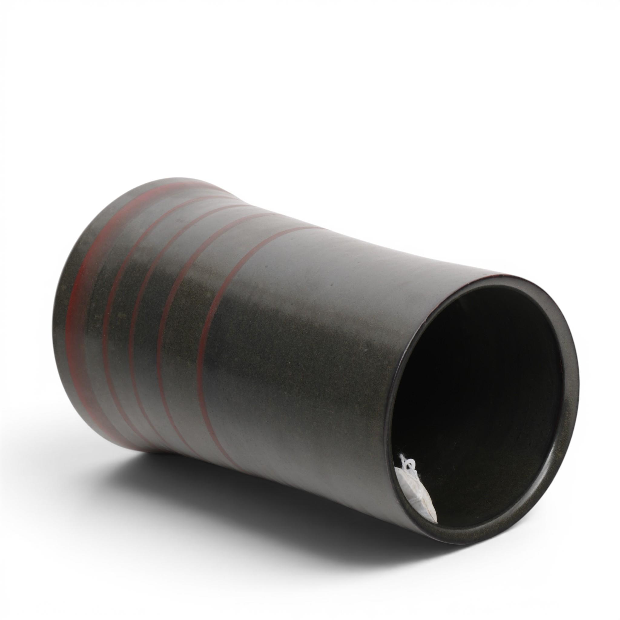 the cylindrical vase covered with a dark grey glaze embellished with red bands, stamped seal to the base