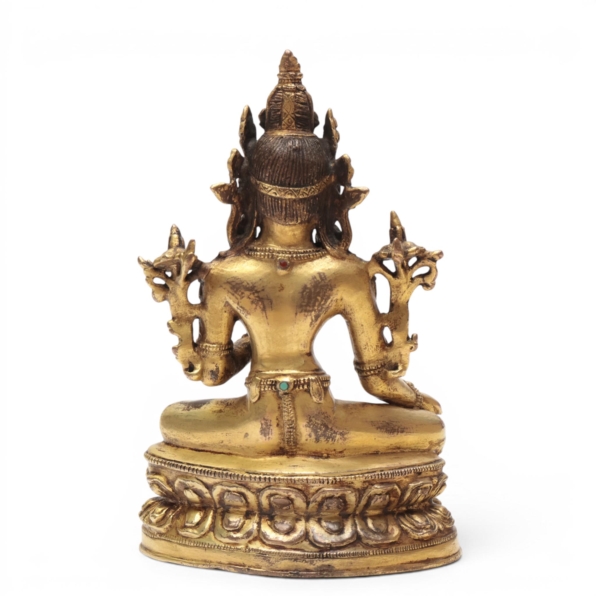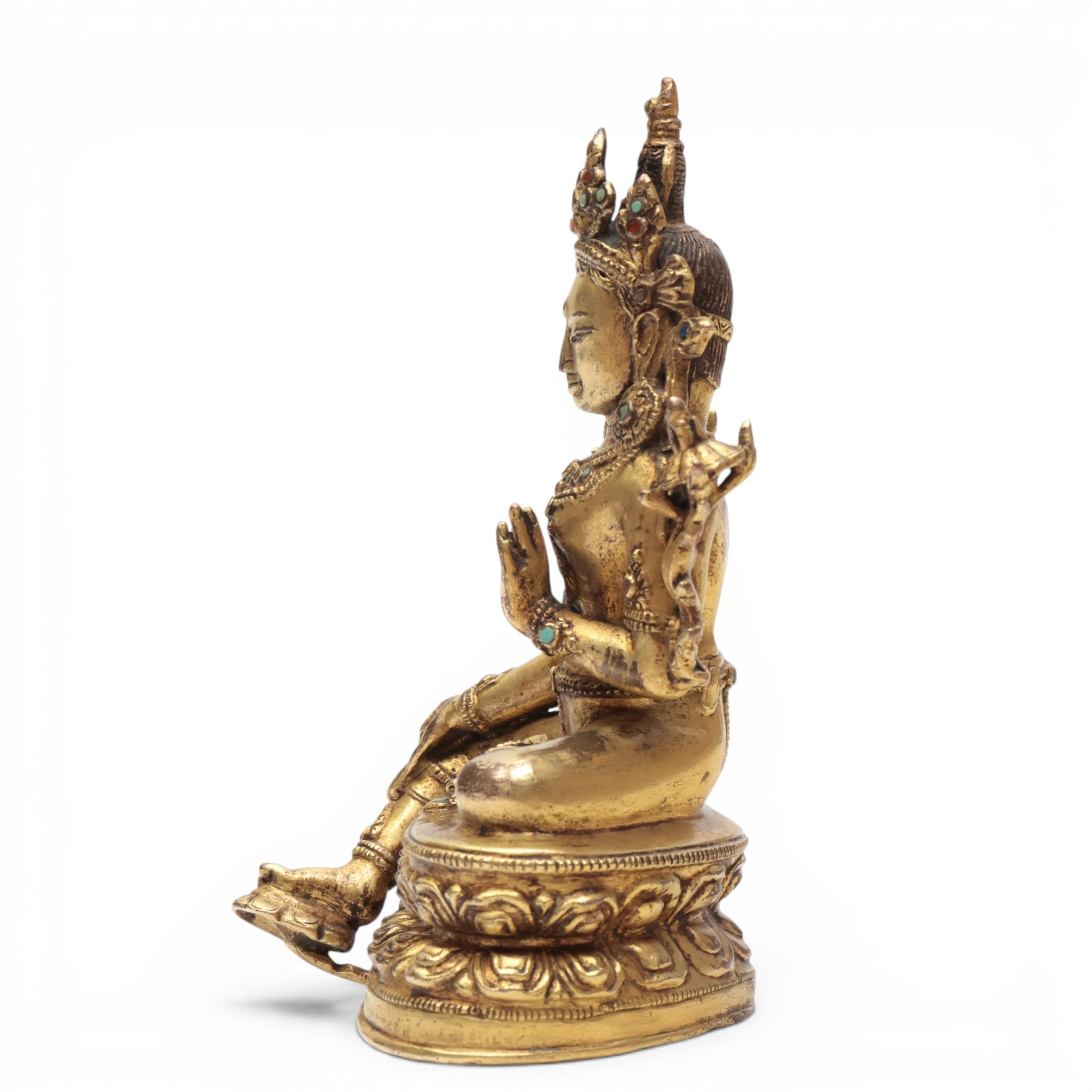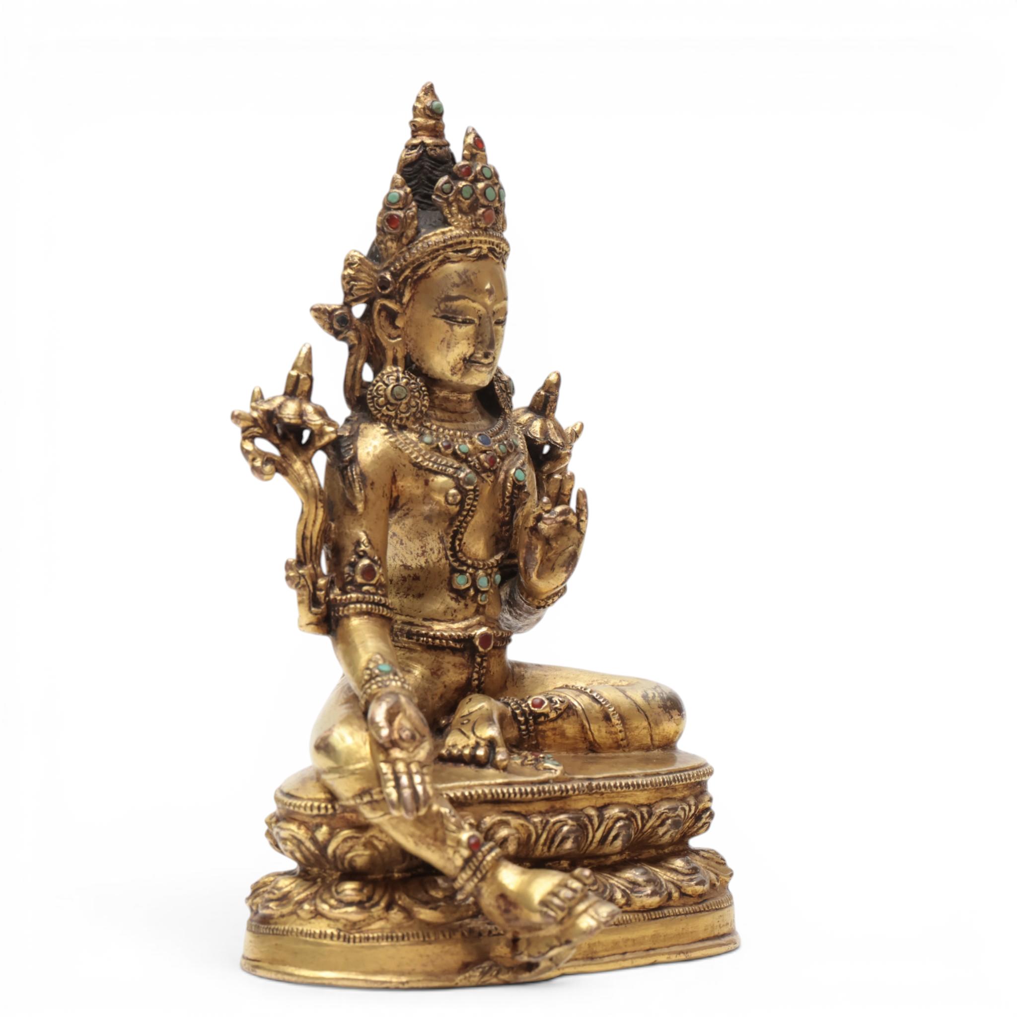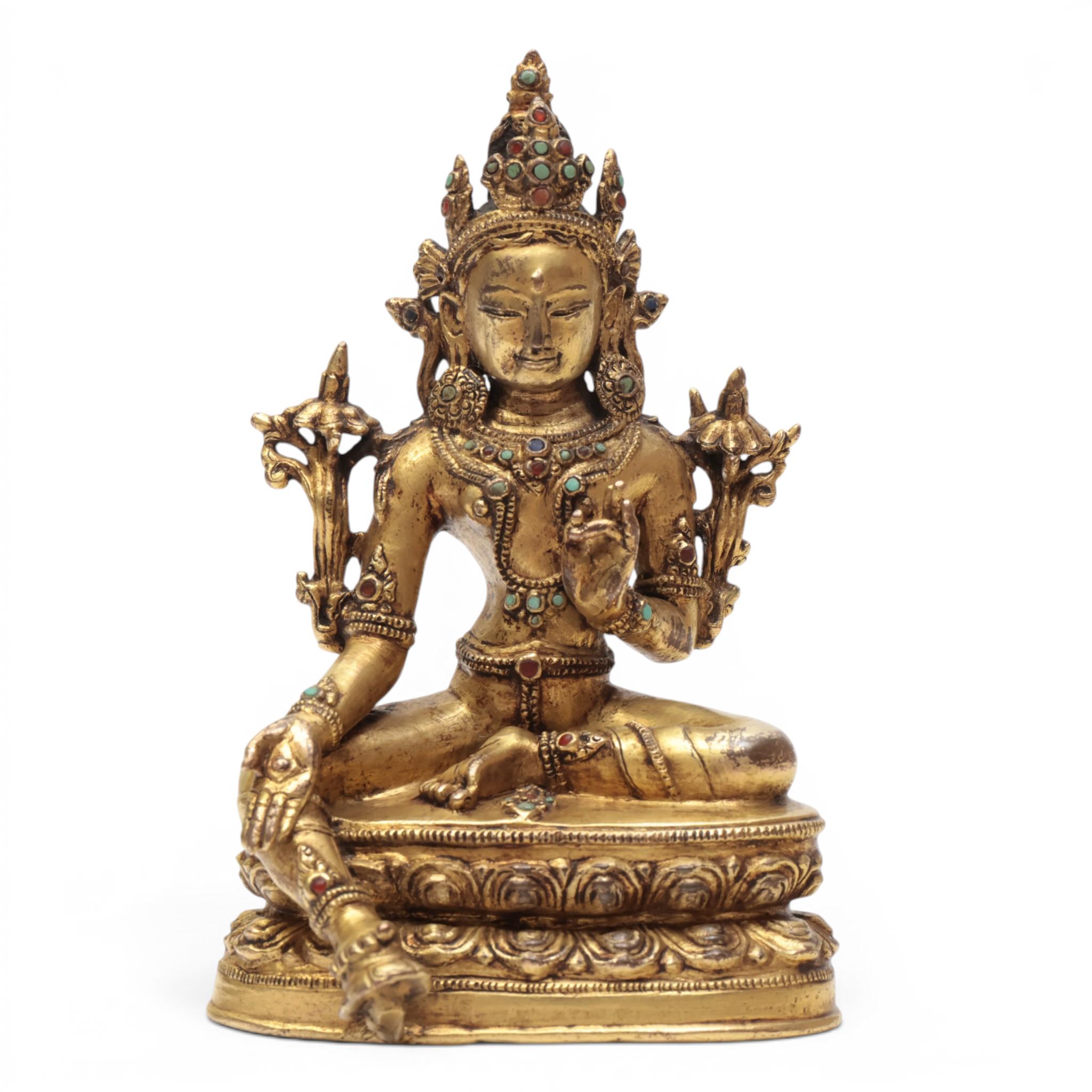 seated in lalitasana on a lotus throne, wearing ornate dress inlaid with beads, two lotus stems from the shoulders and high crown