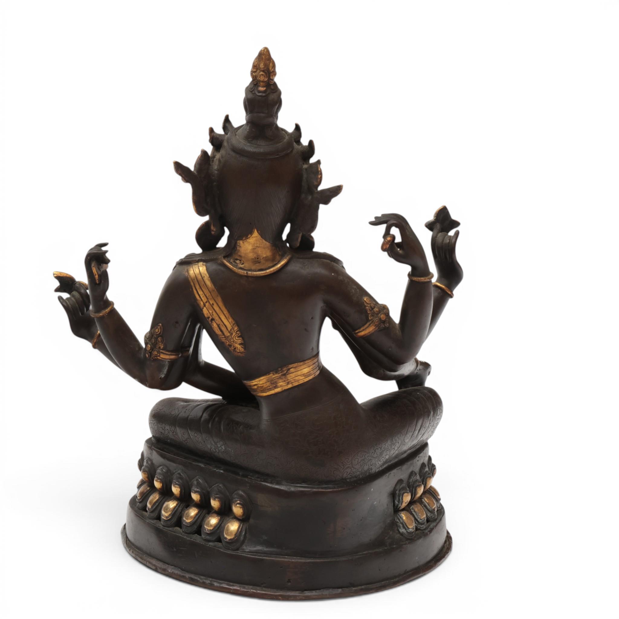 seated on a lotus throne with the main arms in vitarkamudra and the other four radiating holding attributes
