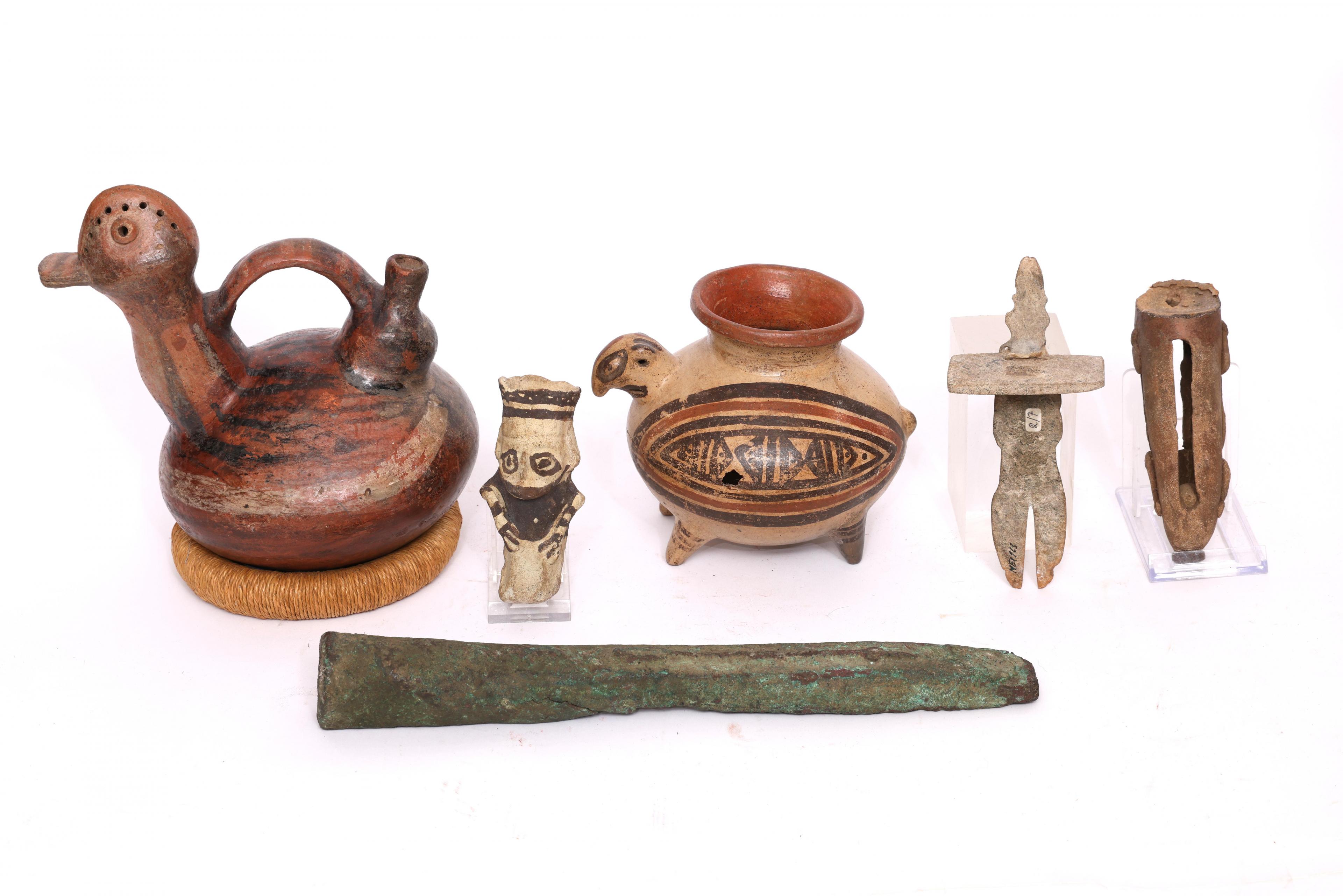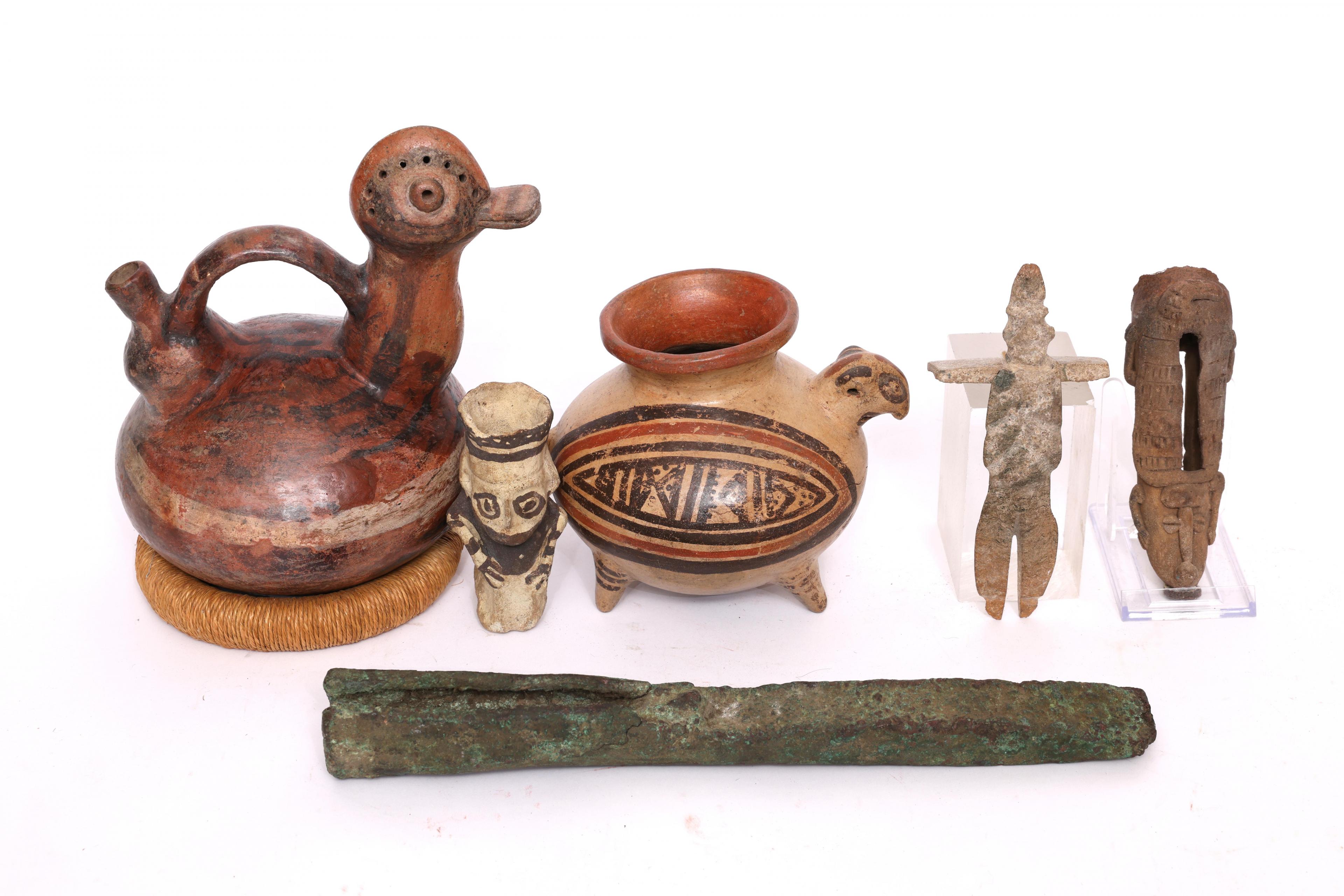 a.o. Chancay, small figure urn, 900 - 1200 AD and a stone Guerero slab figure with a bound stone rectangular with modern rope and a large metal implement.