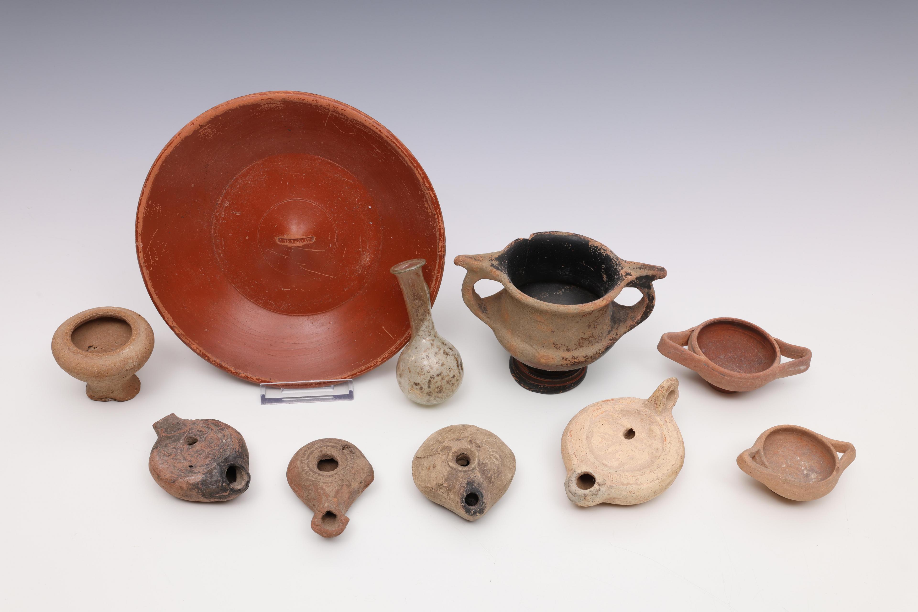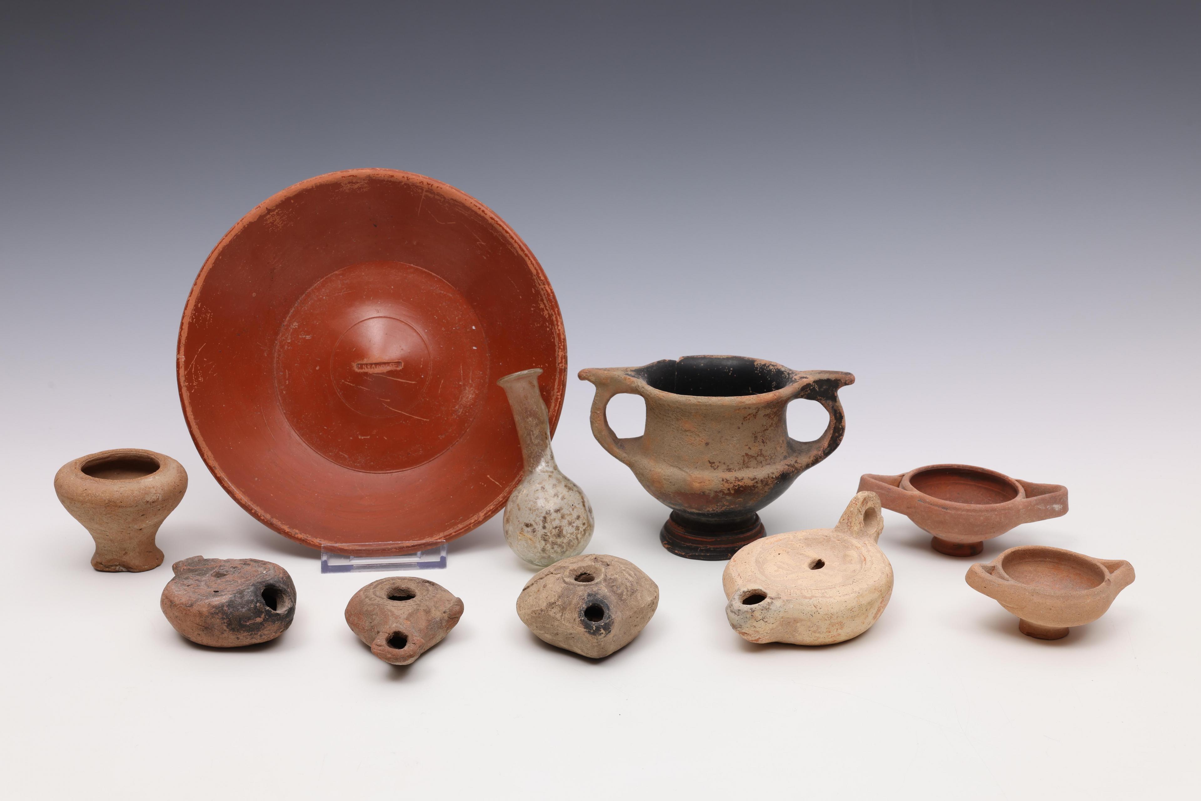 A Roman terra sigilata dish, three Roman oillamps, a glass bottle and two terracotta cups, ca. 2nd century CE.