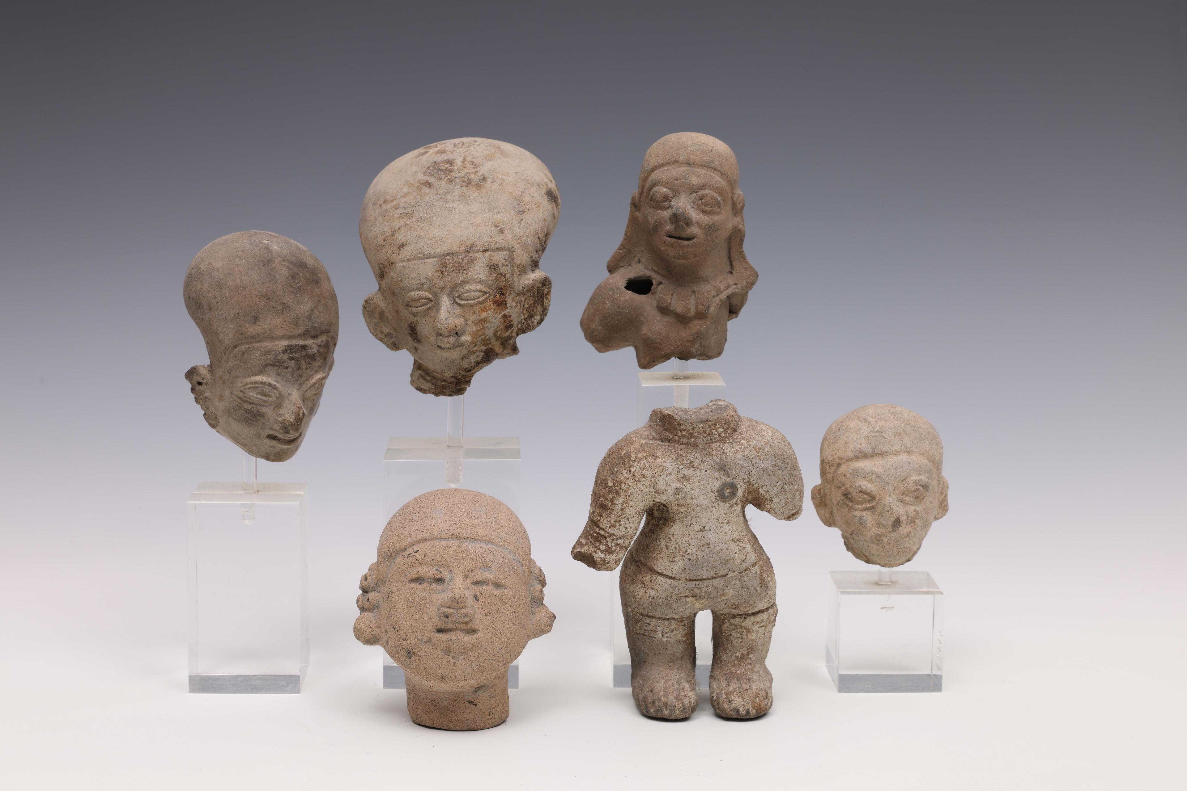 Ecuador, collection of five Tumaco La Tolita terracotta heads and one headless figure, 400 BCE - 100 CE;
