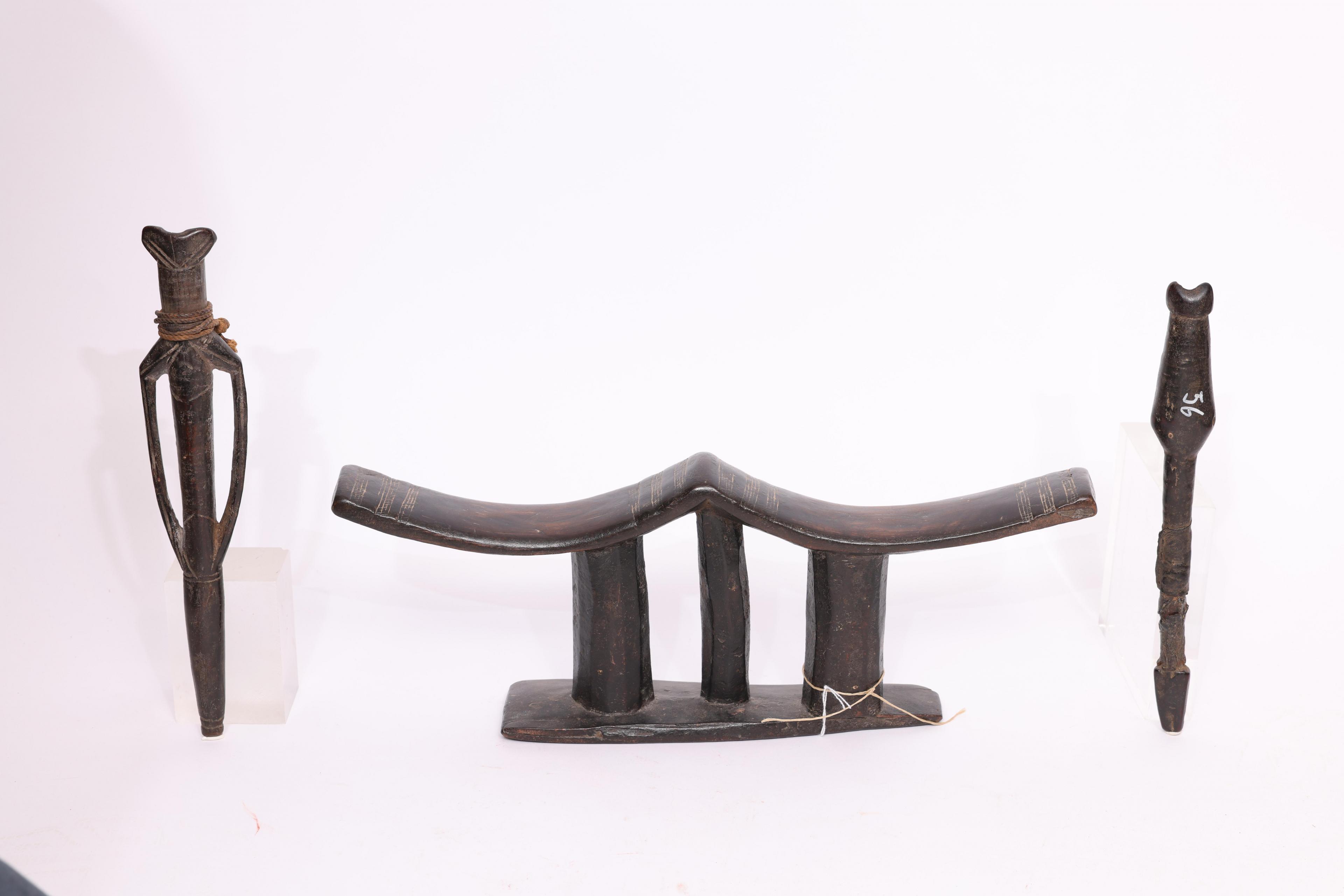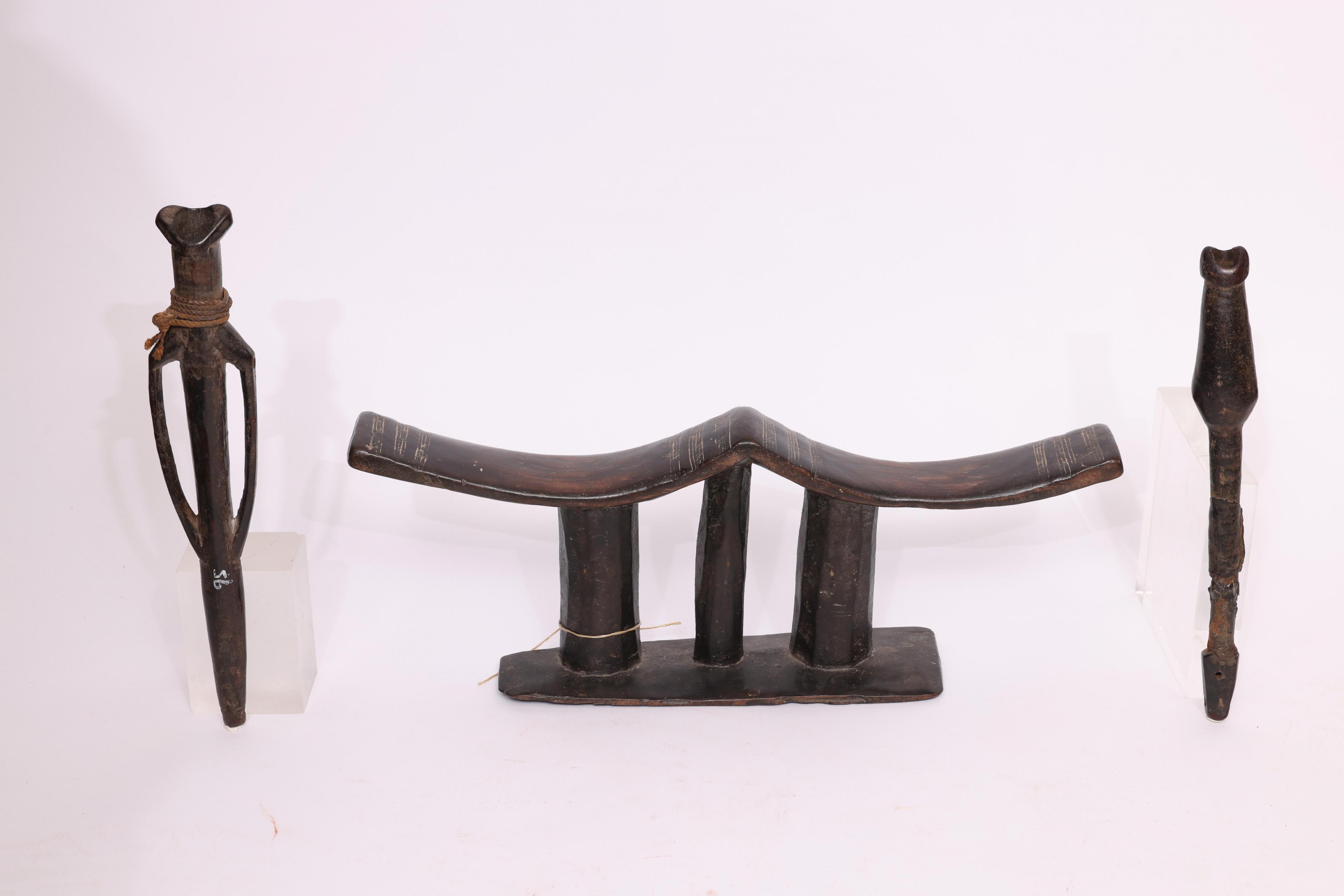 D.R. Congo, Kuba, neckrest and Burkina Faso, Mossi, two wooden whistles.