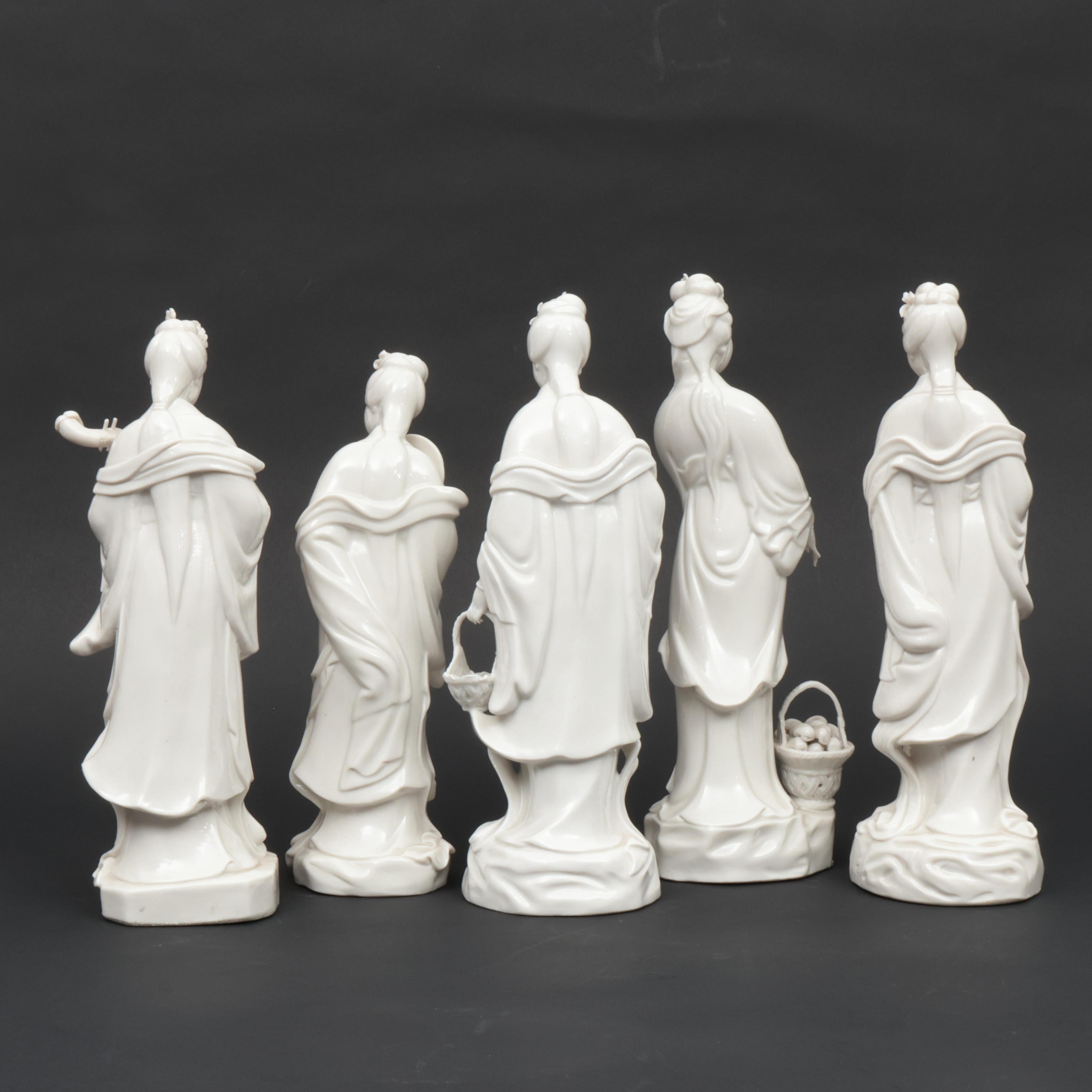 China, five white-glazes figures of elegant ladies, 20th century,