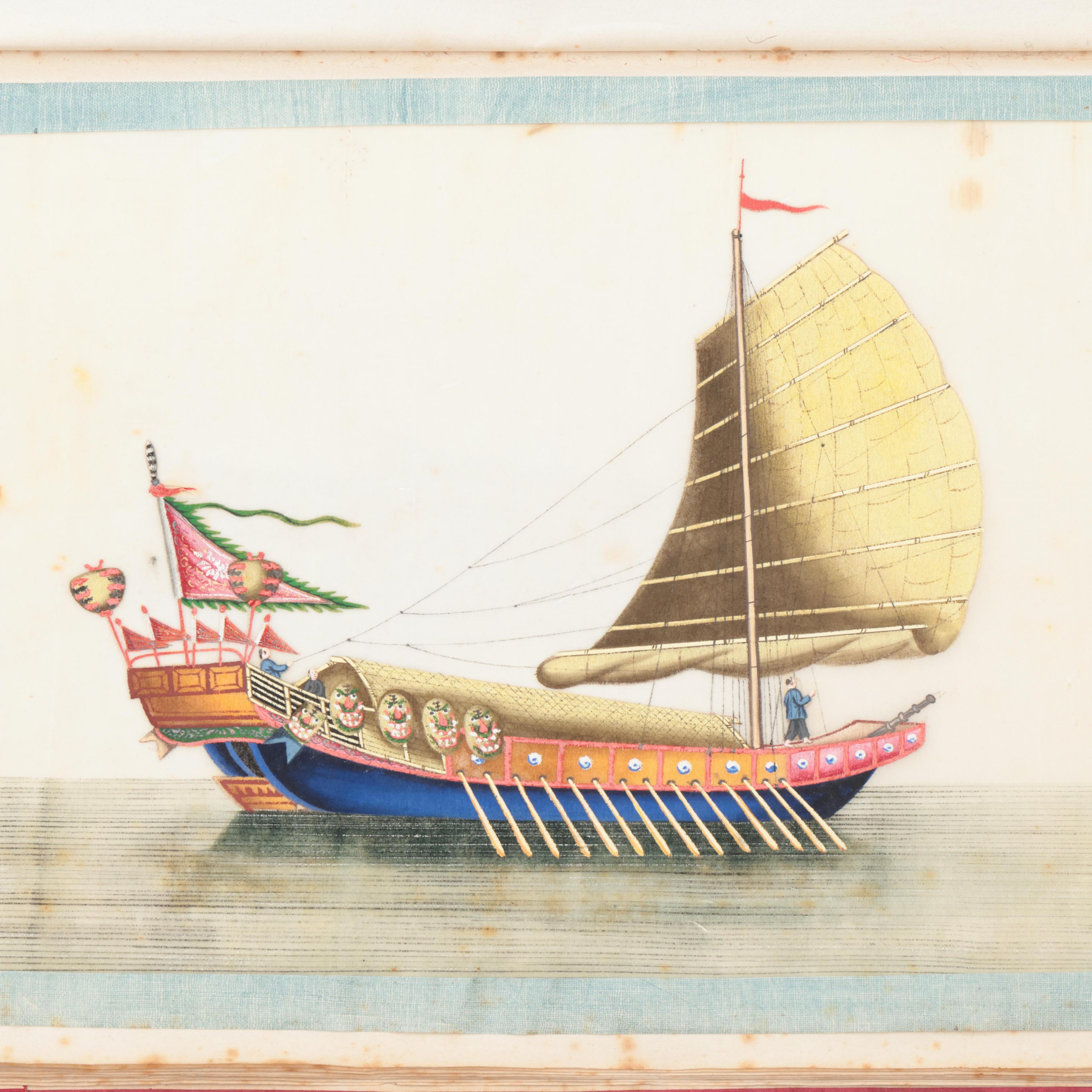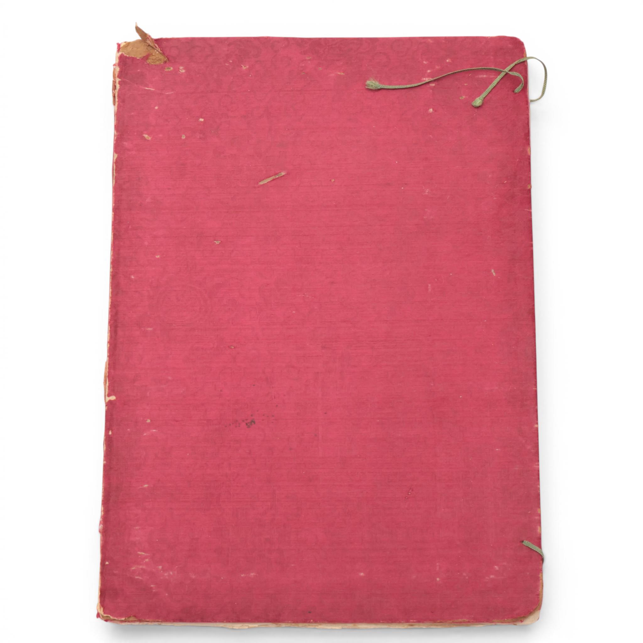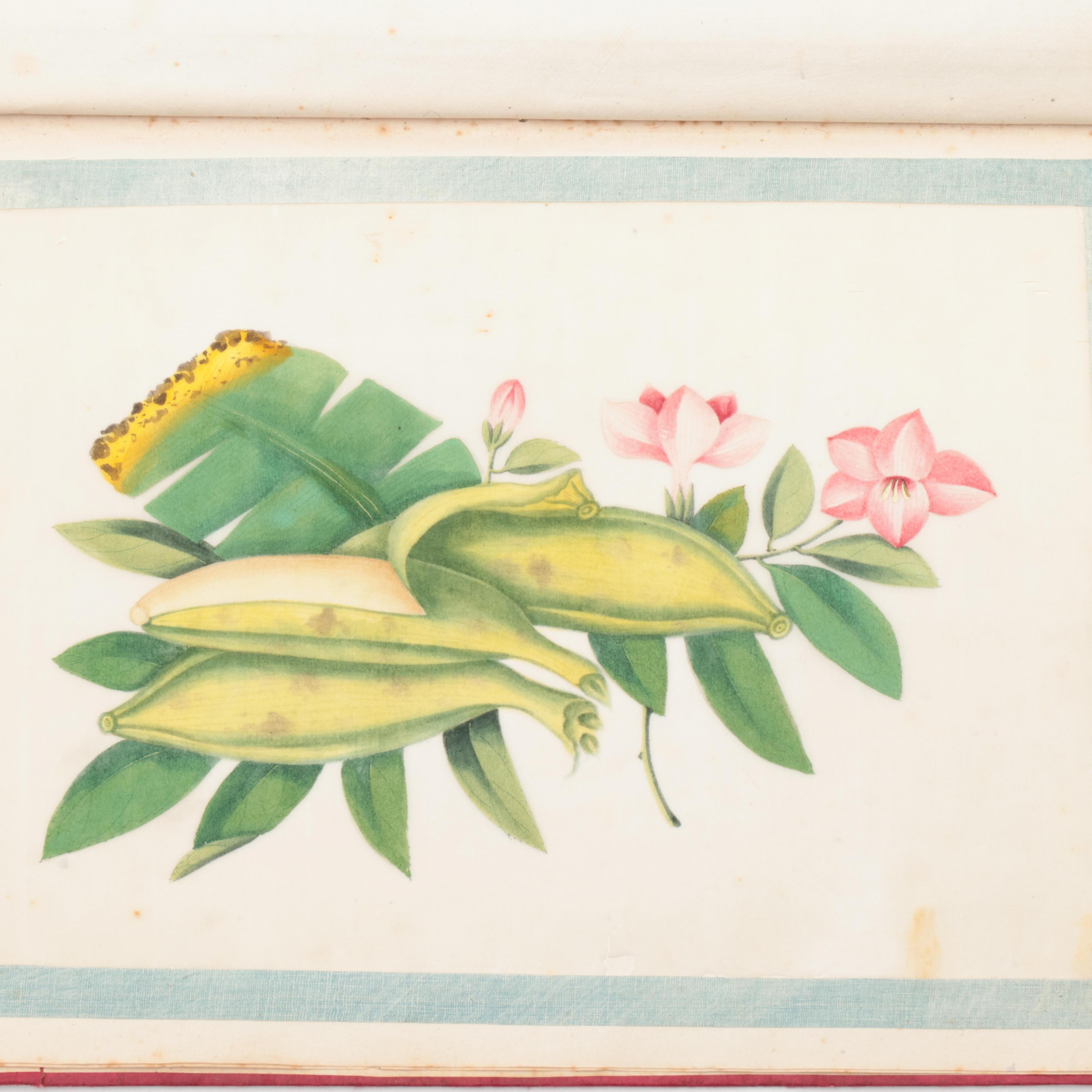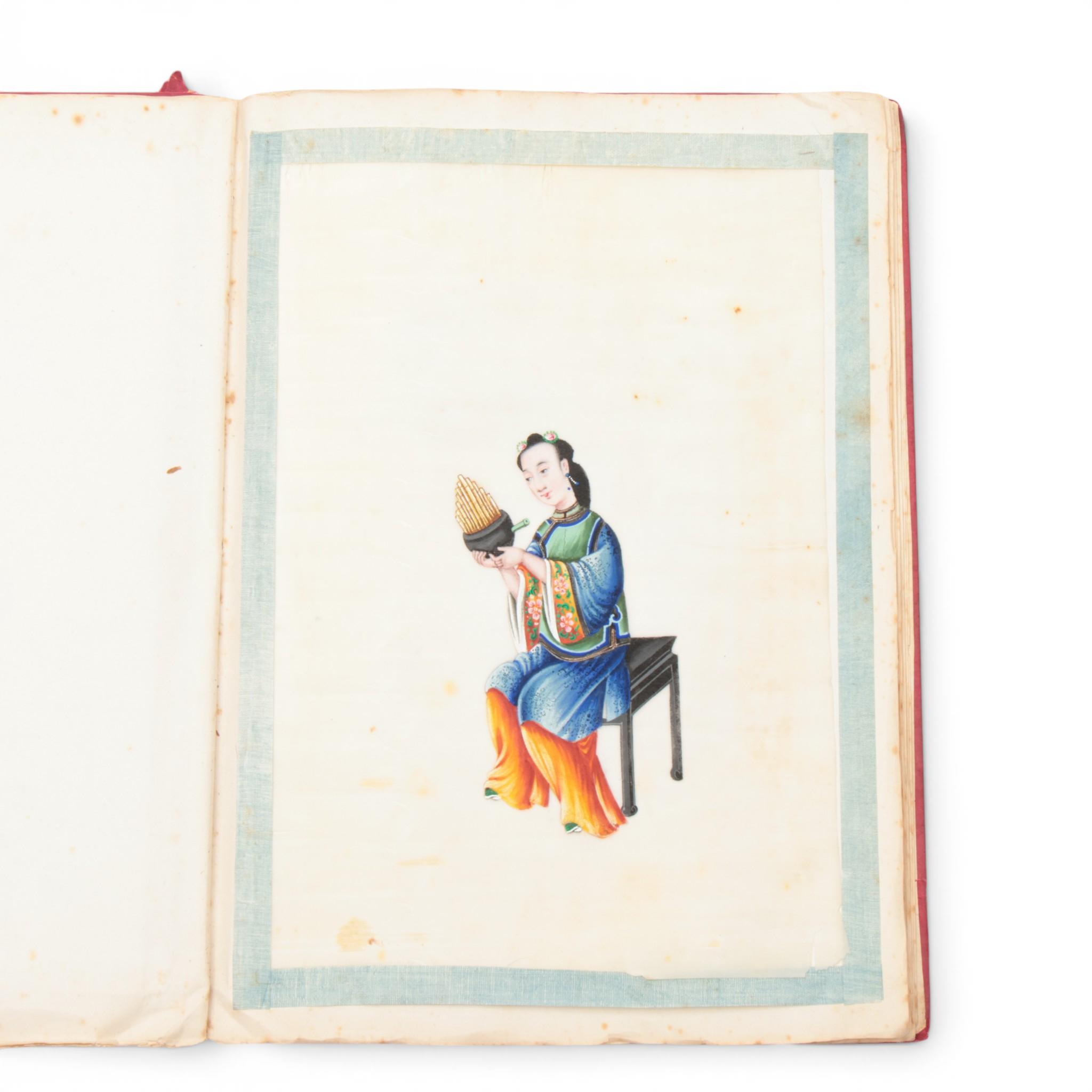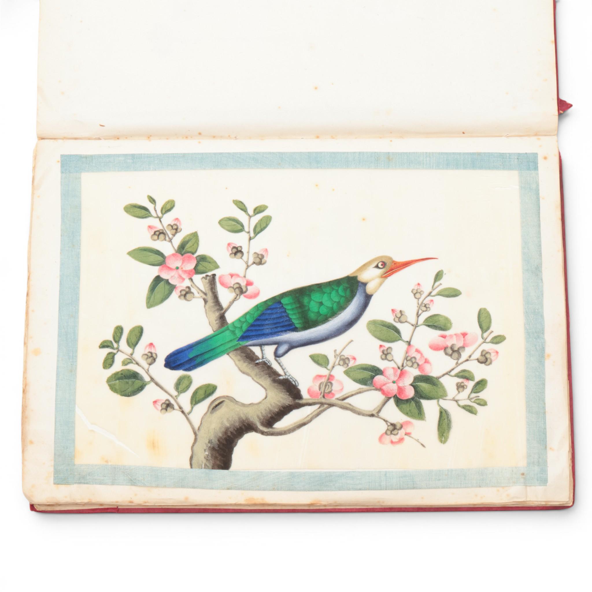 depicting flowers, birds, fish, ships, professions and various ethnic groups, bound in a red silk brocade album (staining and wear as expected)