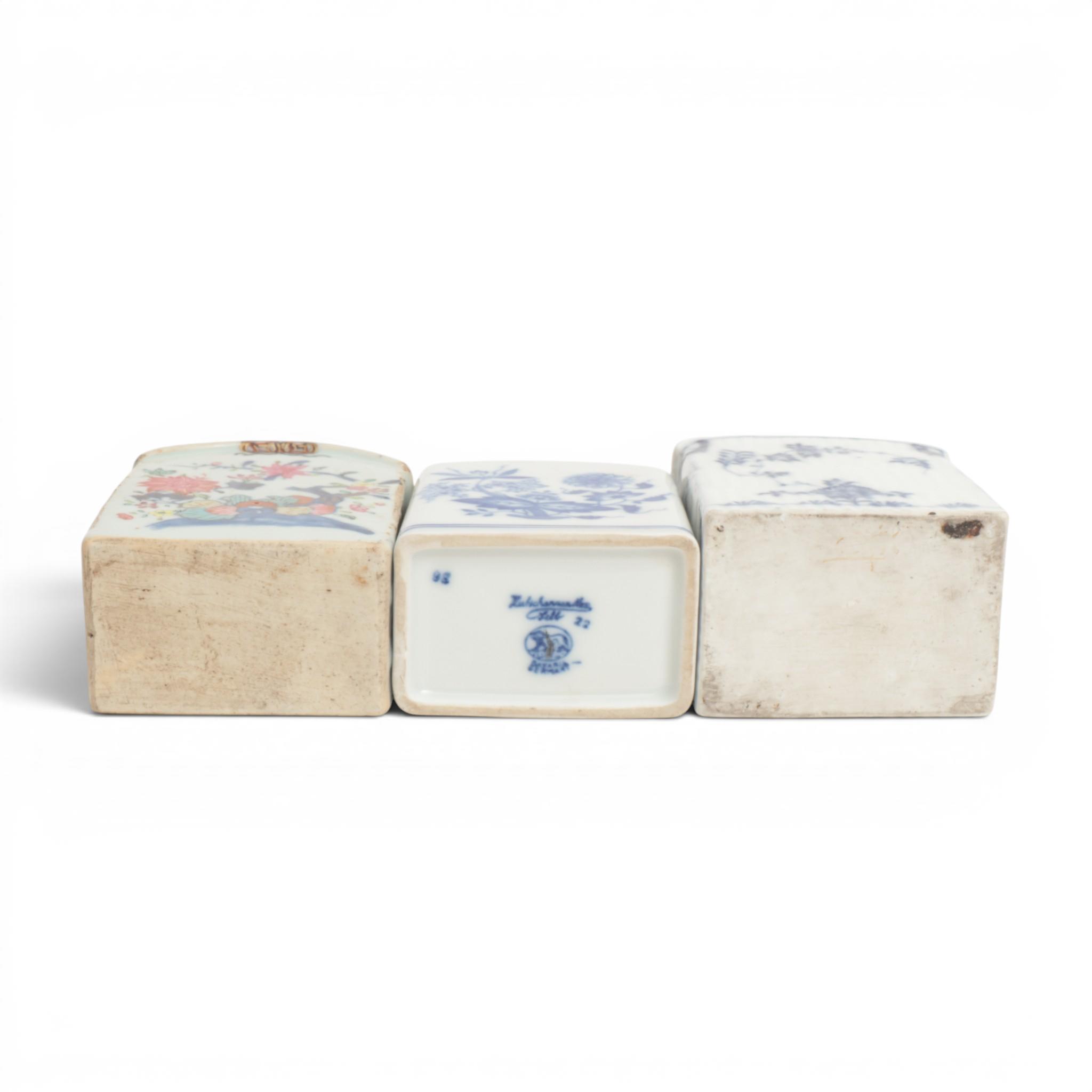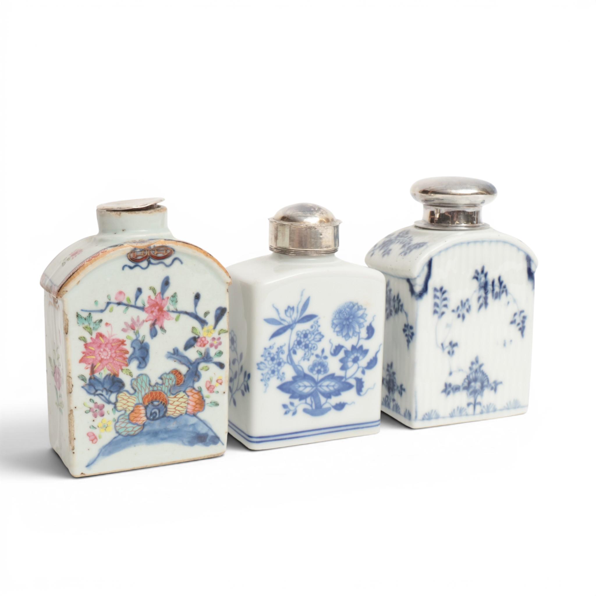 one floral in blue and white and the other famille rose with tobacco leaves, together with a Hutschenreuter tea-caddy and silver cover (some wear and small damages)