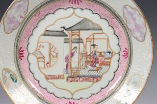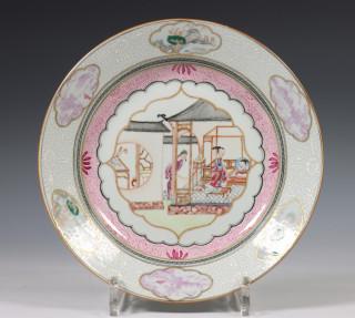 het famille rose bord gedecoreerd met een dame in aan paviljoen, het wapenbord met een familiewapen omgeven door speerpuntranden (restauraties)