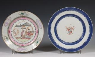 China, famille rose porcelain plate and blue and white porcelain armorial plate, Qianlong, the famille rose plate decorated with a lady in a pavilion, the armorial plate with a coat-of-arms surrounded by spearhead borders (restorations)
