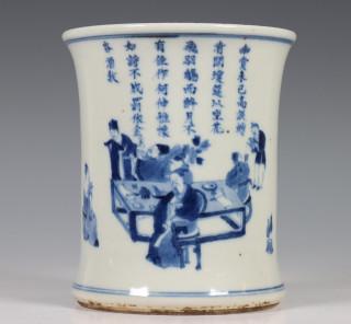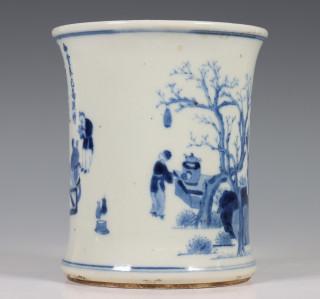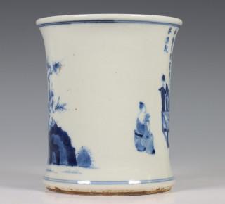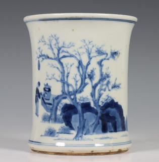China, a blue and white porcelain brush pot, 20th century, decorated in 17th century style with scholars on a table in a landscape, with apocryphal Kangxi mark