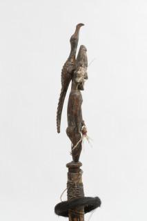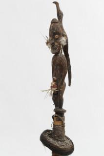 with carved wooden ancestral figure as a stopper, with a bird on its back, and the large bambo flute with bound rattan with to disc shapes decorated with Casuaris feathers. Private collection Amsterdam. (tail with small restauration)