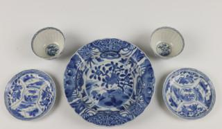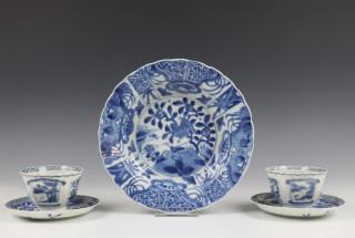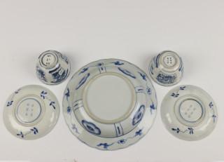 Blauw-wit porseleinen klapmutskom in Wanli stijl en Japan, paar kop en schotels